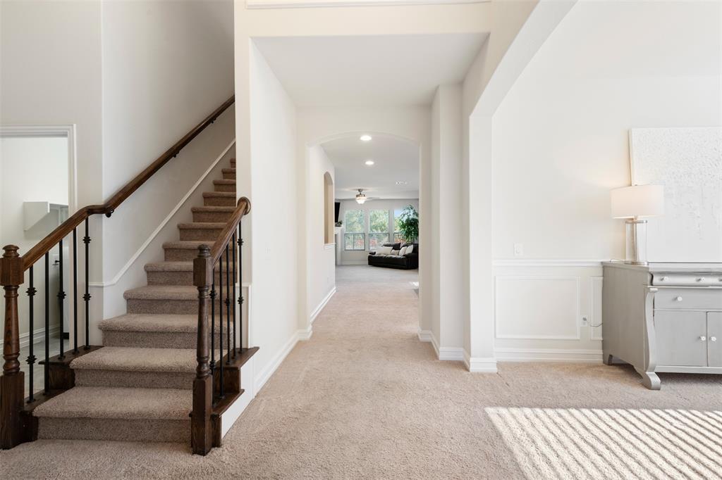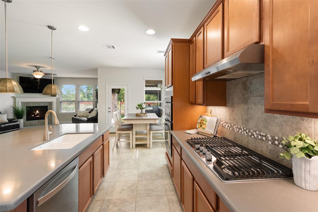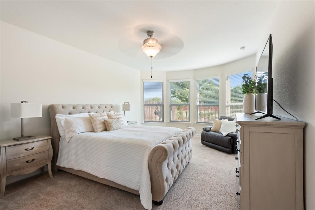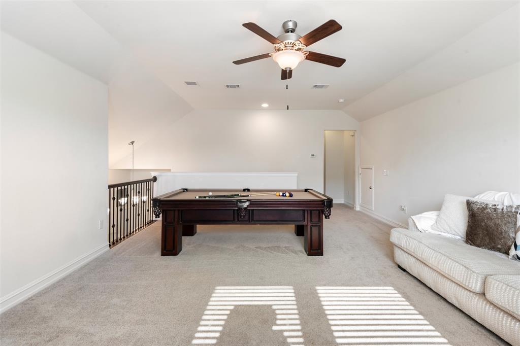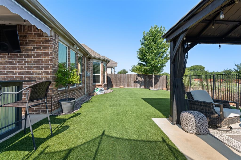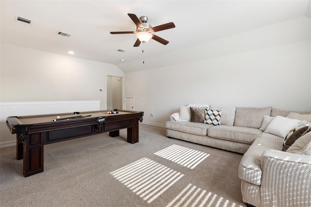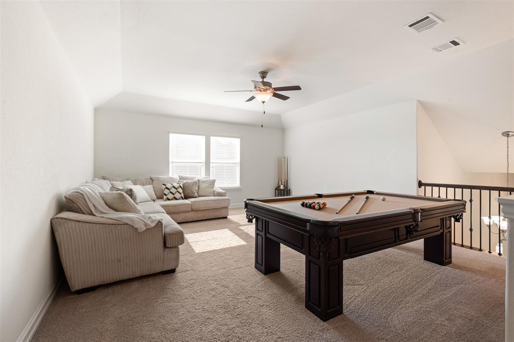 This charming, one-owner home sits on a 50ft lot, backs up to a greenspace, has a 3 car tandem garage and is just a street away from the community pool. The tight-knit Carnegie Ridge neighborhood offers low HOA dues and is zoned for all A-rated schools (according to Niche.com). Upon entering, you'll be greeted with an abundance of natural light! The kitchen boasts a 5 burner gas stovetop, massive center island with pendant lights, granite countertops and stainless steel appliances. The private, primary bedroom is tucked away off the living room and features dual vanities, a garden tub, oversized shower and enormous walk-in closet. This 3 bedroom home has one secondary bedroom downstairs and another upstairs; both with a full bath. The backyard is a dream with a pergola, low-maintenance turf, outdoor kitchen with a grill, mini fridge & roll-down shades. Govee under-eave, permanent lighting elevates the exterior and can easily be controlled from a phone. The location can’t be beat with easy access to US HWY 377, FM 407, I-35, FM 1171, & TX 114, plus shopping, dining, and attractions like Texas Motor Speedway and Tanger Outlets. Additionally, Saint Mark's Catholic Church and Medical City ER Argyle are just minutes away and soon a new Tom Thumb grocery store and an HEB will be completed nearby!