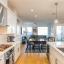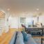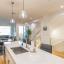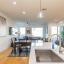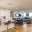 The open-concept main living area is filled with natural light from expansive windows. The chef-inspired kitchen is a true centerpiece with quartz countertops, white shaker cabinets, geometric tile backsplash, stainless steel appliances, gas cooktop, and an oversized waterfall island with seating and pendant lighting.