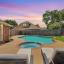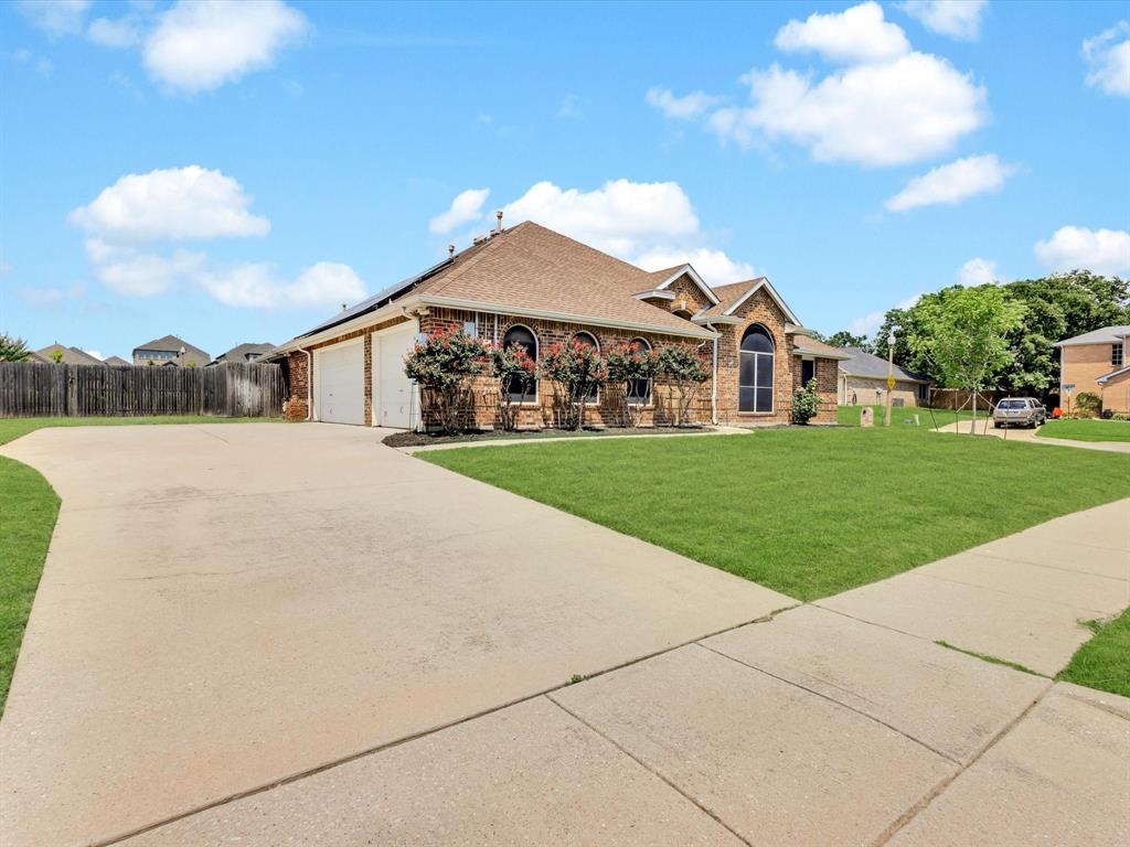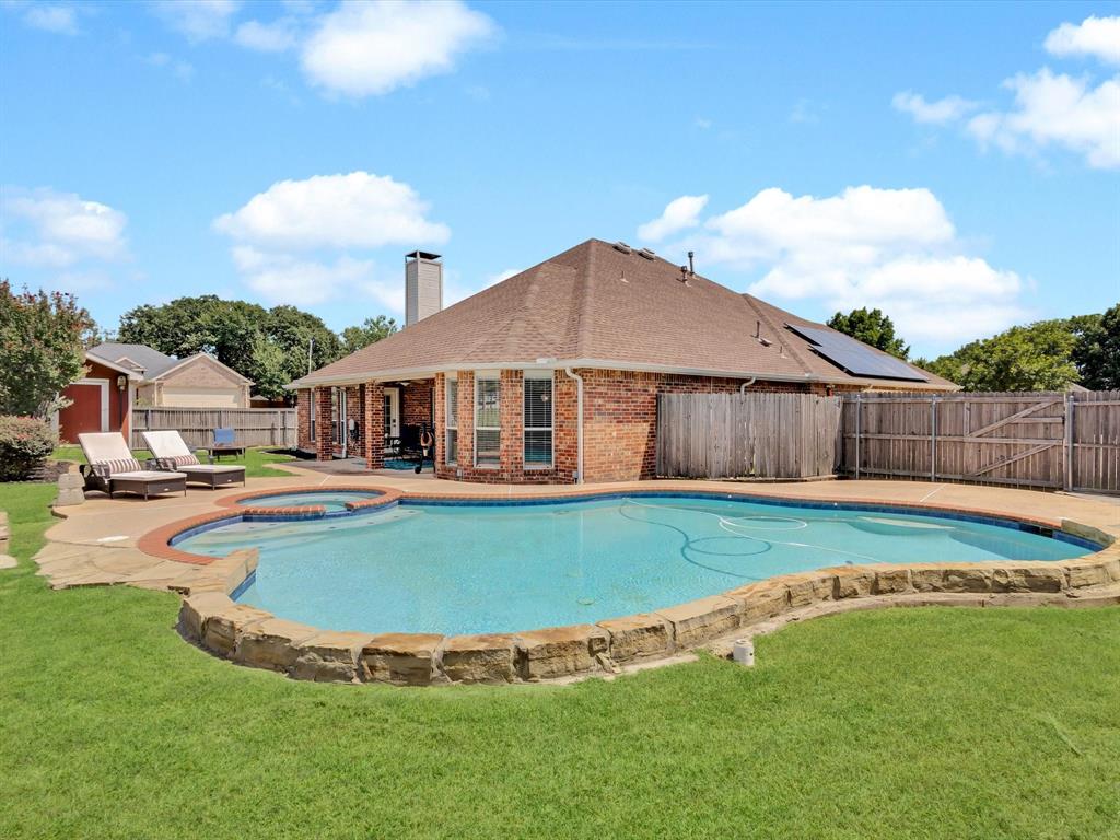 Tucked on an oversized corner lot backing to a serene green space in Denton's Ridgemont, this inviting single story home with a 3-car garage and pool is the perfect place to gather, relax, and make memories. From the moment you enter, you're greeted by a light-filled, open-concept layout that effortlessly connects the spacious living room, formal dining area, kitchen, and breakfast nook, ideal for both everyday living and entertaining. The inviting living room features a cozy gas fireplace and a wall of windows that flood the space with natural light. Designed for both everyday cooking and hosting, the gourmet kitchen showcases a center island, upgraded granite countertops, a stylish backsplash, stainless steel farm sink, double ovens, and abundant storage and prep space. Enjoy casual meals in the breakfast room or host elegant dinner parties in the formal dining space. At the end of the day, retreat to the secluded primary suite with direct access to the pool and a luxurious ensuite bath featuring dual sinks, jetted soaking tub, updated seamless glass shower, and a spacious walk-in closet. Three additional bedrooms share a beautifully appointed full bath with a linen closet, providing comfort and flexibility for family, guests, or a home office setup. Step outside to your personal backyard oasis, complete with a sparkling heated pool and spa, covered patio perfect for relaxing or entertaining, and a convenient storage shed. Plus, enjoy the long-term benefits of the paid off solar panels that help keep utility bills low year-round. This home offers the perfect blend of comfort, style, and sustainability, all in a prime location with easy access to 35E.