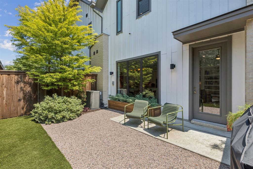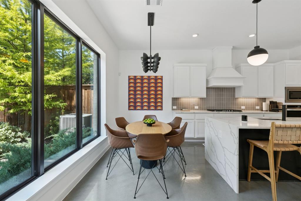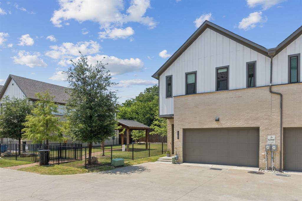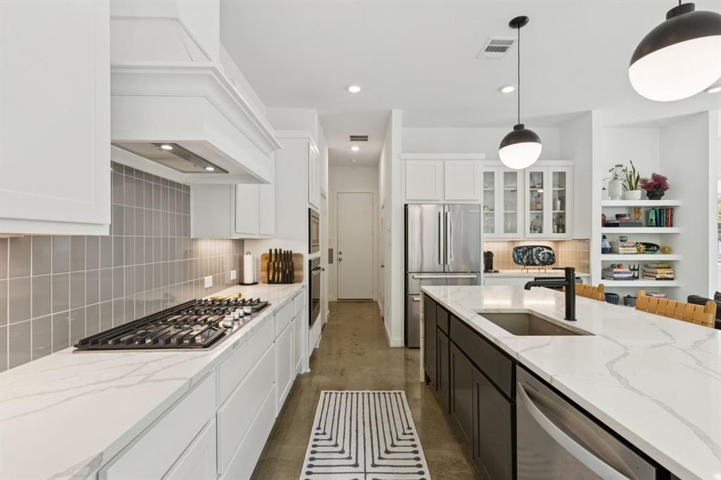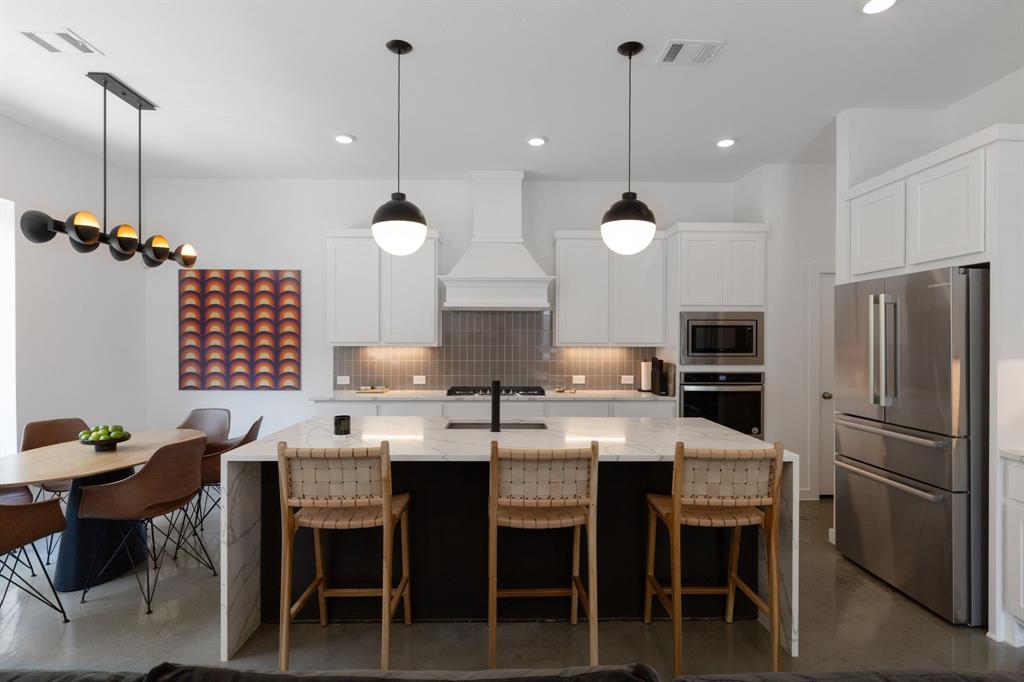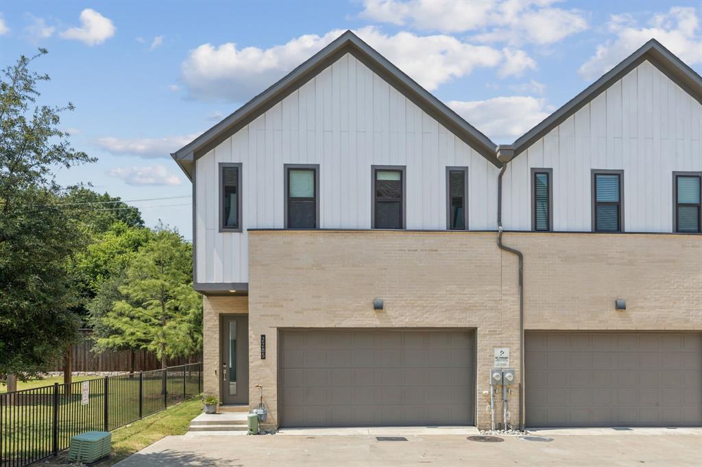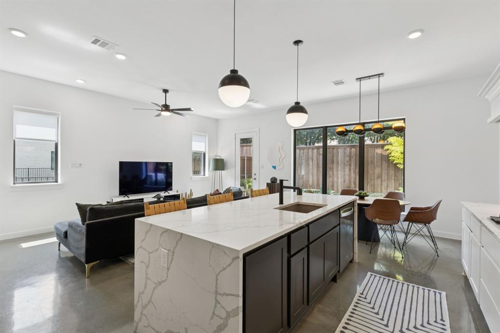 Welcome to 2285 Rook Drive — a stunning two level, end-unit townhome that perfectly fuses modern design with low-maintenance living near Stevens Park Village in Far North Oak Cliff. This 3 bedroom, 2.5 bathroom residence is a true standout, offering an open, airy layout filled with natural light, soaring vaulted ceilings, and high-end finishes throughout. Inside, you are immediately greeted by polished concrete floors that bring both sleek style and durability to the main living space. The open-concept layout flows seamlessly into the gourmet kitchen, where a striking Calacatta Laza quartz waterfall island serves as both a focal point and a functional space for dining or entertaining. A Bosch 800-series refrigerator, glass-fronted cabinets with under-mount lighting and a dual-zone wine fridge make this kitchen as practical as it is beautiful.
