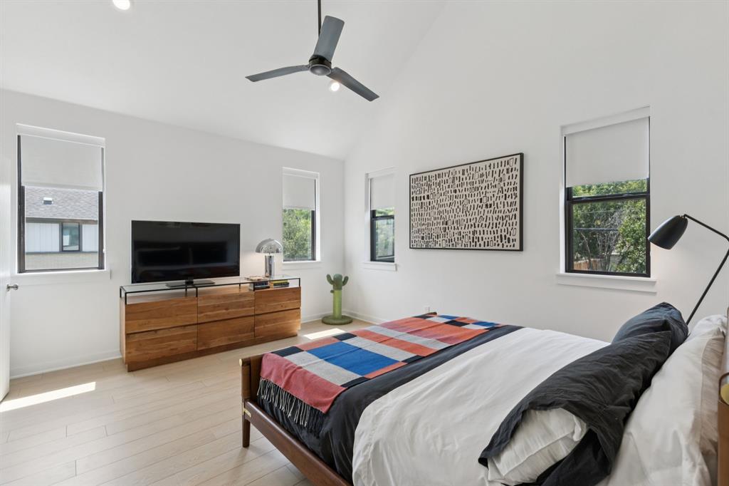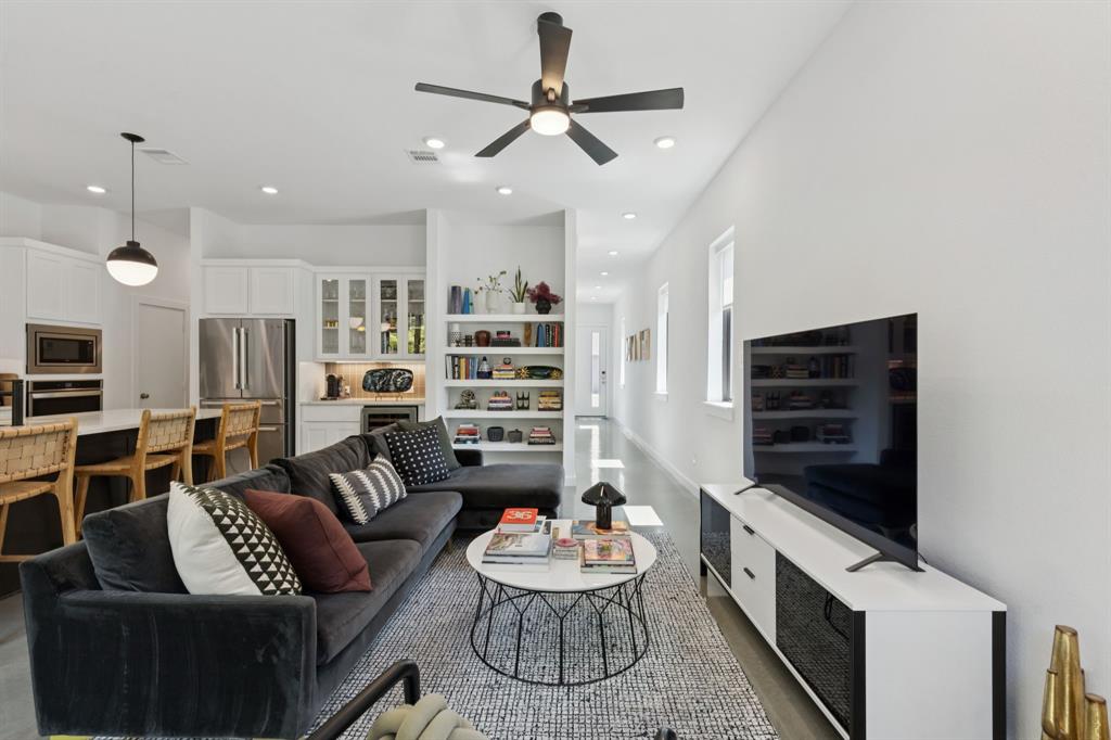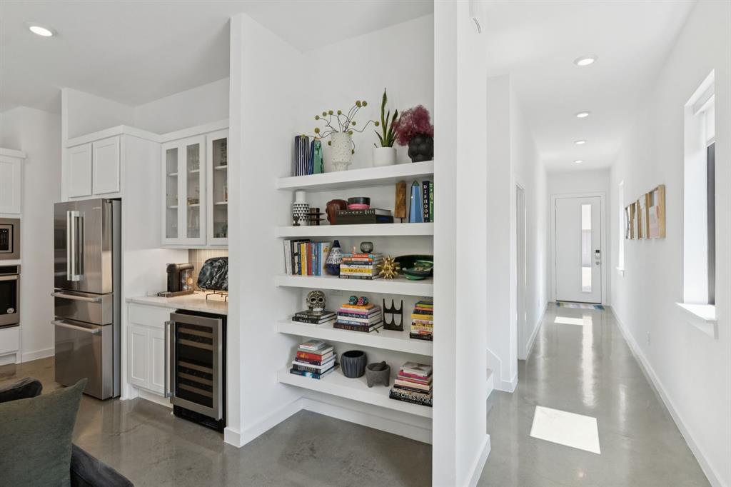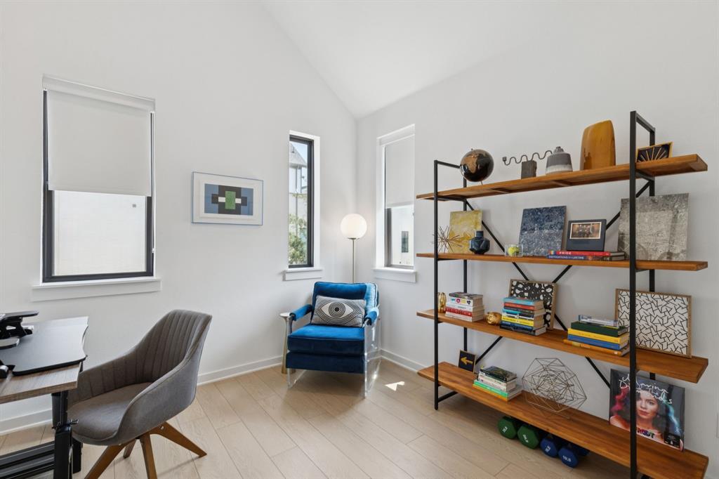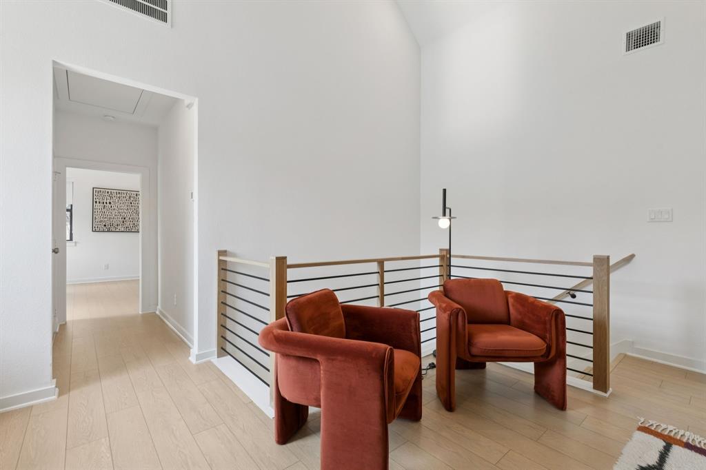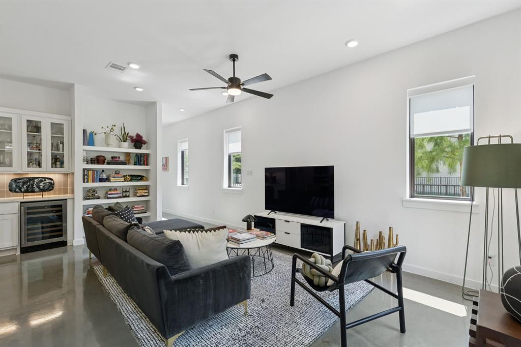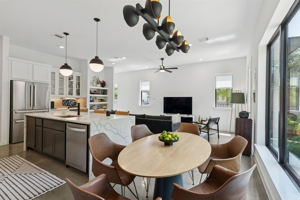 Welcome to 2285 Rook Drive — a stunning two level, end-unit townhome that perfectly fuses modern design with low-maintenance living near Stevens Park Village in Far North Oak Cliff. This 3 bedroom, 2.5 bathroom residence is a true standout, offering an open, airy layout filled with natural light, soaring vaulted ceilings, and high-end finishes throughout. Inside, you are immediately greeted by polished concrete floors that bring both sleek style and durability to the main living space. The open-concept layout flows seamlessly into the gourmet kitchen, where a striking Calacatta Laza quartz waterfall island serves as both a focal point and a functional space for dining or entertaining. A Bosch 800-series refrigerator, glass-fronted cabinets with under-mount lighting and a dual-zone wine fridge make this kitchen as practical as it is beautiful.