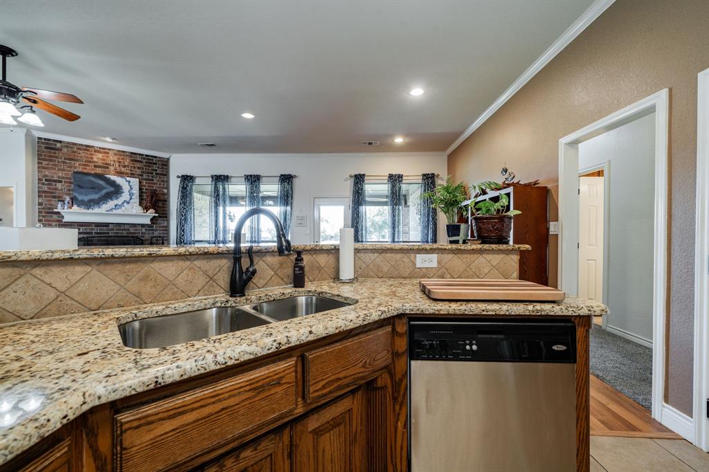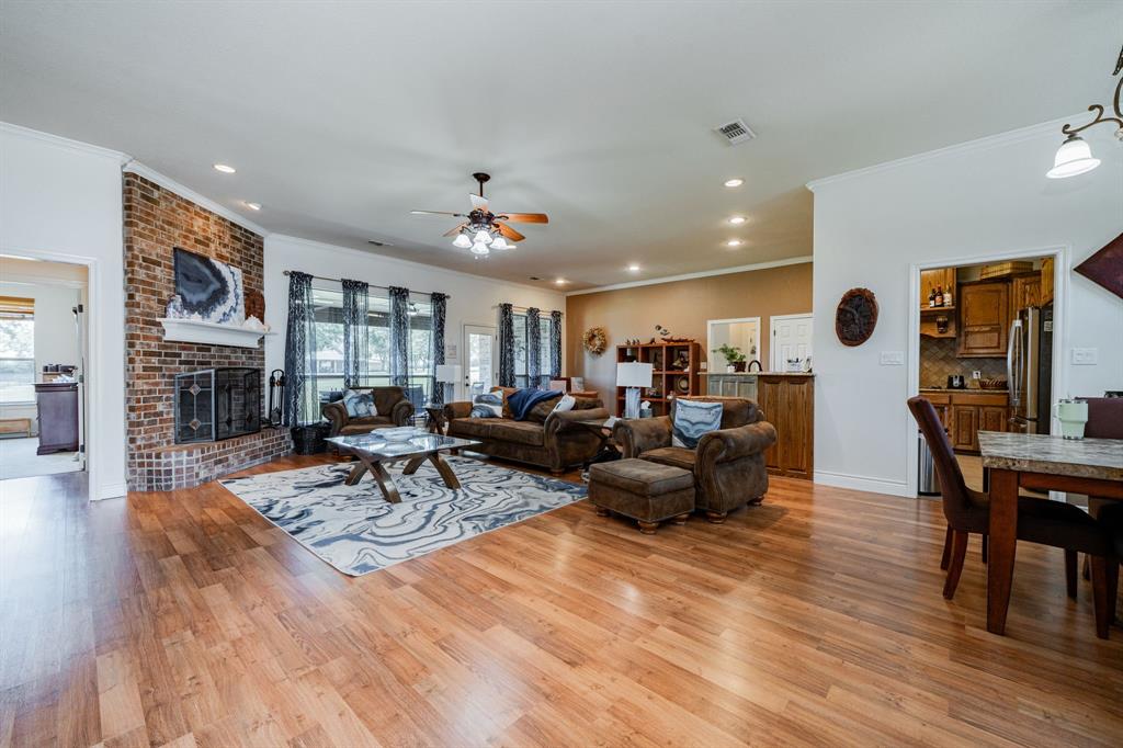 BEAUTIFUL STONE AND BRICK HOME on the par 3, 14th hole of the main Pecan golf course! Home has very picturesque views of the golf course and nearby pond, as well as regular deer and geese visitors! The home has an 8 ft entry door, and a tremendously open floor plan, with wood floors, a fireplace, and 10 ft ceilings! The kitchen boasts stained cabinets, and granite countertops! All bedrooms have a tray ceiling! The master has a large closet, and looks out on the beautiful setting in back, with sounds of the fountain in the pond echoing throughout the day. There are abundant windows on the back of the house, from which to enjoy the views, as well as crown molding in many rooms! You will love the large 24 x 15 covered back pebble stone patio for relaxing and entertaining! The office can function as a 4th bedroom. Golf cart garage included! New roof, gutters, and exterior paint in '23. AC replaced in '18, water heater in '22. Come and relax, and take in this beautiful setting!