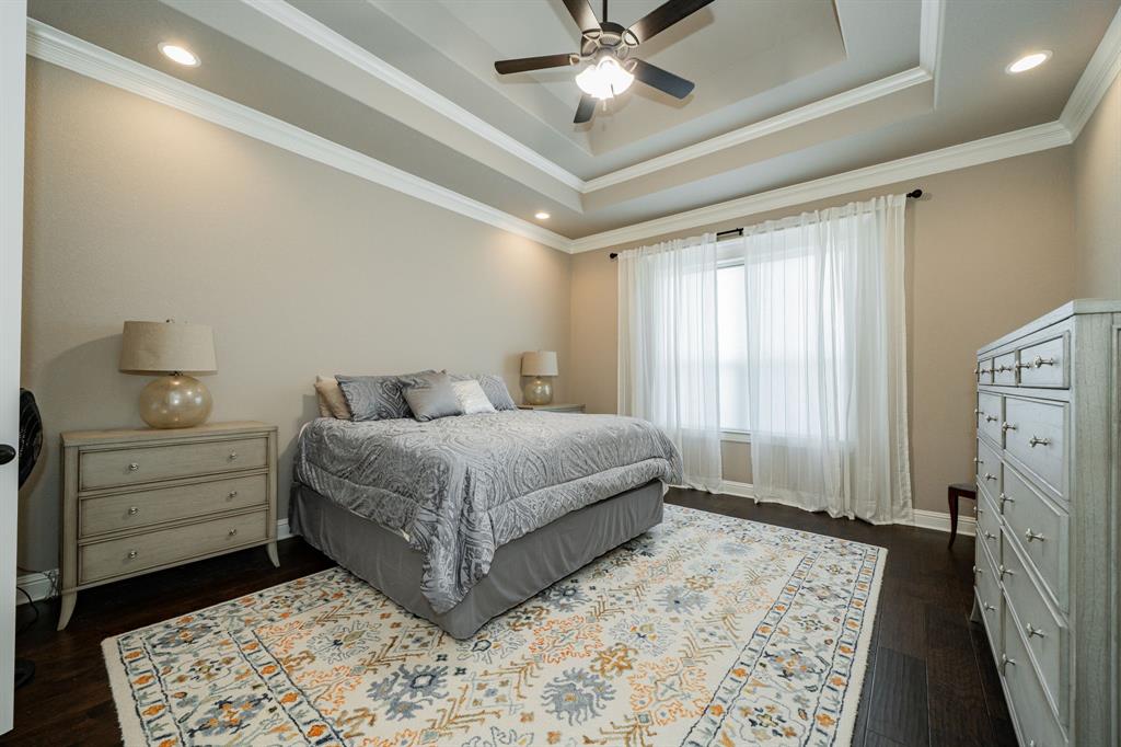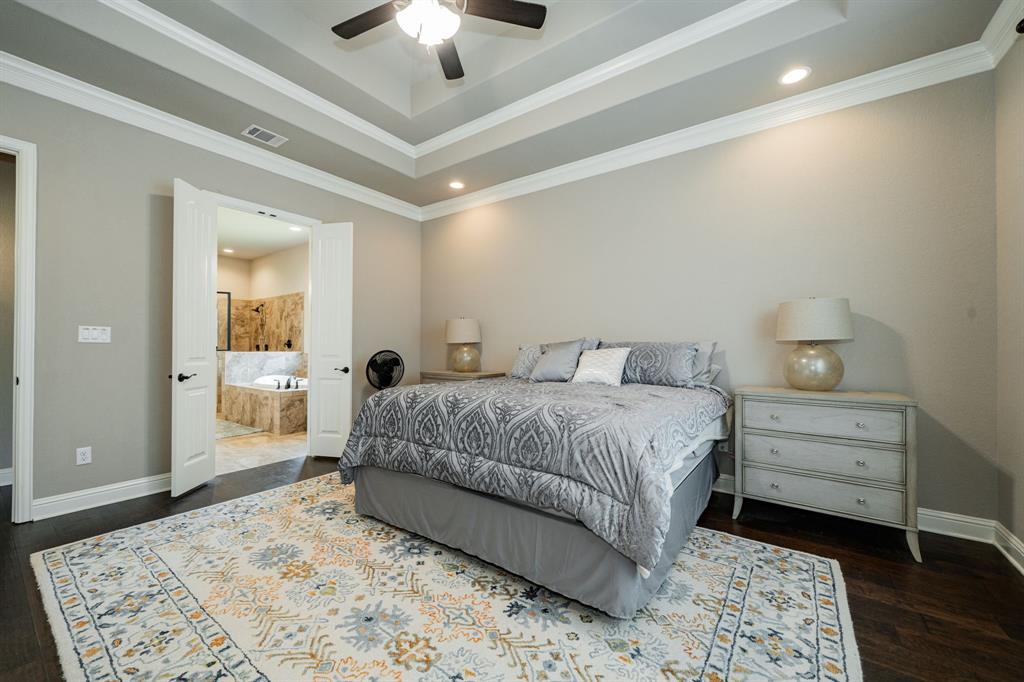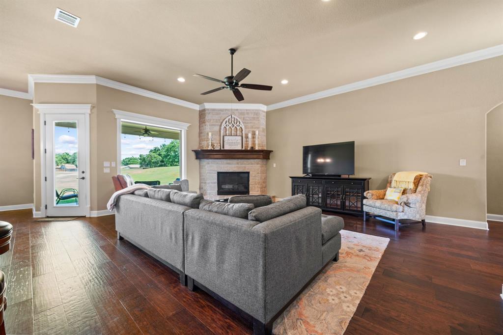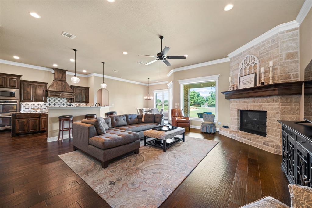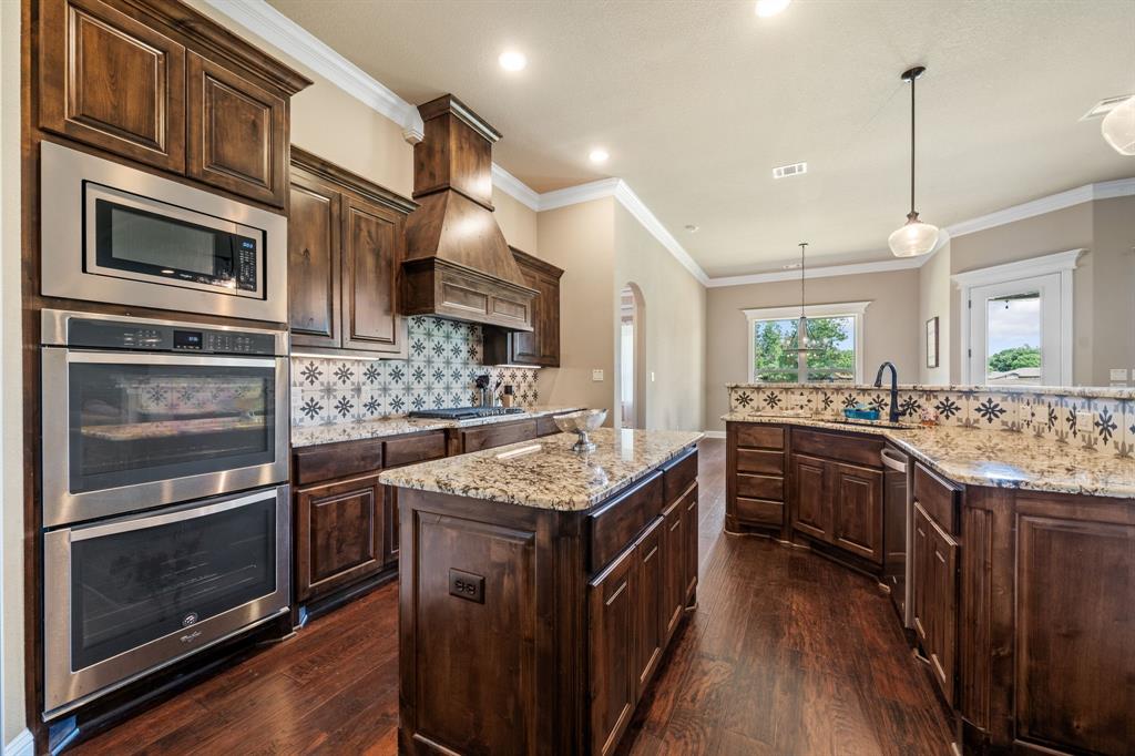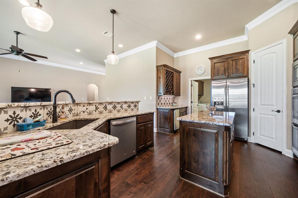 Welcome to The Hideaway at Harbor Lakes, where you will fall in love with this stunning golf course home located on #10 green at the premier Harbor Lakes Golf Club! This 4-bedroom (or 3 & a study) open concept home boasts an inviting atmosphere that will make you feel right at home. As you enter, you will love the beautiful wood floors, elegant double crown molding, stylish granite & backsplash that adorn the space. The highlight of this home is the picturesque view of the golf course that can be enjoyed from the comfort of your living room, kitchen, dining area, and back porch! The open concept floor plan features a large kitchen with granite countertops, quality stained cabinets, and stainless appliances, including a double oven! The ample sized primary suite is a dream come true with its ensuite bath that features a double tray ceiling, separate vanities, a walk-in shower, a garden tub, and a huge walk-in closet that conveniently connects to the oversized utility room. This thoughtfully appointed home is perfect for those who appreciate comfort, elegance, and a touch of luxury. The home also features a gas fireplace, 11 ft ceilings, and an 18 ft garage door! Don't miss out on this amazing opportunity to live in one of the most beautiful homes in The Hideaway at Harbor Lakes.
