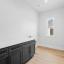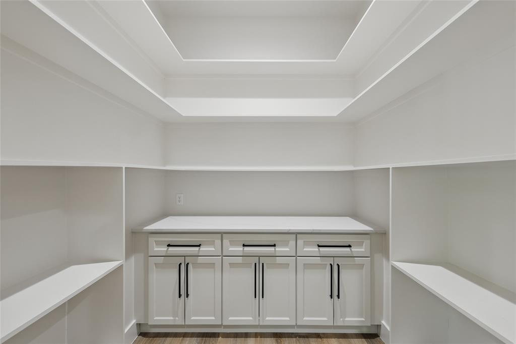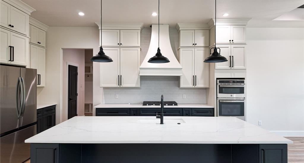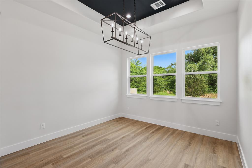 The kitchen is a dream for both home chefs and entertainers alike: featuring contrasting black and white cabinetry, quartz countertops, a massive island, designer lighting, and wall-to-wall custom cabinetry. The dedicated dining area includes a tray ceiling with black accent detail and expansive views of the backyard.