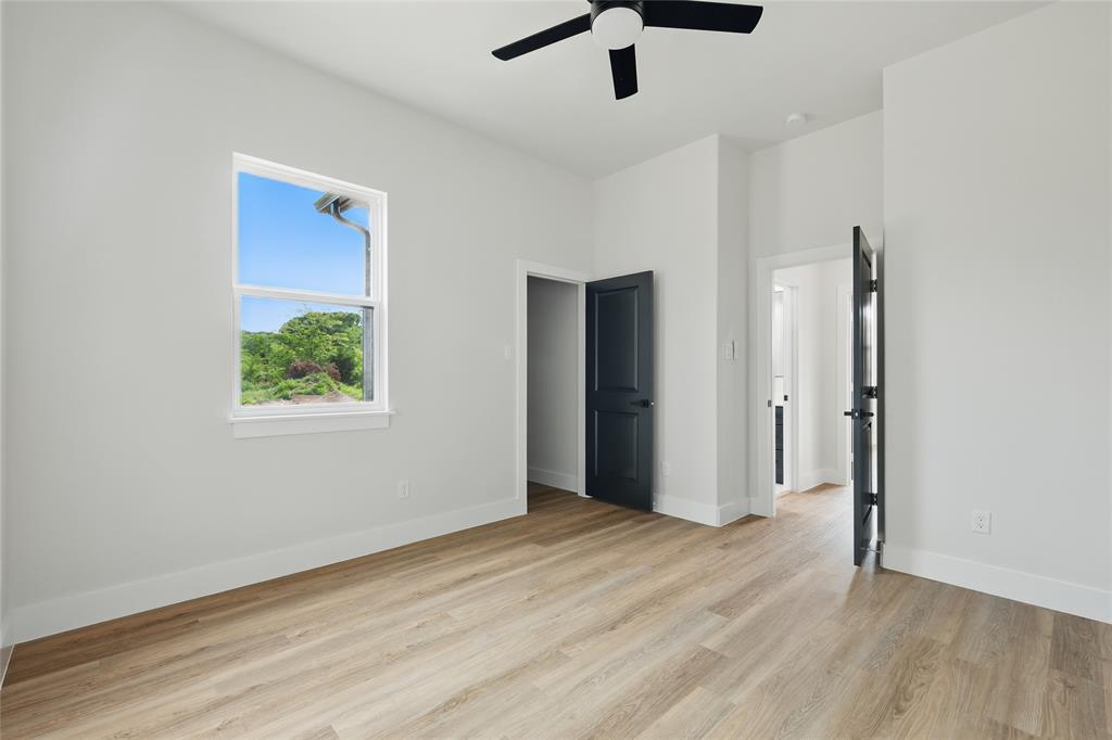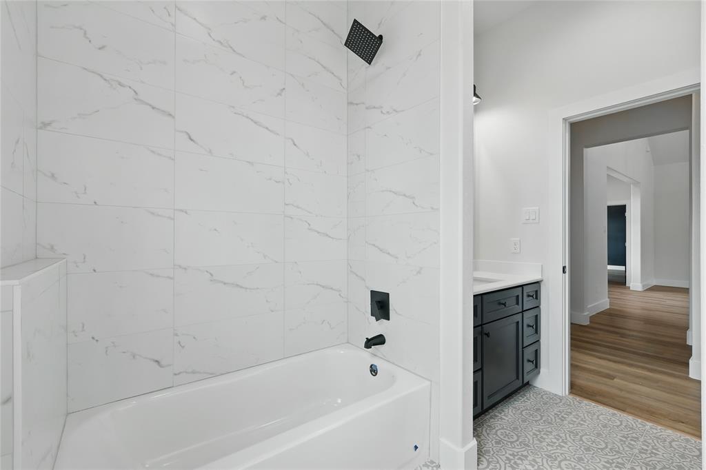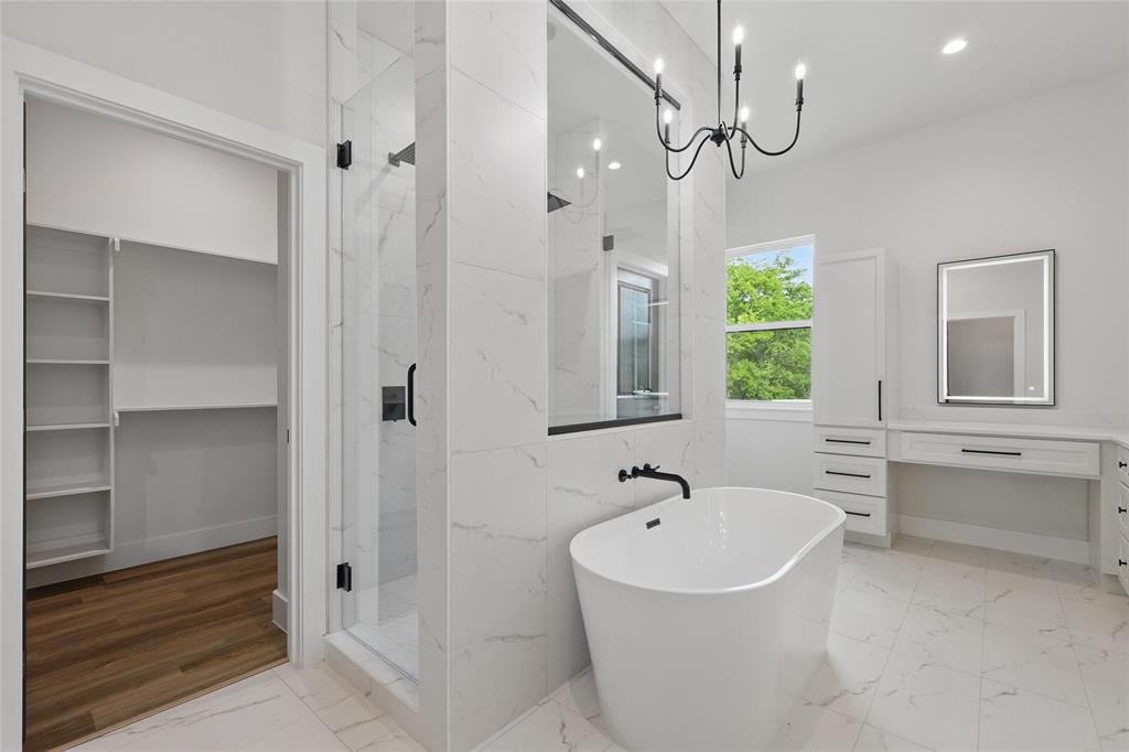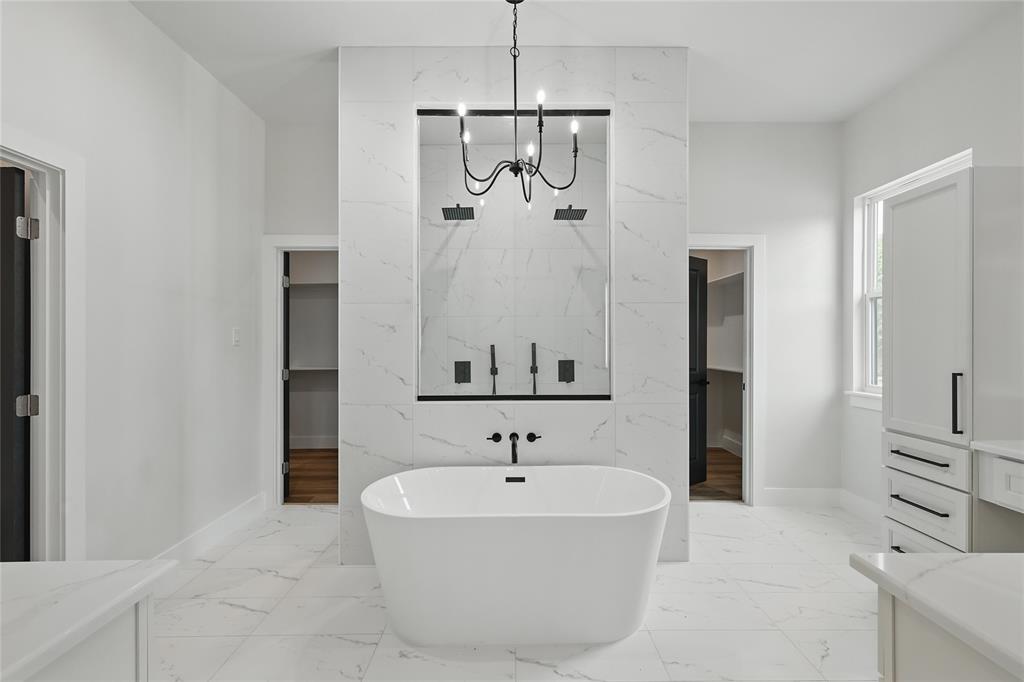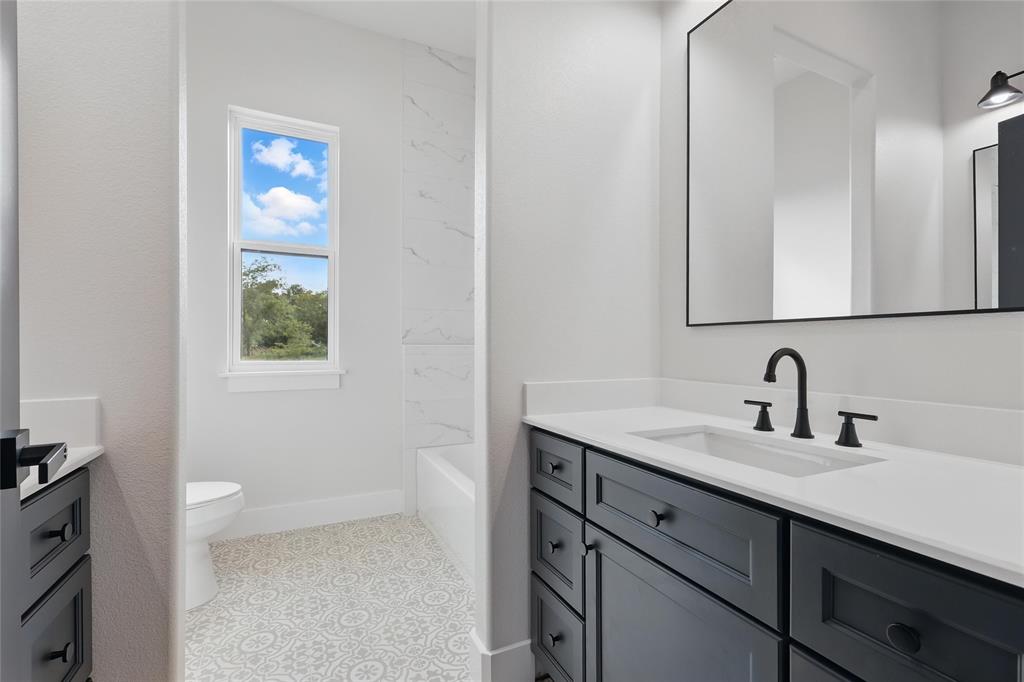 Retreat to the primary suite with oversized windows and a spa-style ensuite offering a frameless walk-in shower, soaking tub, and dual vanities. Secondary bedrooms are generously sized and share a beautifully appointed bathroom with bold tile and black fixtures.