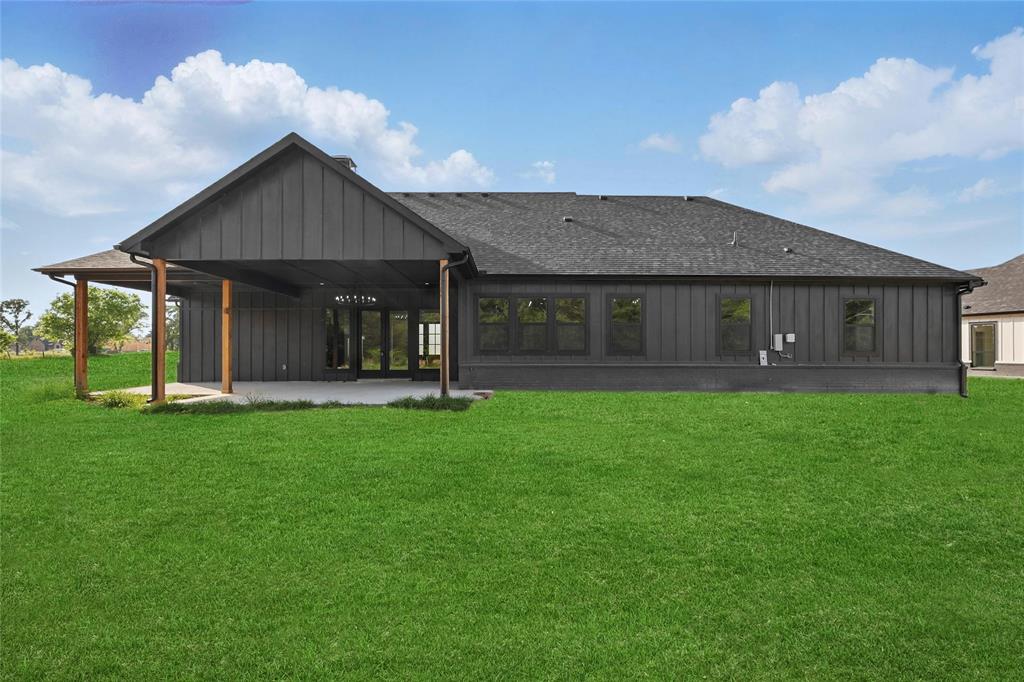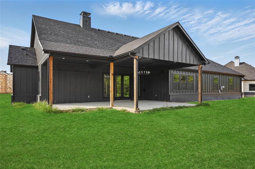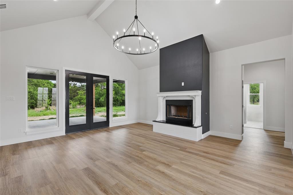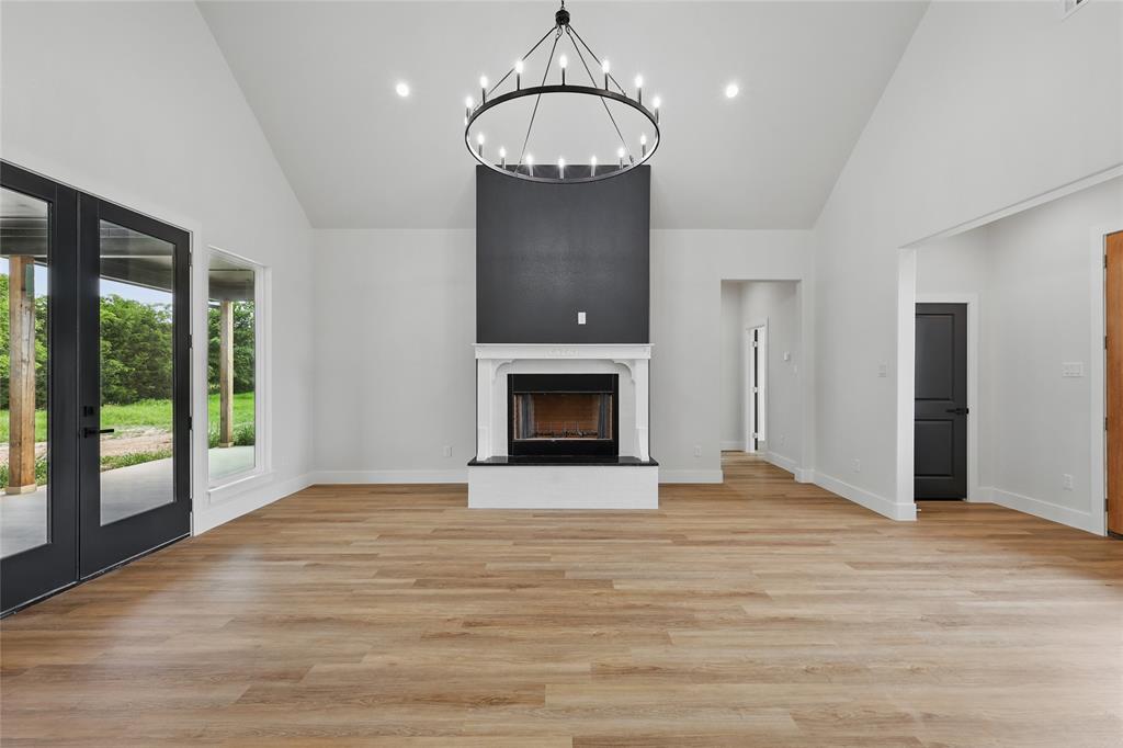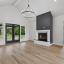 From the black brick and board-and-batten exterior to the natural wood accents and double glass doors, this house makes a powerful first impression. Step inside to find soaring ceilings, statement lighting, and a dramatic black-accented fireplace anchoring the open-concept living space.