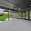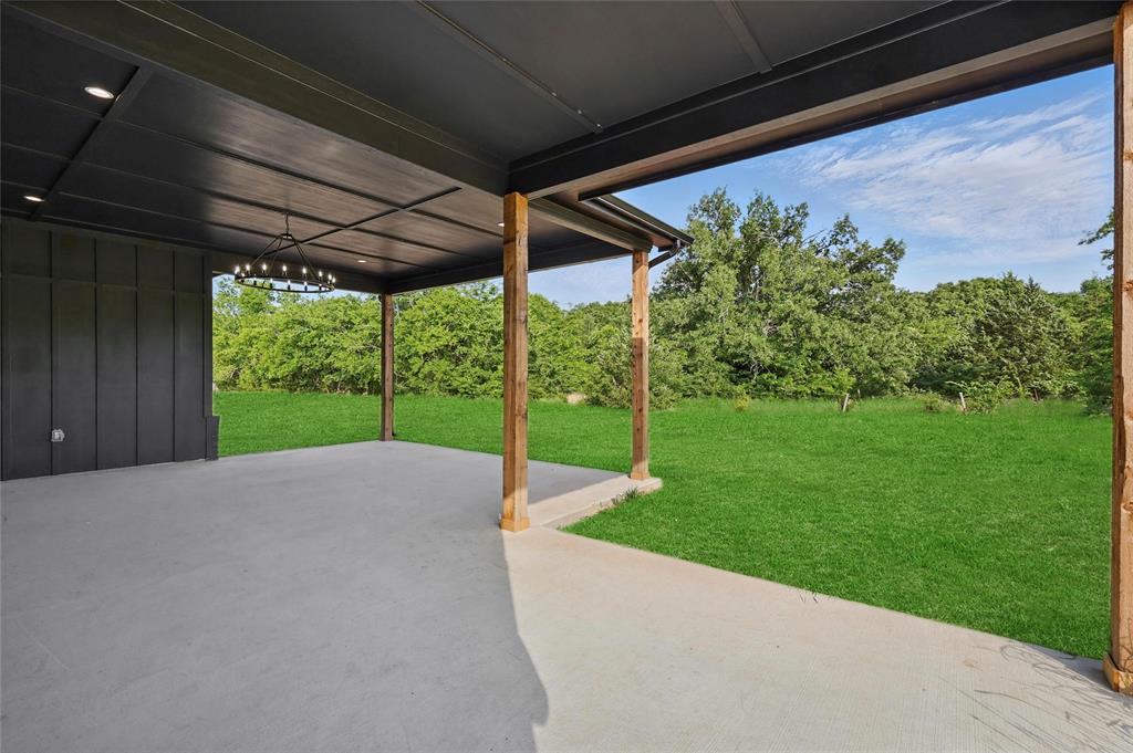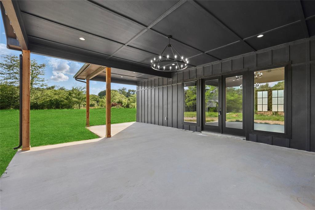 Step outside to enjoy the extended covered patio with a stylish black ceiling detail, ideal for hosting or relaxing surrounded by trees and privacy.
