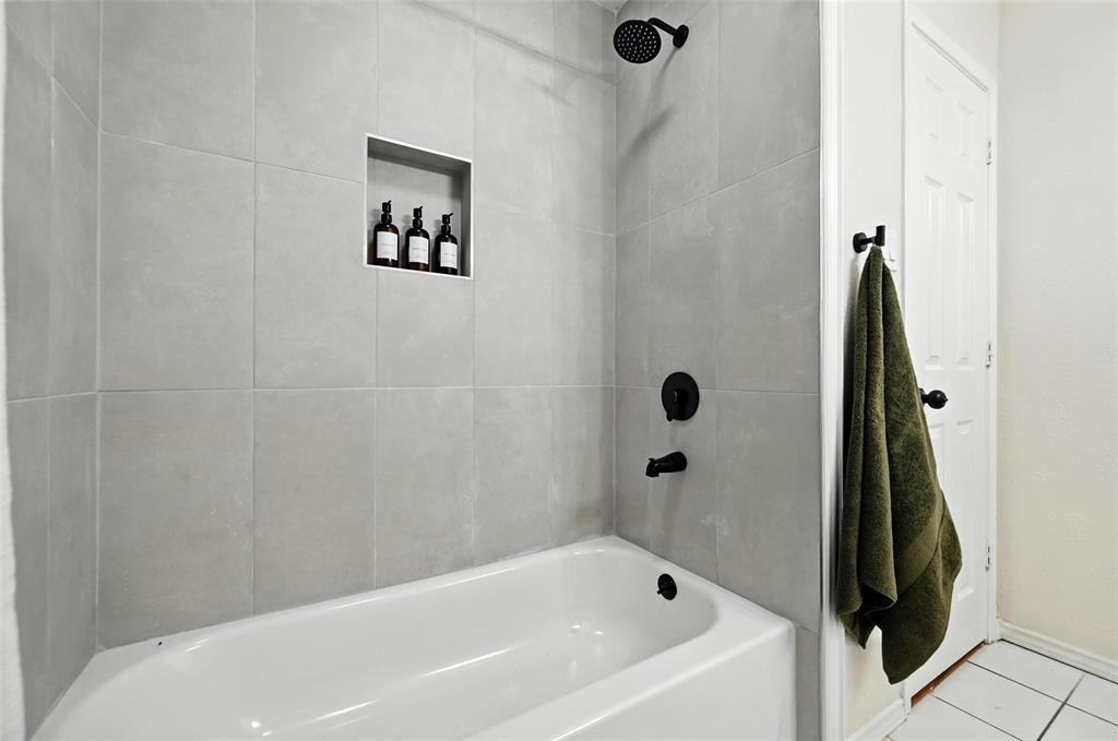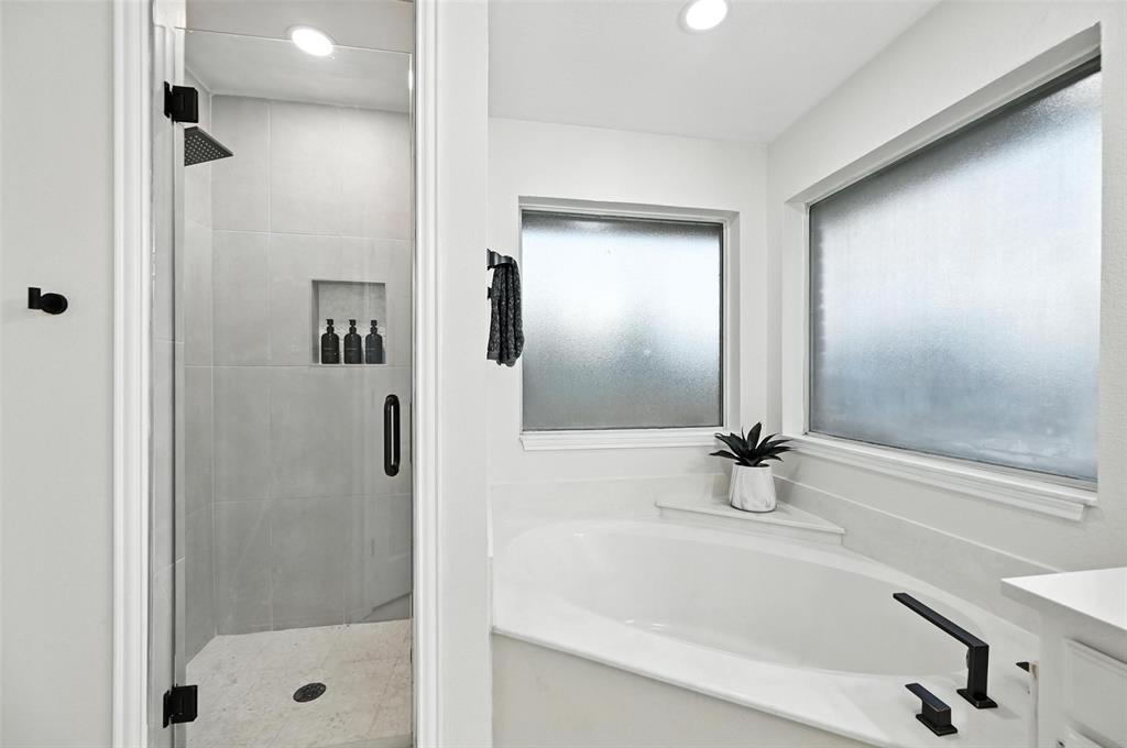The private master suite is a true highlight. Spacious and tucked away, it boasts a huge ensuite bathroom with a jetted soaking tub, a walk-in shower, and a double-sink vanity topped with quartz countertops. It’s designed as a relaxing retreat at the end of the day.