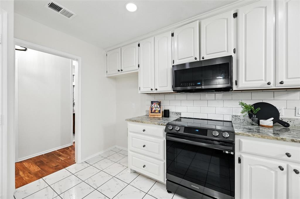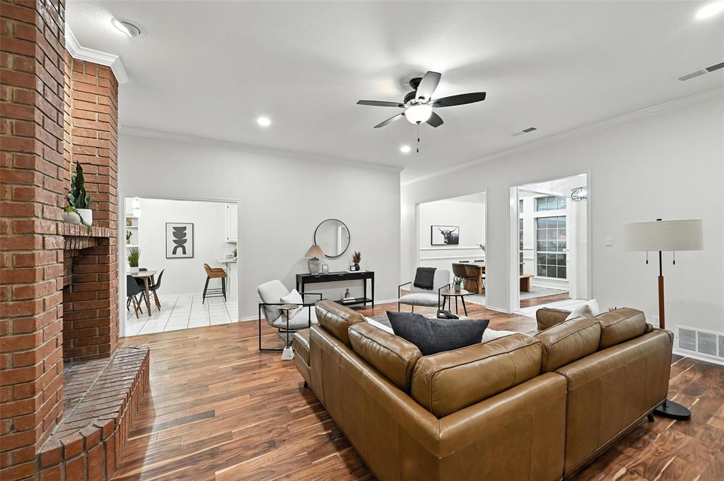 The kitchen showcases granite countertops and new recessed lighting, which continues into the inviting living room where a brick fireplace adds warmth and charm. The guest bath has been beautifully updated with quartz countertops and new tile in the shower, offering both modern style and functionality.
