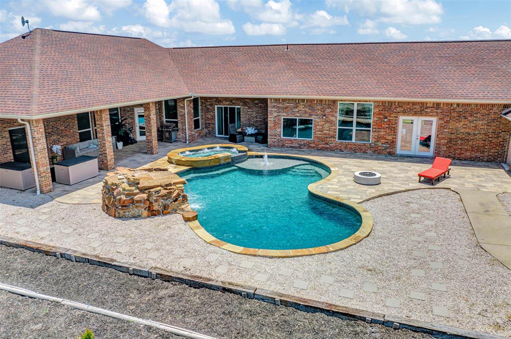 The resort-style pool and spa, installed in 2023, feature a waterfall, fountains, in-pool seating, a sunning pad, and lighting. A full pool bath with exterior access adds convenience.