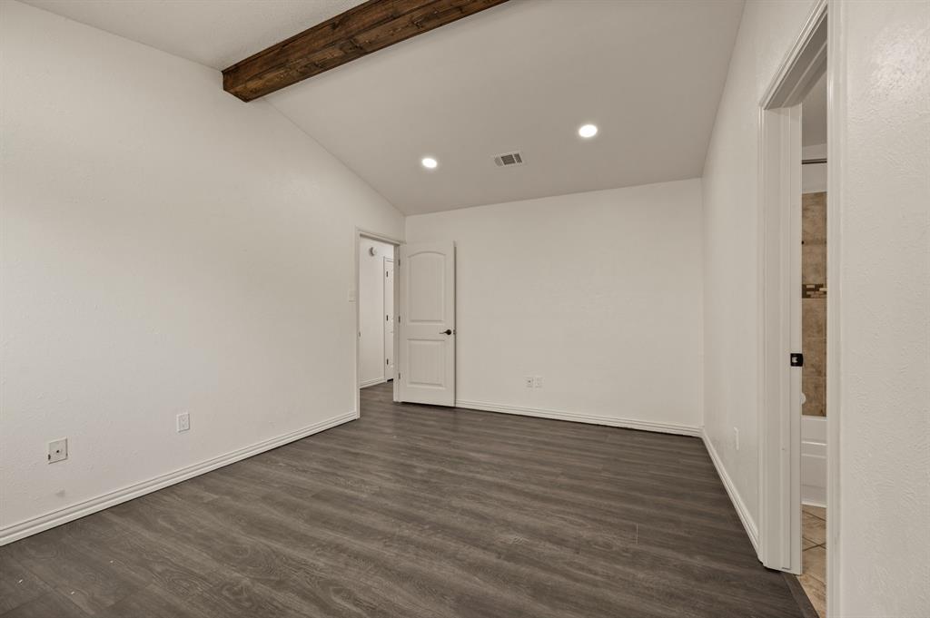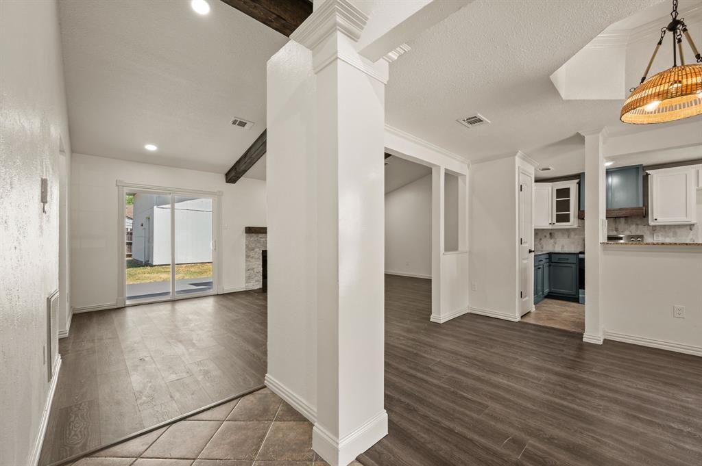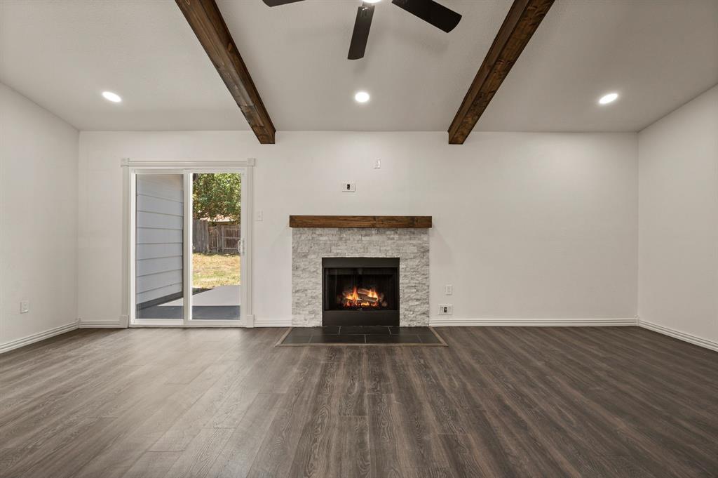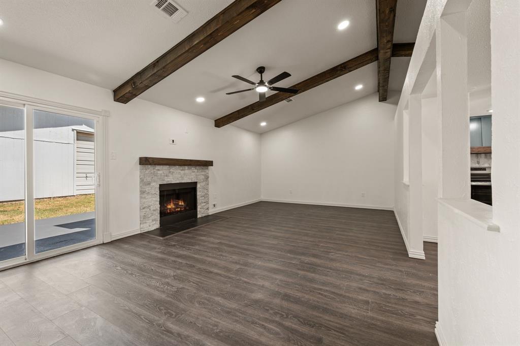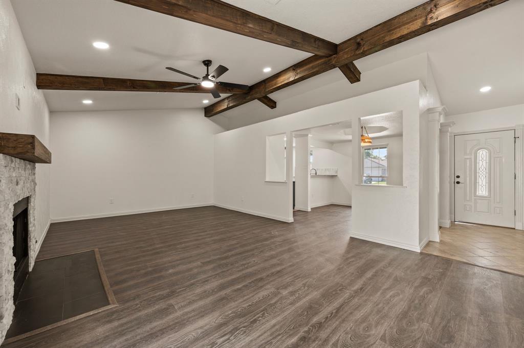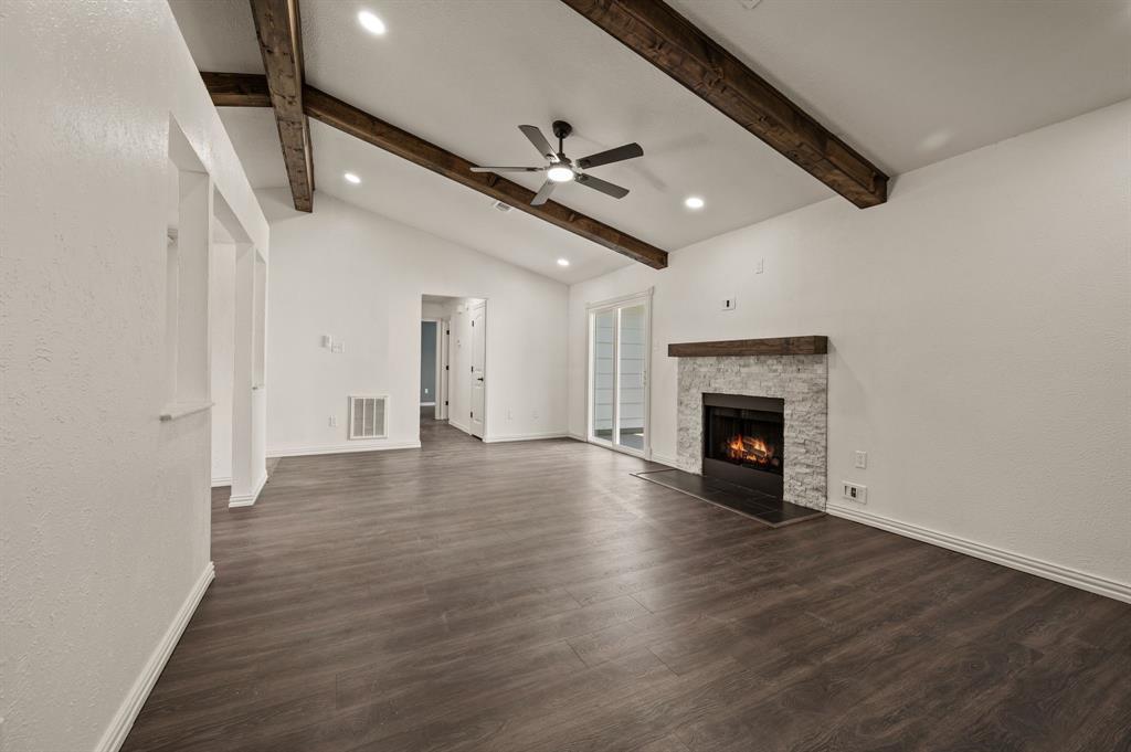 Step through the front door and be greeted by warm wood-look flooring and vaulted ceilings with wood beams that immediately add charm and drama to the main living space. A cozy wood-burning fireplace with a stacked-stone surround becomes the perfect focal point for evenings at home, while recessed lighting and an open layout offer a bright and functional living experience.