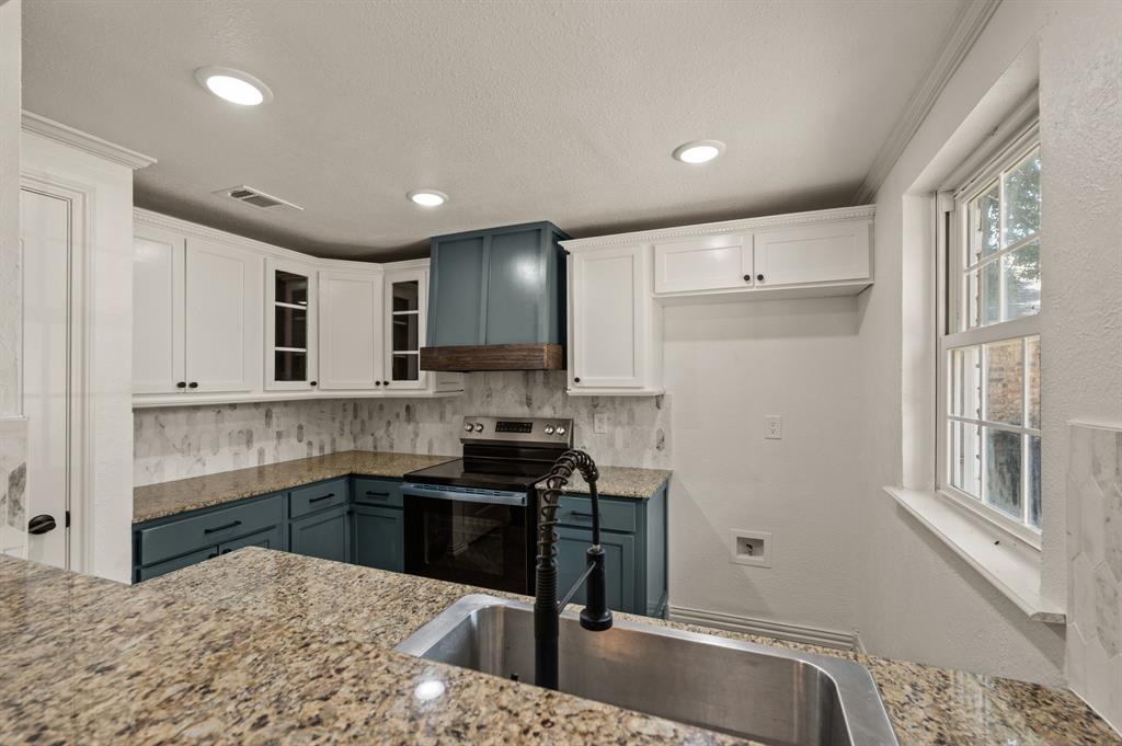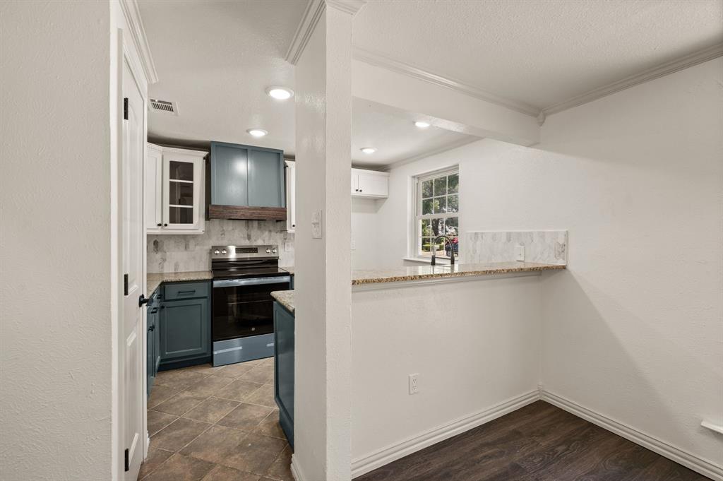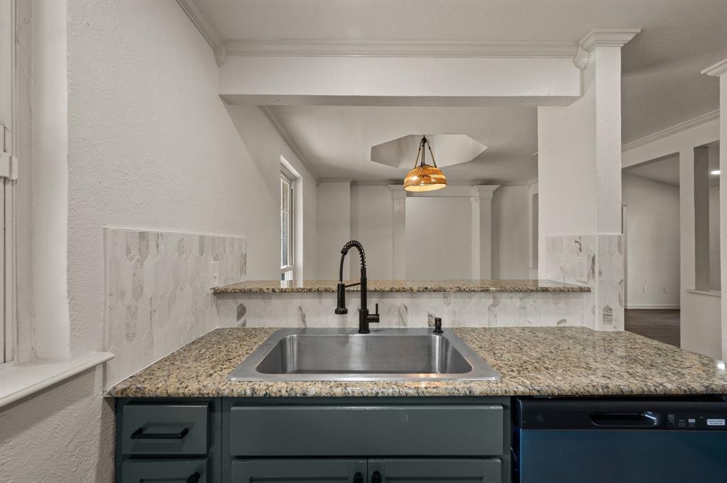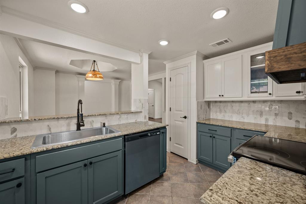 The kitchen feels both modern and unique with its two-tone cabinetry, natural granite countertops, stylish tile backsplash, and updated fixtures. The nearby dining area opens to the living space through decorative pass-throughs, creating a home that feels open while still offering distinct rooms full of character.