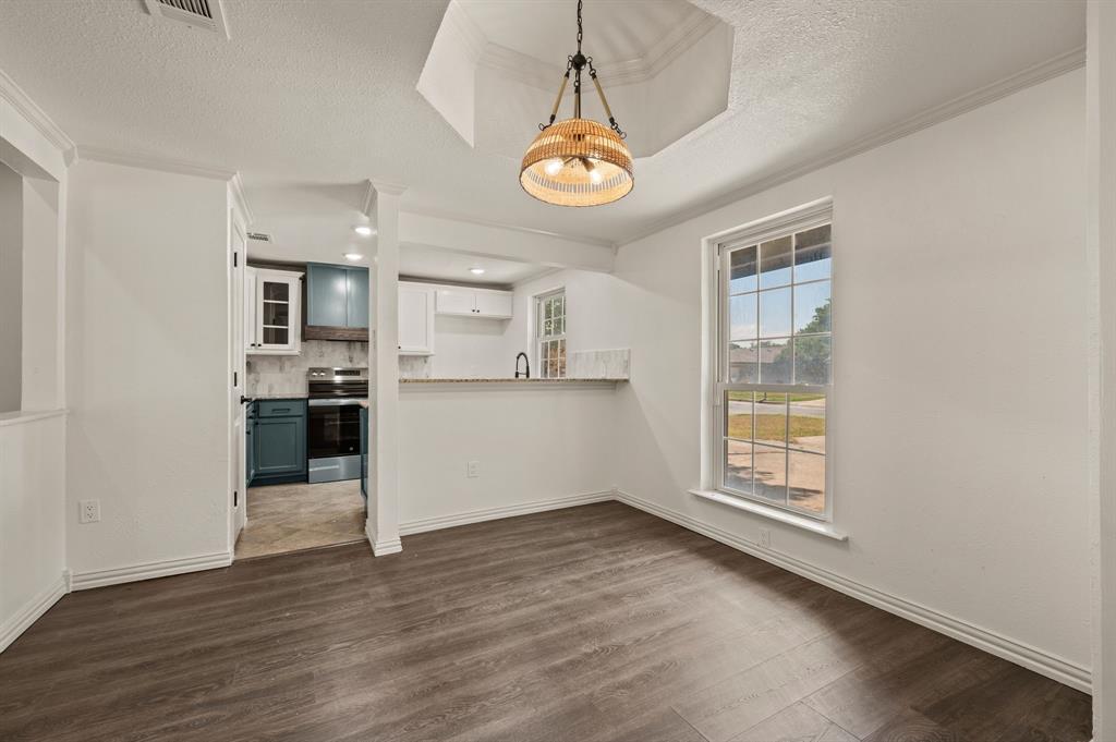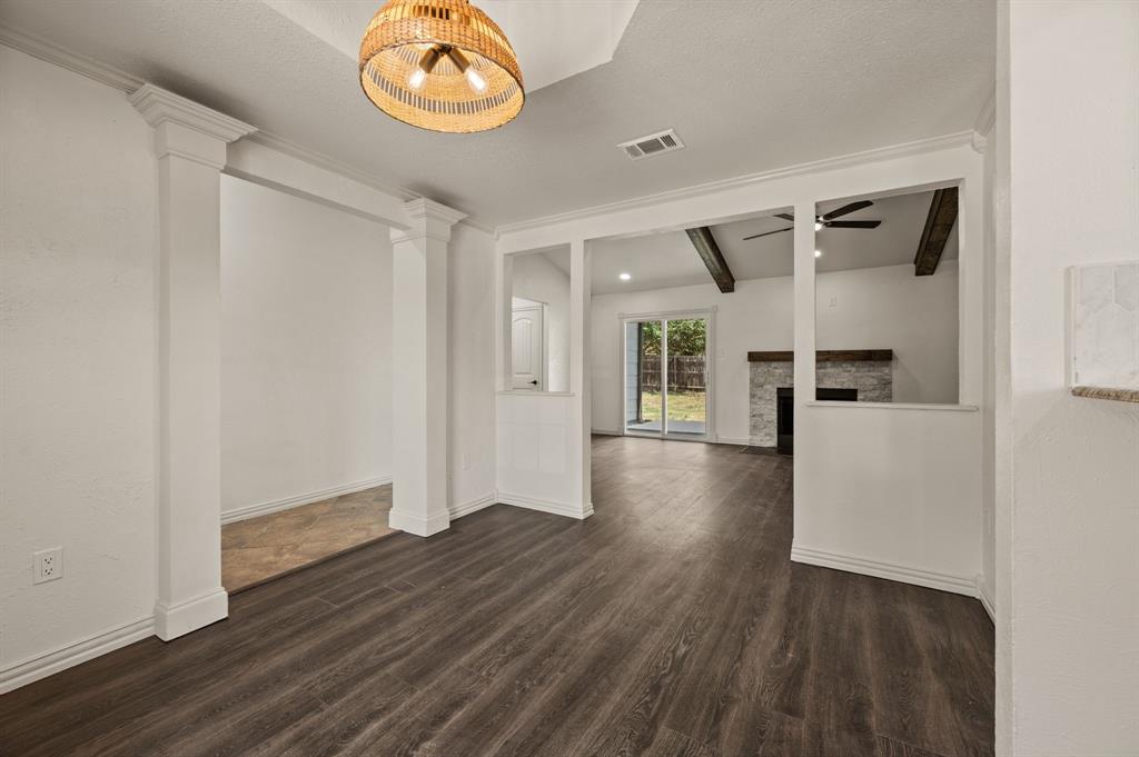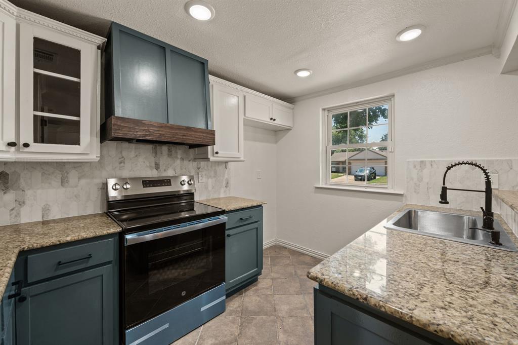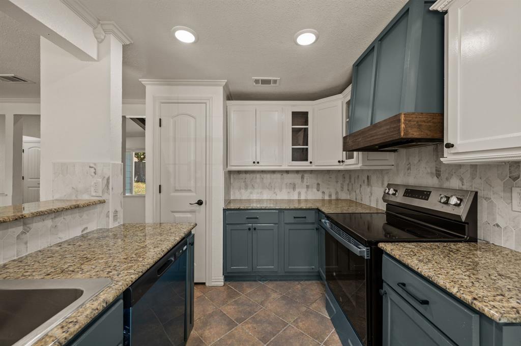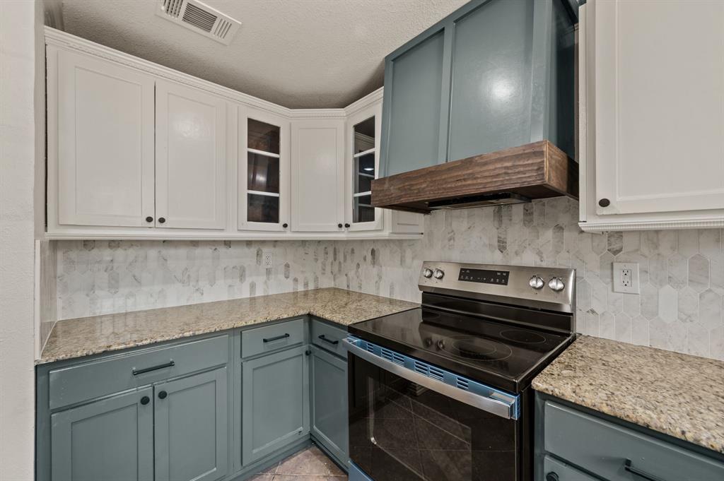 The kitchen feels both modern and unique with its two-tone cabinetry, natural granite countertops, stylish tile backsplash, and updated fixtures. The nearby dining area opens to the living space through decorative pass-throughs, creating a home that feels open while still offering distinct rooms full of character.