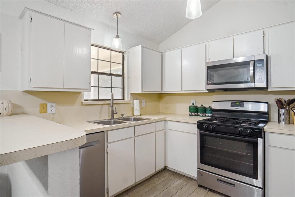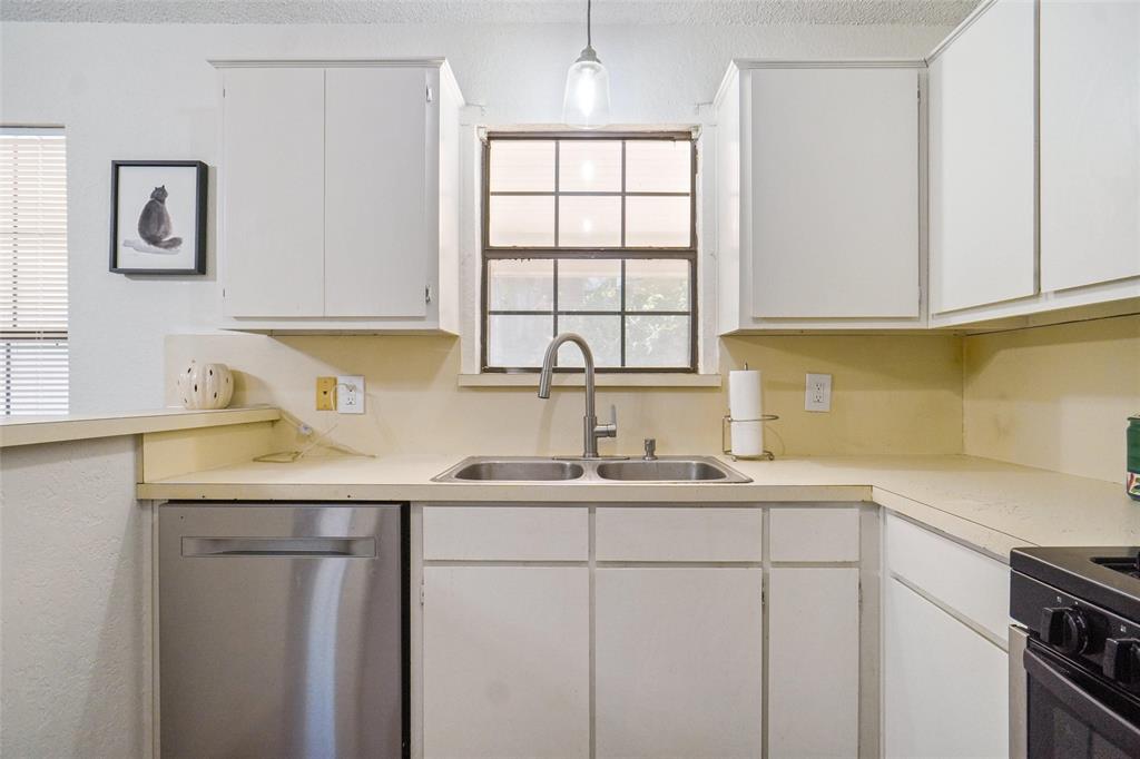 The kitchen boasts a gas range, abundant cabinetry, a breakfast bar, and a new dishwasher. A split floorplan provides privacy for the primary suite, complete with a large walk-in closet.
