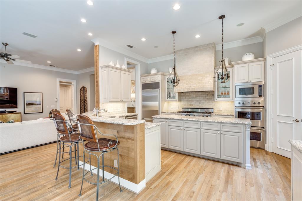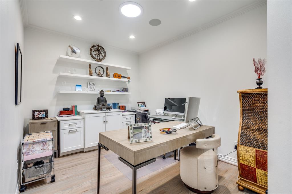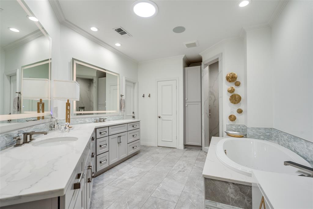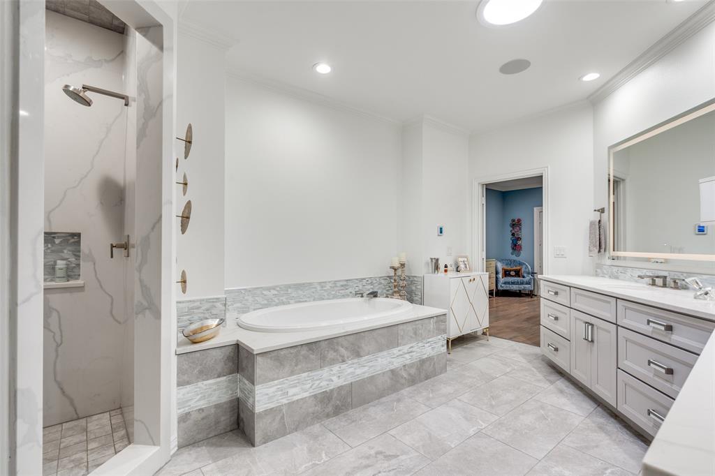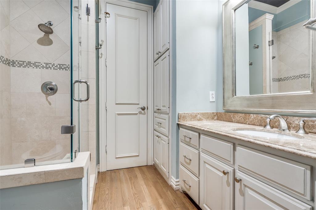 UNIQUE zero lot line in the lovely Stonebriar Village, a gated and guarded community with TWO PRIMARY suites & TWO STUDIES AND MANY HIGH END FINISHES with many added features and udates. Second floor was completely remodeled in 2023. The second story primary bath features quartz countertops, lighted mirrors, cermanic tile flooring, a large walk in shower, garden tub, and a linen closet. This primary suite also includes a huge closet (measures 12 x 10). Additionally the suite has hardwood flooring, a separate office with a wall of builtins and shelves above, and a 155 sq feet of a sunroom that makes a great TV or sitting room with incredible views of tons of trees and creek area. Don't miss upstairs guest room. It has a ensuite bath with lighted mirror and quartz! First floor primary has been remolded in 2019 with granite countertops, a tower, dual sinks, free-standing elegant tub, a custom closet, and a large walk in shower! Heated flooring in both primary baths! Chef's kitchen with extended island, granite countertops, Viking Appliances, double ovens, a built-in subzero refrigerator, a large walk in pantry, and a reverse osmosis water filtration system. The wrap around breakfast bar seats up to 5 people. Large breakfast room that views the resort style outdoor living area is open to the family room! Formal study (or could be 4th bedroom) with adjacent full bath, french doors, closet, a wall of built ins. No carpet in this great home, hardwood floors and ceramic tile throughout. Great wine storage with wine cooler. Two attics with walk in storage. Security and Sprinkler systems! Double garage has epoxy flooring, and custom cedar door. Extensive landscaping with stone borders. A whole house Generac generator, a Culligan water softener system, and a Moen water safety system stay with the home. Seller prides in taking care of the home. AGENT IS THE SPOUSE OF THE SELLER.