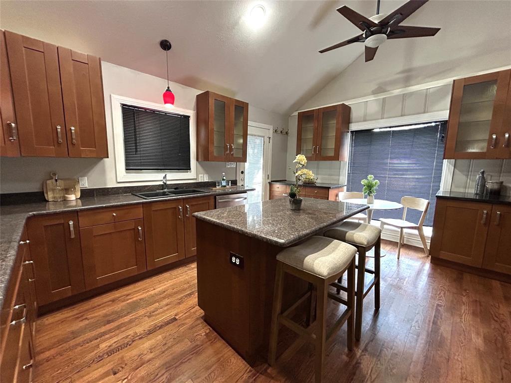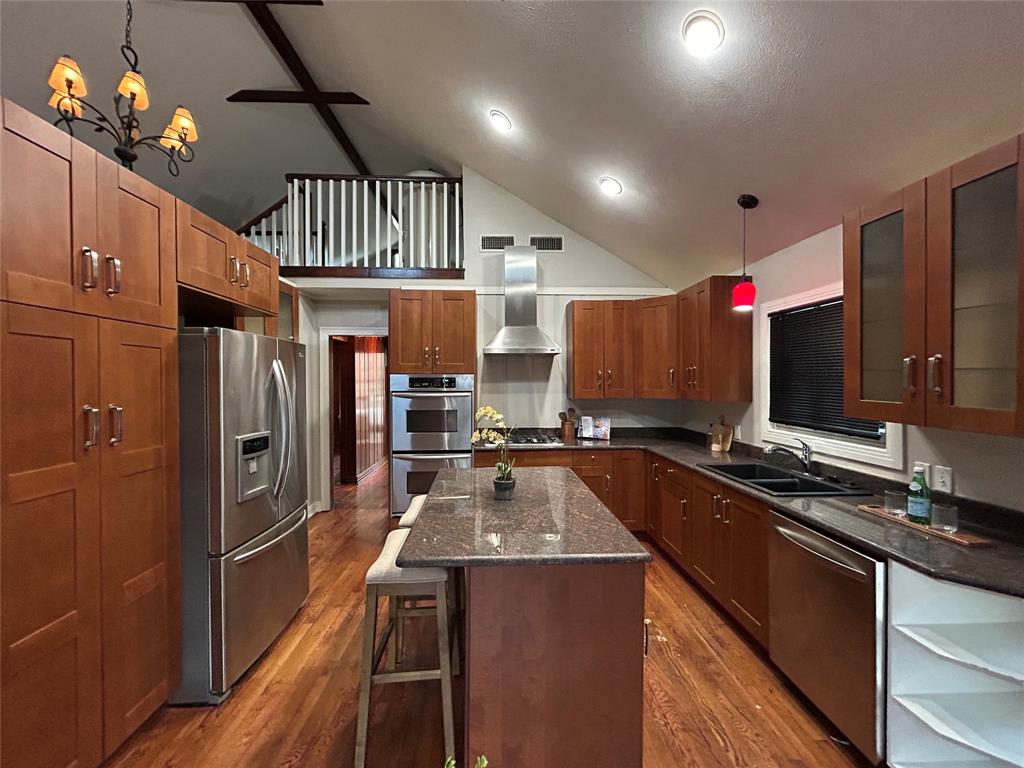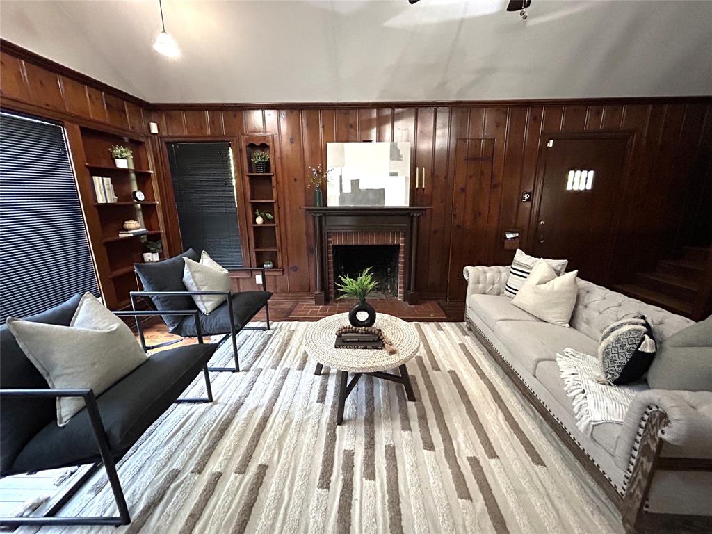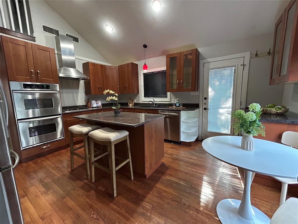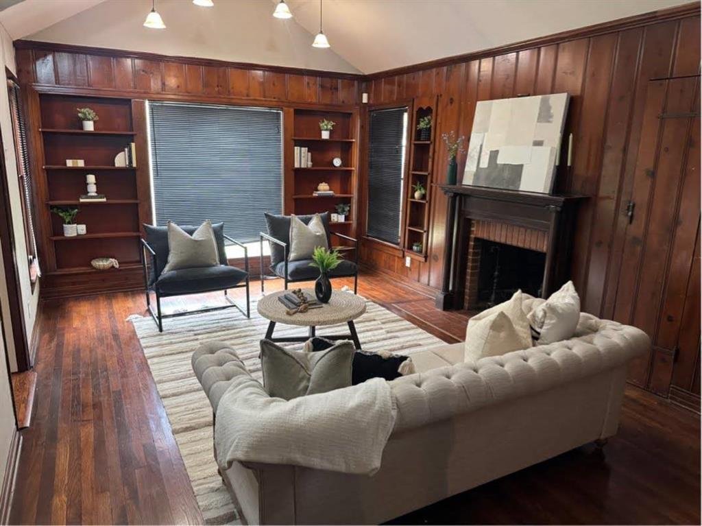 The home itself is full of charm, blending original details with thoughtful updates. You'll find gorgeous original wood flooring throughout, matching natural custom wood walls, exposed wood-beamed ceilings and a cozy wood-burning fireplace in the spacious living room. The kitchen is fully updated with stainless steel appliances, a gas cooktop, granite countertops, and matching wood cabinets. The bathroom features a jetted tub, tiled surround, and granite vanity.
