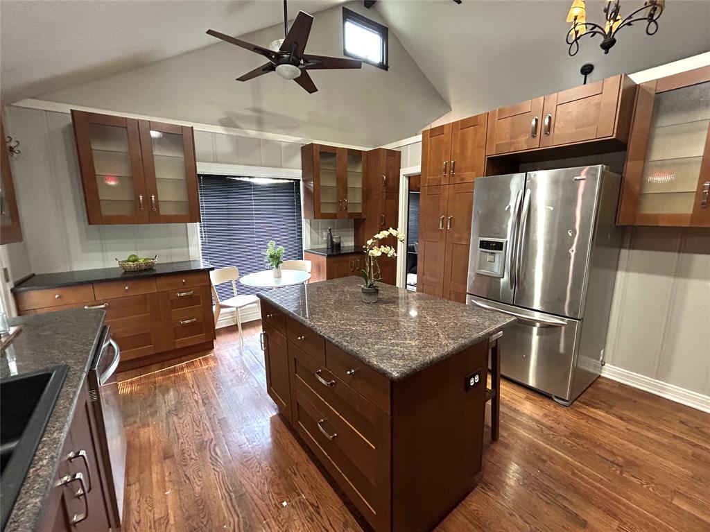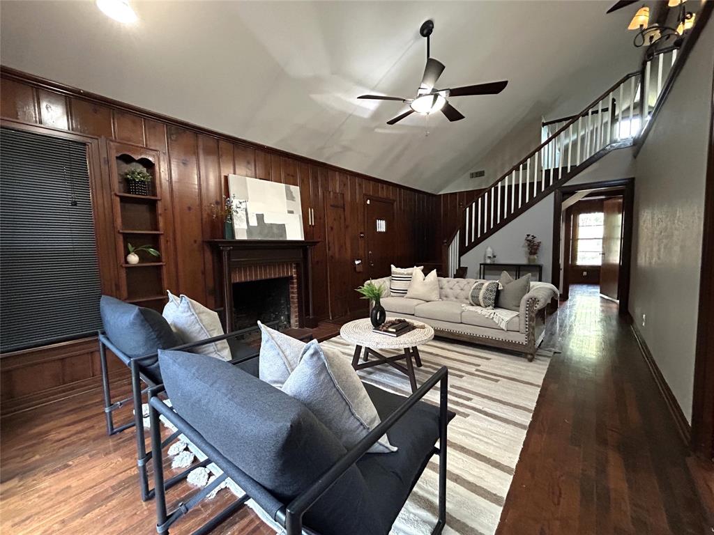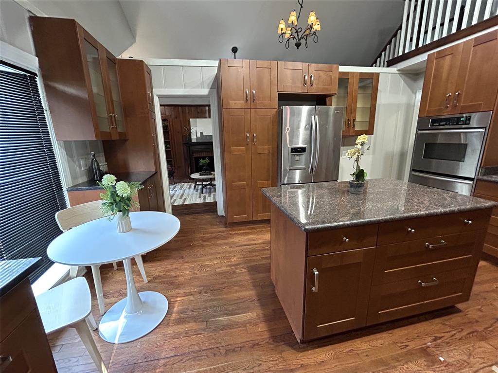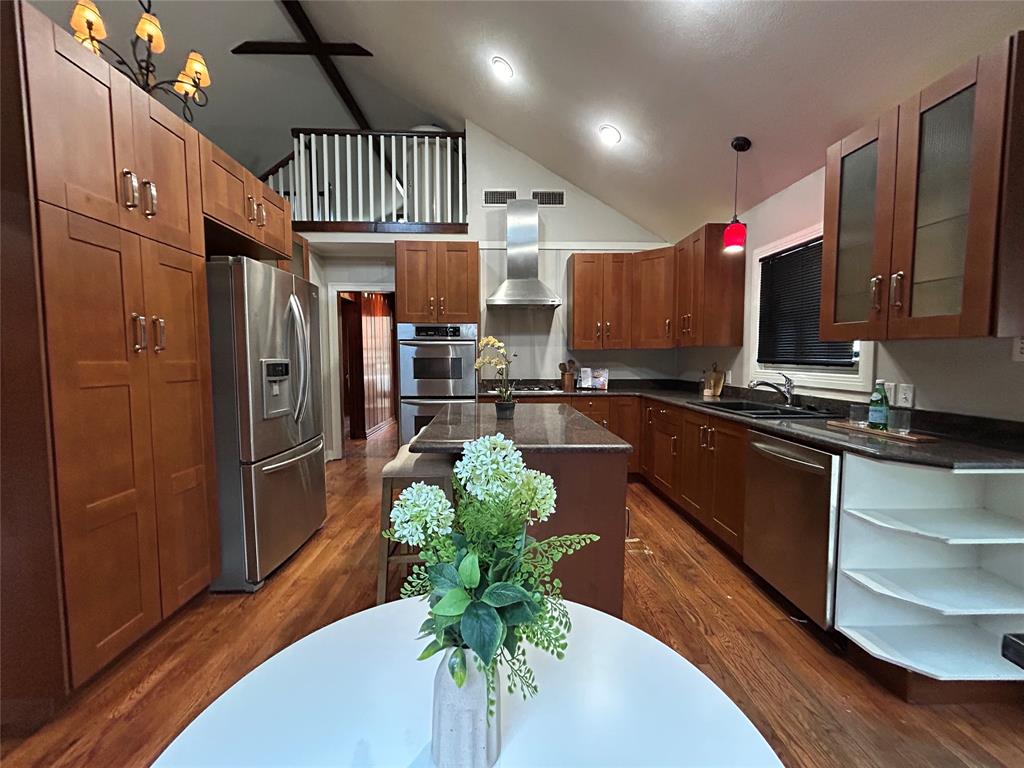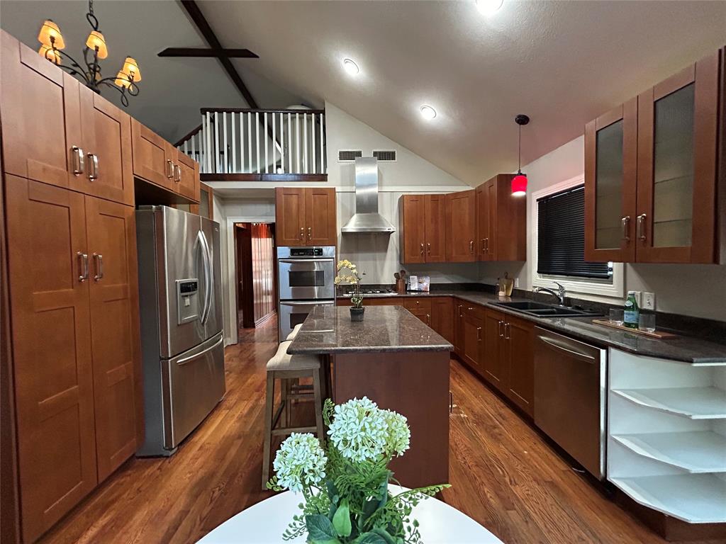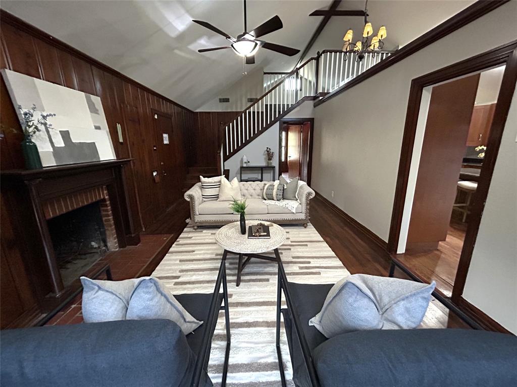 The home itself is full of charm, blending original details with thoughtful updates. You'll find gorgeous original wood flooring throughout, matching natural custom wood walls, exposed wood-beamed ceilings and a cozy wood-burning fireplace in the spacious living room. The kitchen is fully updated with stainless steel appliances, a gas cooktop, granite countertops, and matching wood cabinets. The bathroom features a jetted tub, tiled surround, and granite vanity.