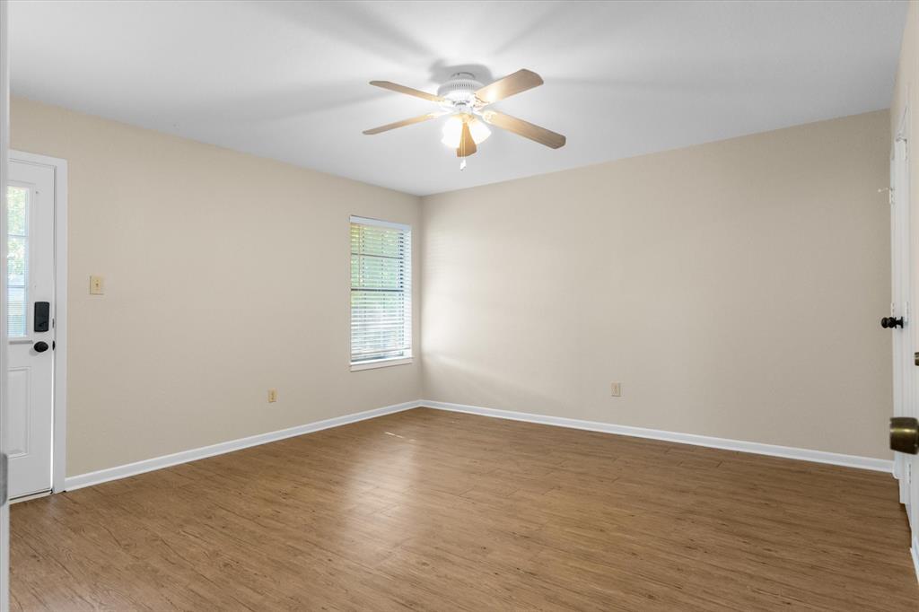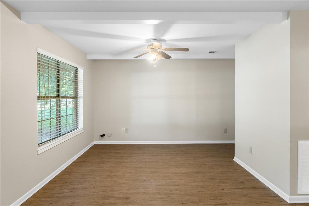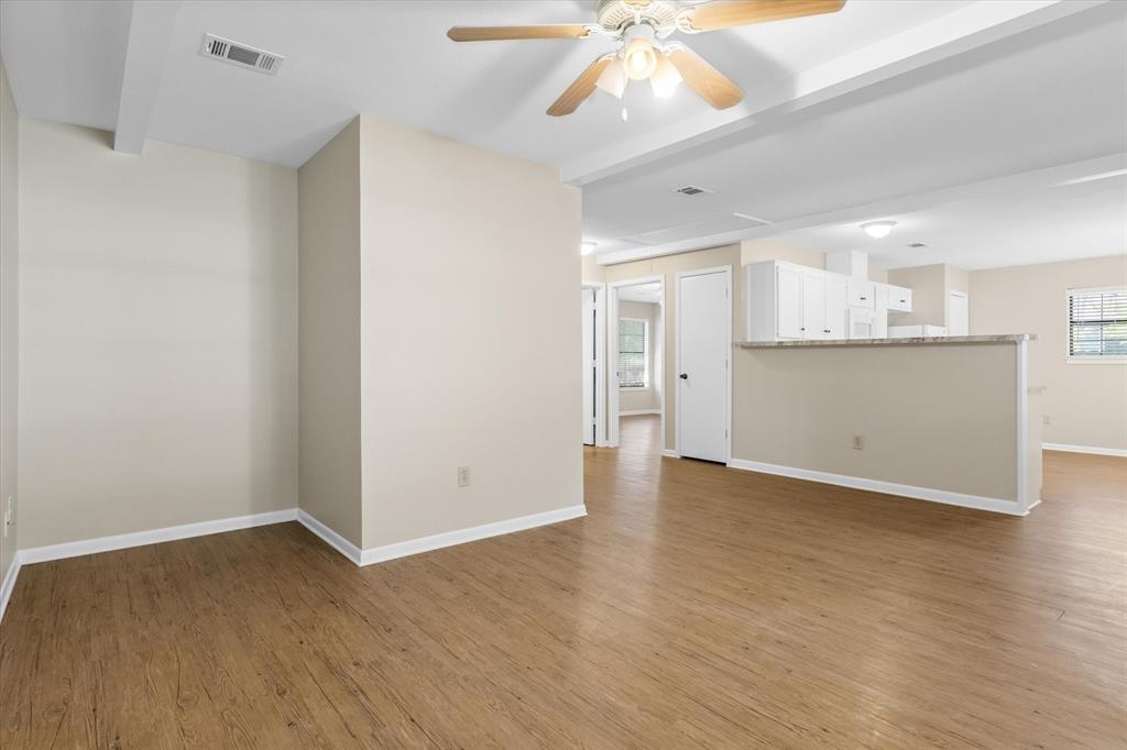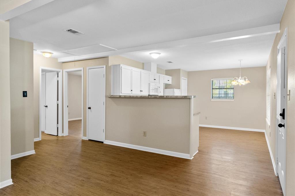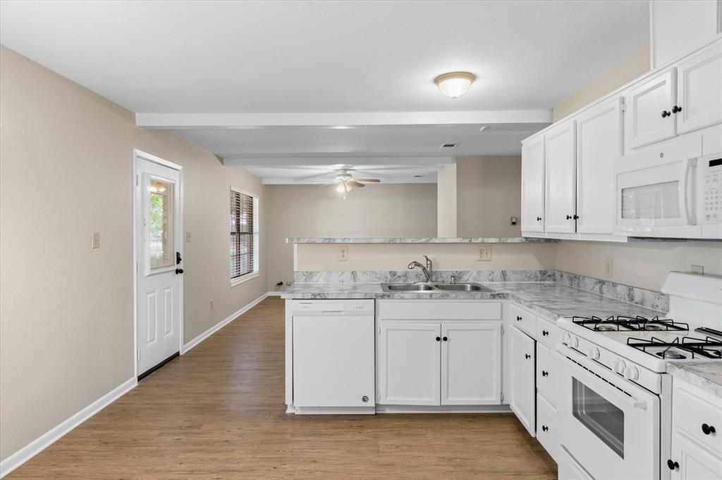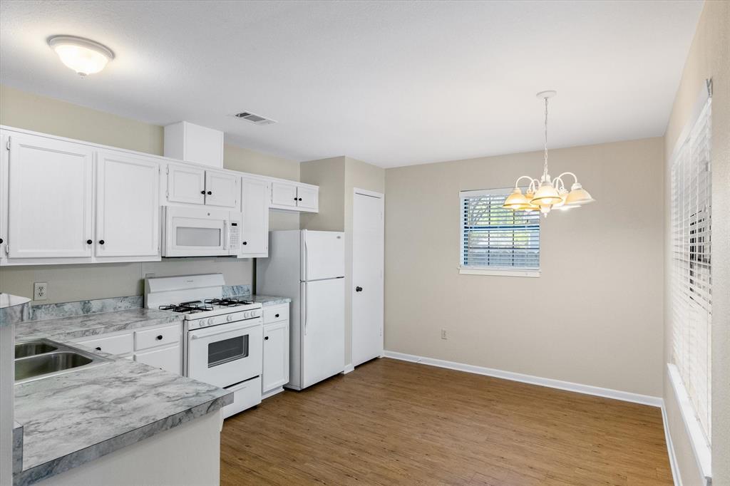 Inside, you’ll enjoy an open-concept living and kitchen area filled with natural light, freshly painted walls, and easy-care wood-look flooring throughout. The kitchen comes fully equipped with a gas range, dishwasher, and built-in microwave, perfect for whipping up weeknight dinners or weekend treats.