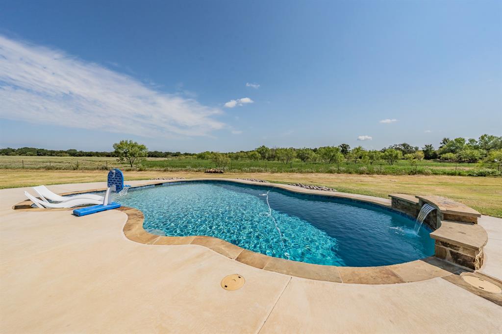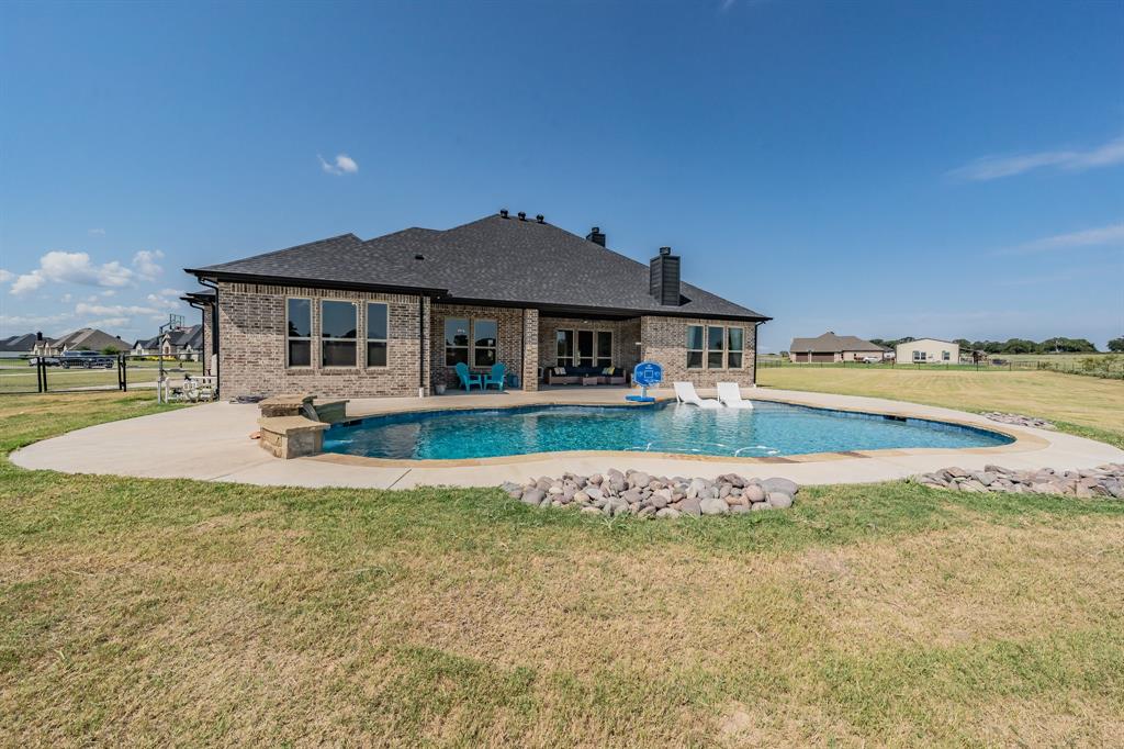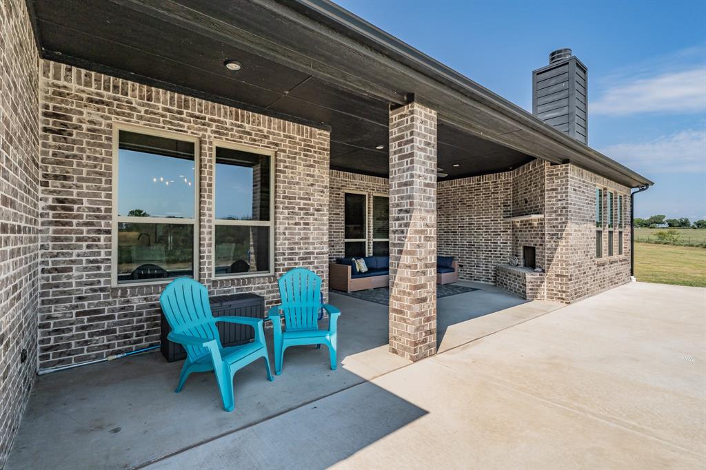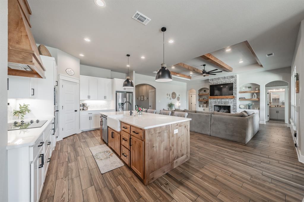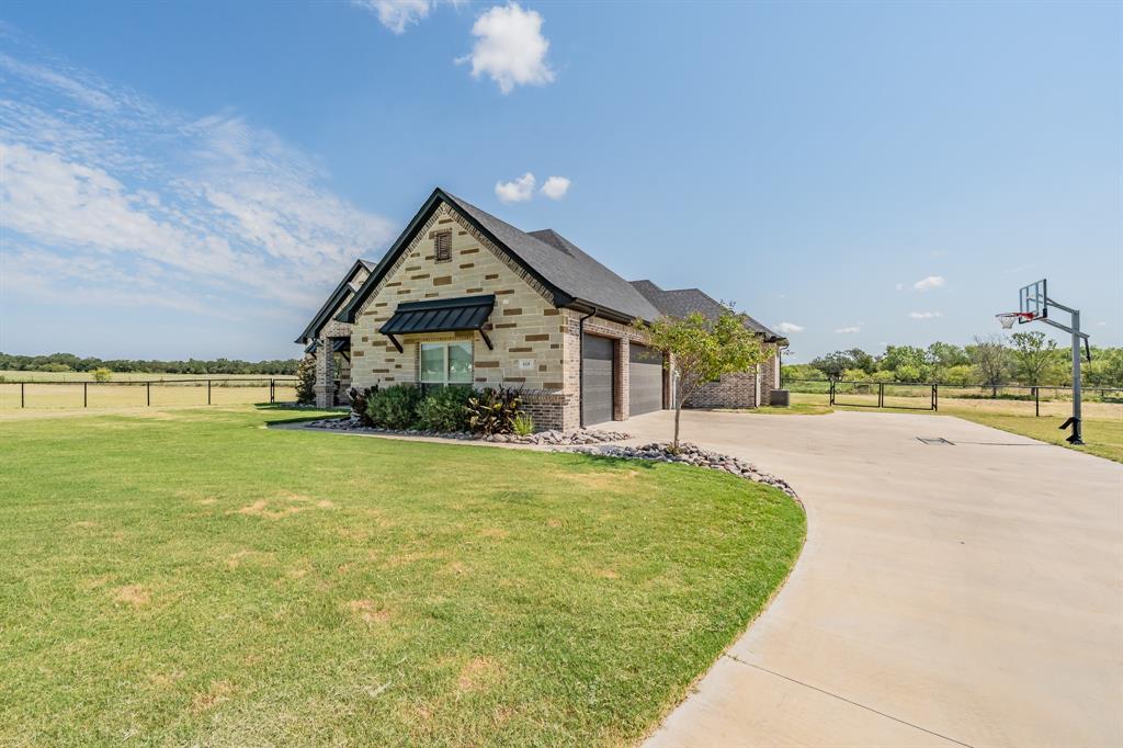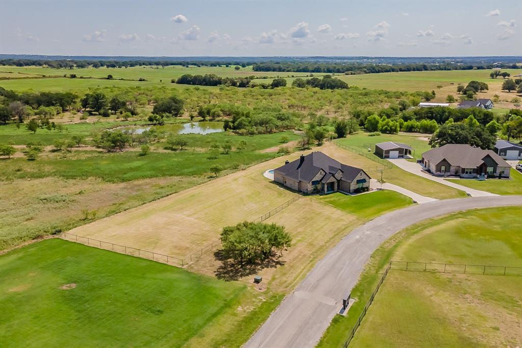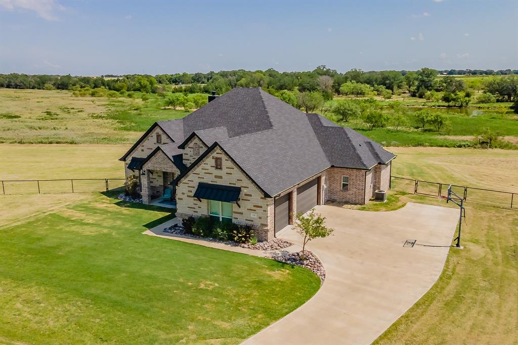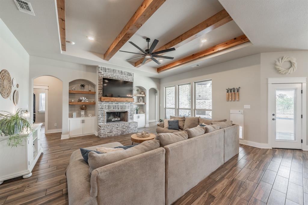 Stunning home in Brock ISD provides a charming combination of brick and stone exterior on 1.33 acres. Home offers 5 bedrooms, or 4 bedrooms plus an office, and 2.5 bathrooms, providing timeless style with thoughtful functionality. The heart of the home is the open-concept kitchen, designed for both gourmet cooking and everyday convenience. Stainless steel appliances, a pot filler, and a large center island make meal preparation a breeze, while the farmhouse sink adds rustic charm. Expansive counters and abundant cabinetry provide ample workspace and storage, and the island offers additional seating for casual gatherings. The kitchen seamlessly flows into the living area, where wood-beamed ceilings, abundant natural light, and built-in cabinets create a warm and inviting atmosphere anchored by a beautiful wood-burning fireplace.