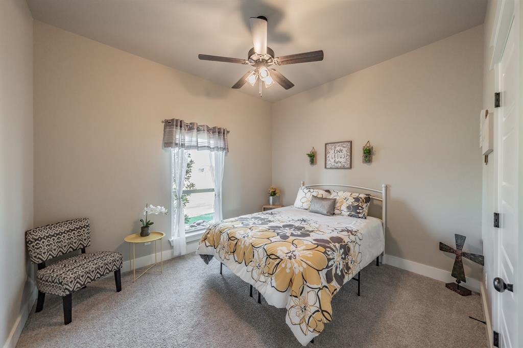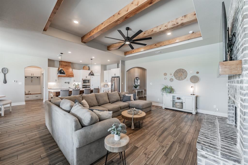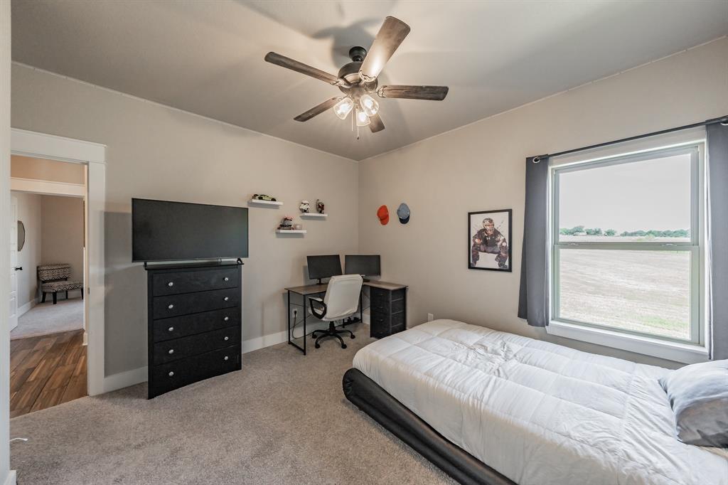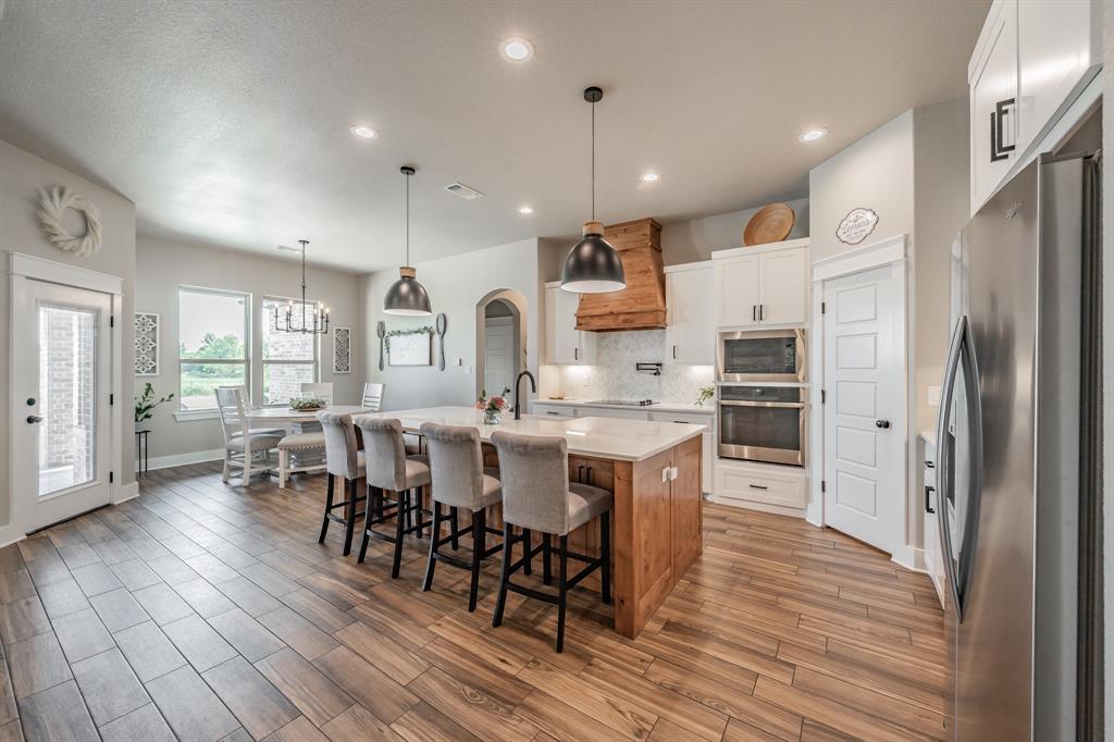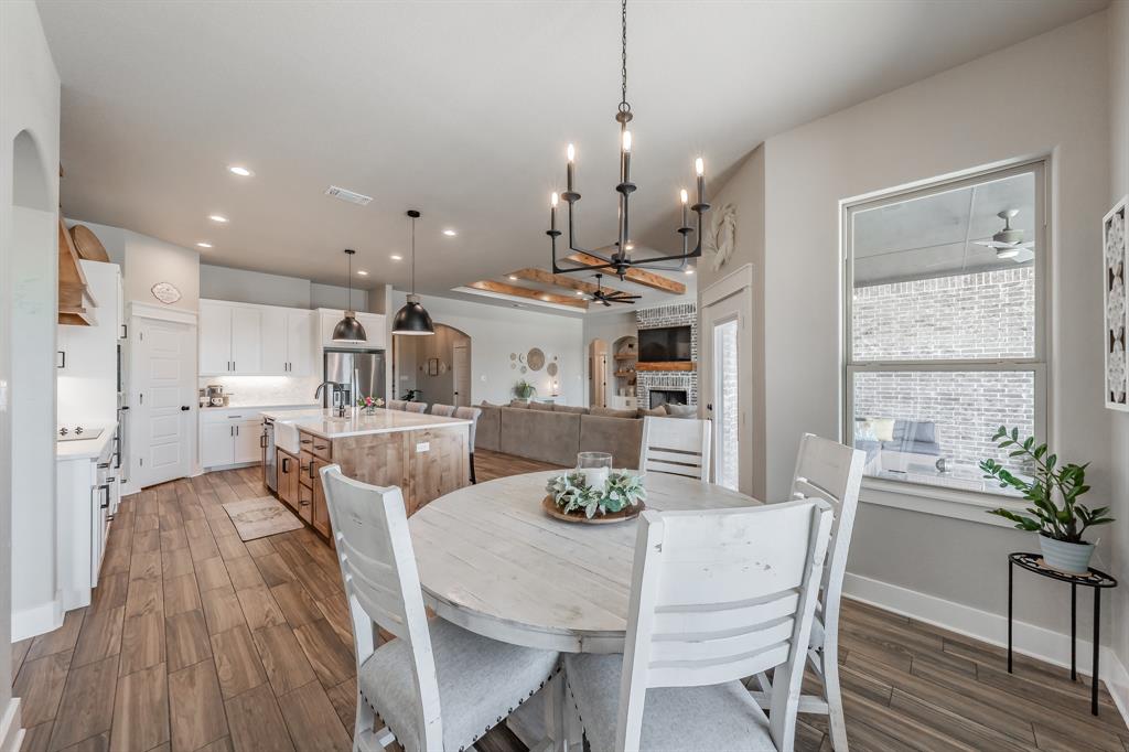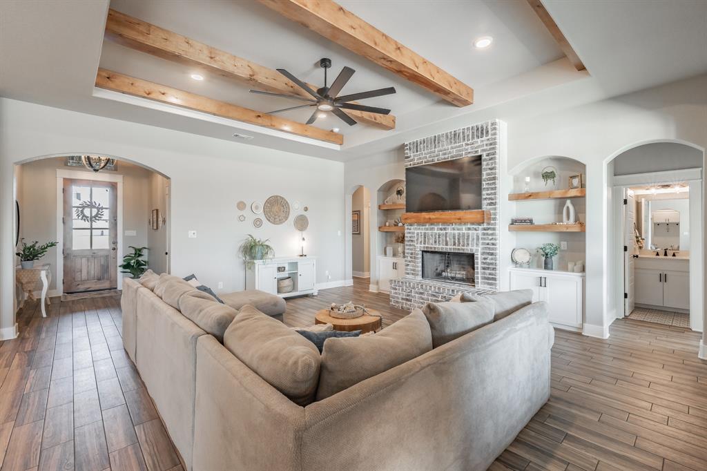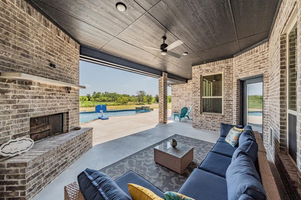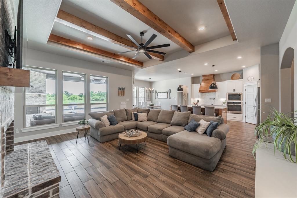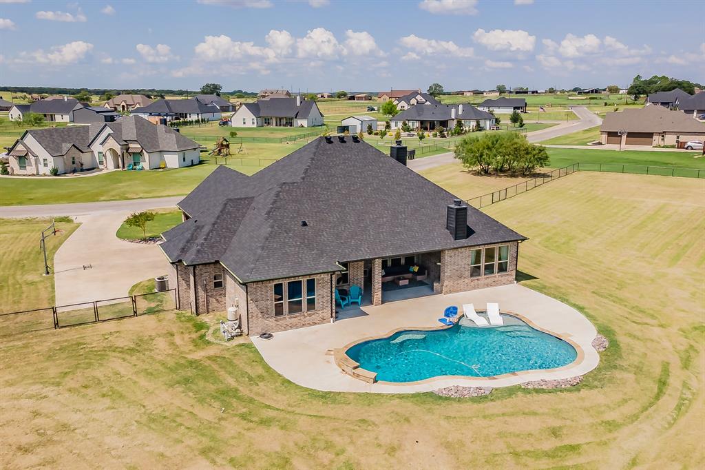 Stunning home in Brock ISD provides a charming combination of brick and stone exterior on 1.33 acres. Home offers 5 bedrooms, or 4 bedrooms plus an office, and 2.5 bathrooms, providing timeless style with thoughtful functionality. The heart of the home is the open-concept kitchen, designed for both gourmet cooking and everyday convenience. Stainless steel appliances, a pot filler, and a large center island make meal preparation a breeze, while the farmhouse sink adds rustic charm. Expansive counters and abundant cabinetry provide ample workspace and storage, and the island offers additional seating for casual gatherings. The kitchen seamlessly flows into the living area, where wood-beamed ceilings, abundant natural light, and built-in cabinets create a warm and inviting atmosphere anchored by a beautiful wood-burning fireplace.