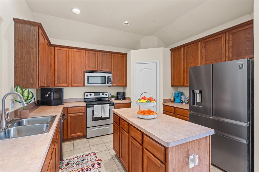 The kitchen is a standout, complete with a large island, breakfast bar, built-in microwave, dishwasher, garbage disposal, and ample cabinet space plus a walk-in pantry.