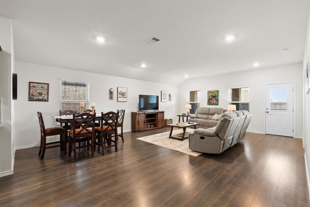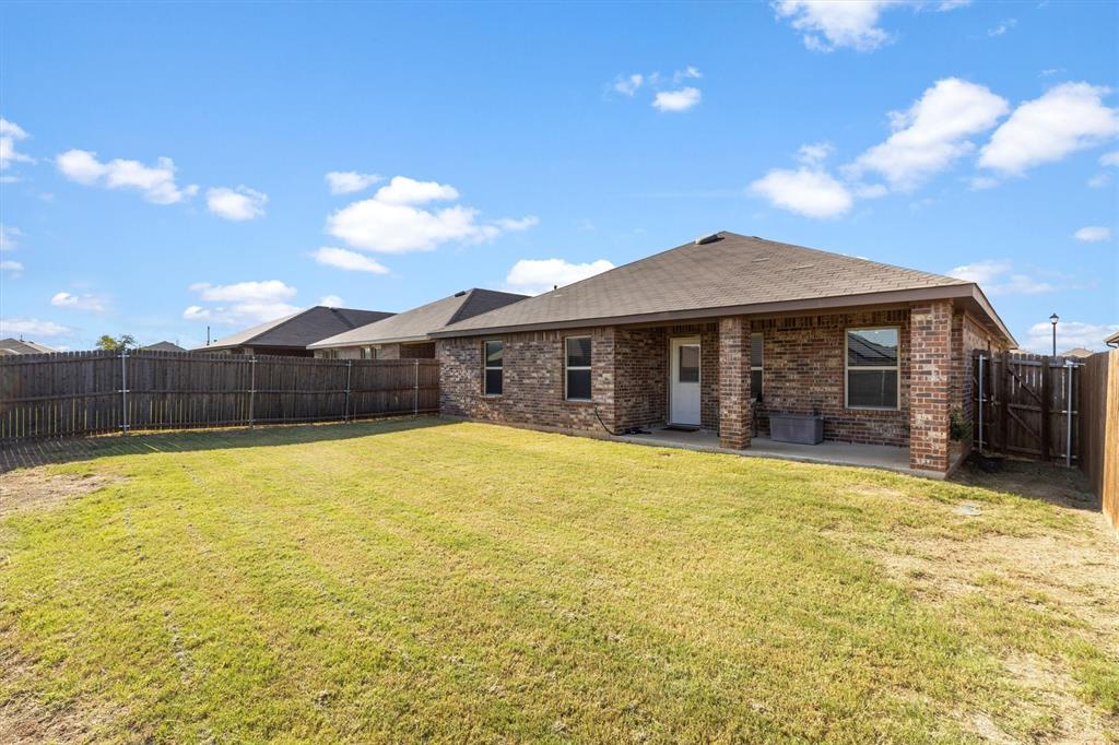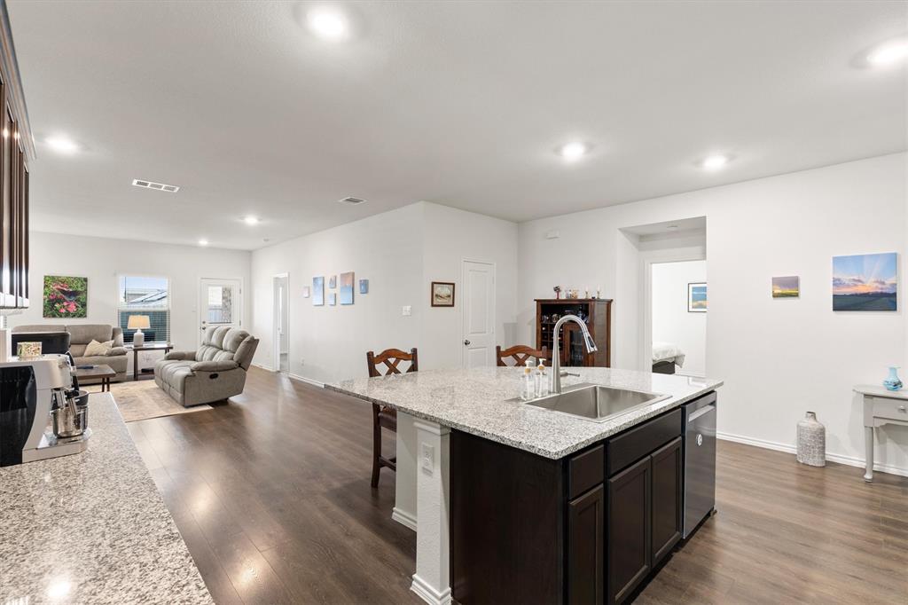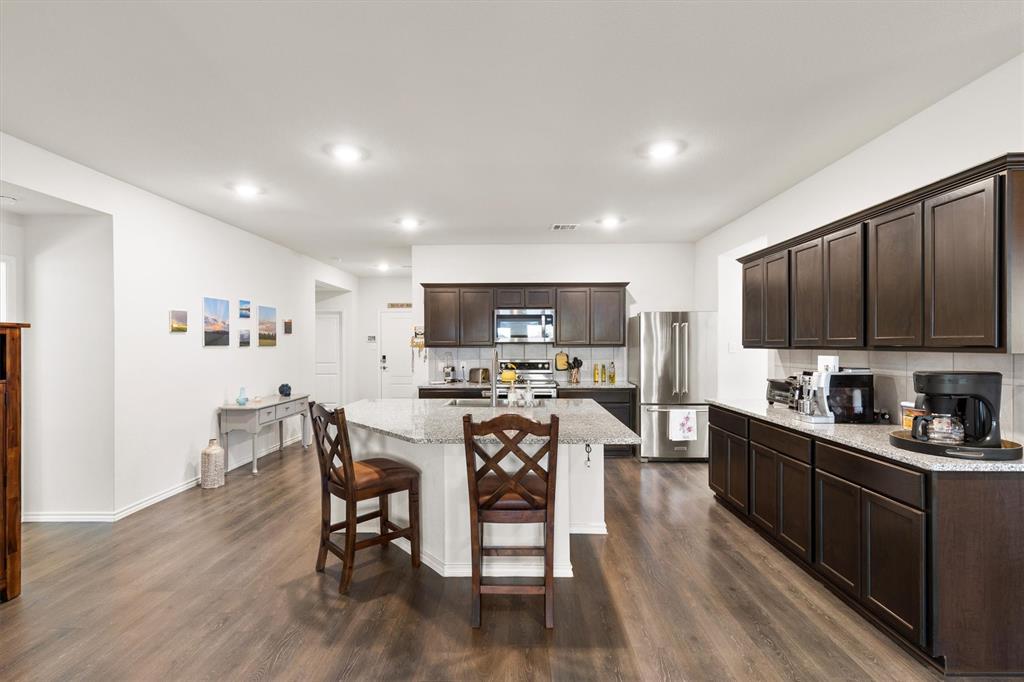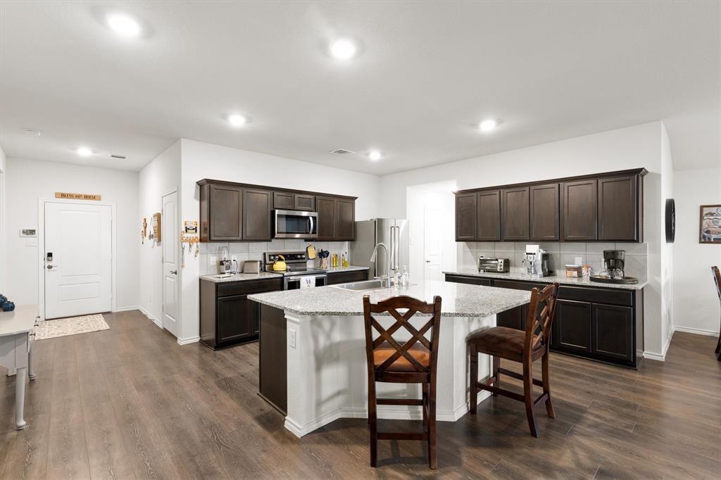 **OPEN HOUSE 081725 FROM 11:45-1:45PM**Charming One-Owner Home in Sought-After Valor Farms! This beautifully maintained home has striking curb appeal with its rock and stone exterior. Step inside to a bright, open floorplan with extensive laminate wood flooring that flows through the main living spaces. The spacious kitchen is a true centerpiece—offering abundant cabinetry, an upgraded sink, faucet and dishwasher, a generous granite island perfect for casual dining, and a nice sized pantry. There’s even extra counter space that works perfectly as a coffee bar or prep station. The expansive primary suite easily accommodates a sitting area and features a walk-in closet, linen shelving, a vanity, and an oversized shower. Three additional bedrooms and a second full bath provide plenty of space for family, guests, or a home office. Two car front entry garage with a tankless hot water heater and a ring doorbell! Out back, a covered patio overlooks the lush grassy yard—perfect for grilling, entertaining, or simply unwinding. Enjoy community amenities including a refreshing pool, plus the convenience of a brand-new elementary school, Sarah Moss Elementary, nearby and quick access to I-30.