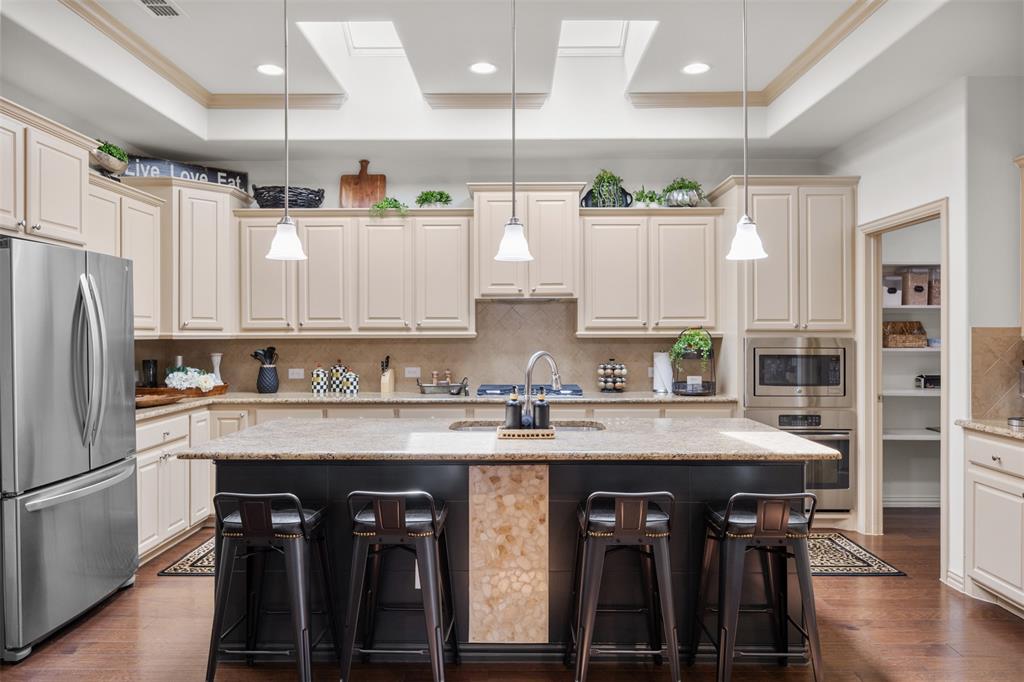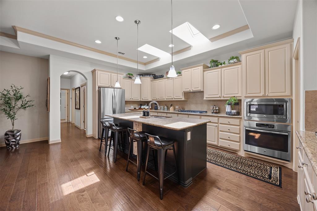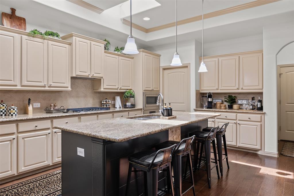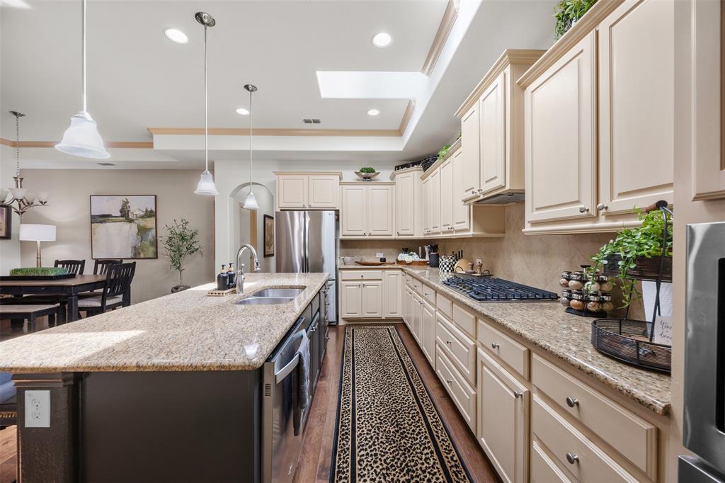 The chef’s kitchen is a true highlight, boasting two skylights, a generous island, abundant granite countertops, a gas cooktop, stainless steel appliances, and ample cabinetry plus an extra-large walk-in pantry for all your storage needs.