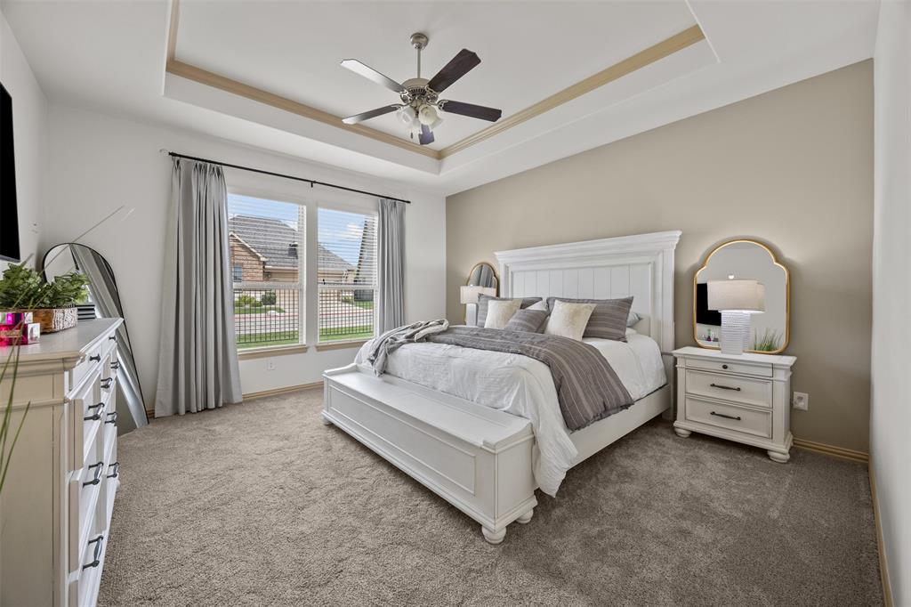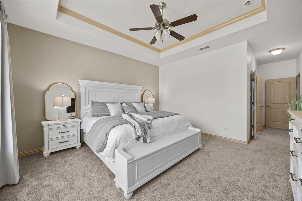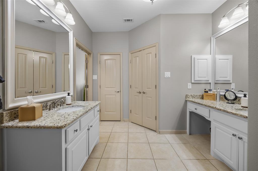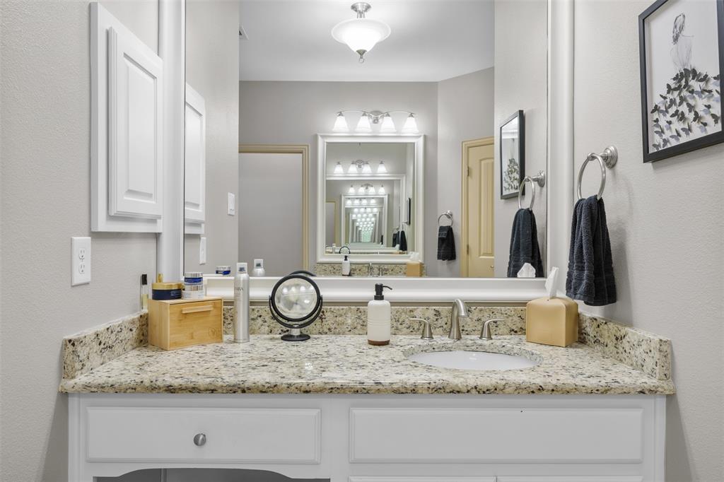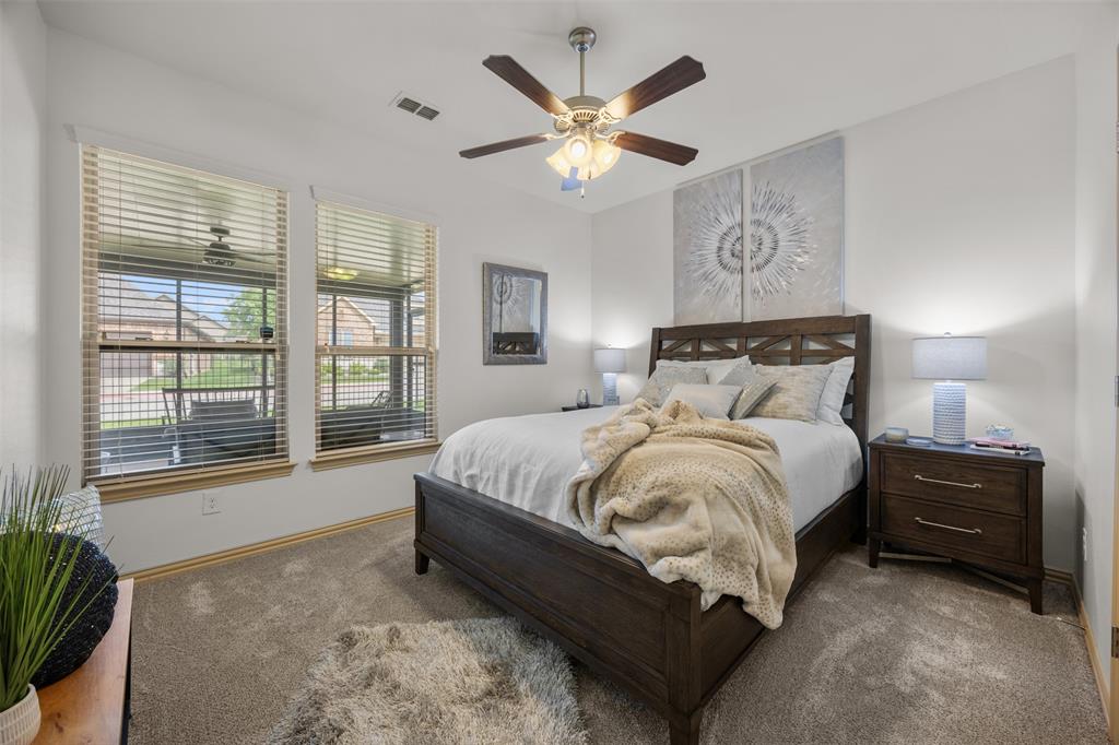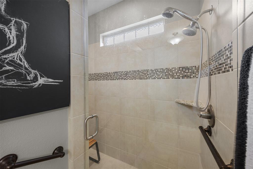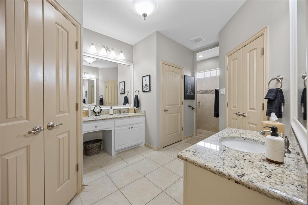 The primary suite impresses with dual walk-in closets and an elegant bathroom complete with dual sinks and a large, accessible shower with ramp entry.