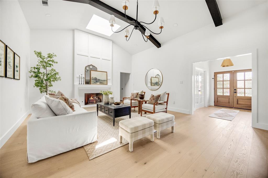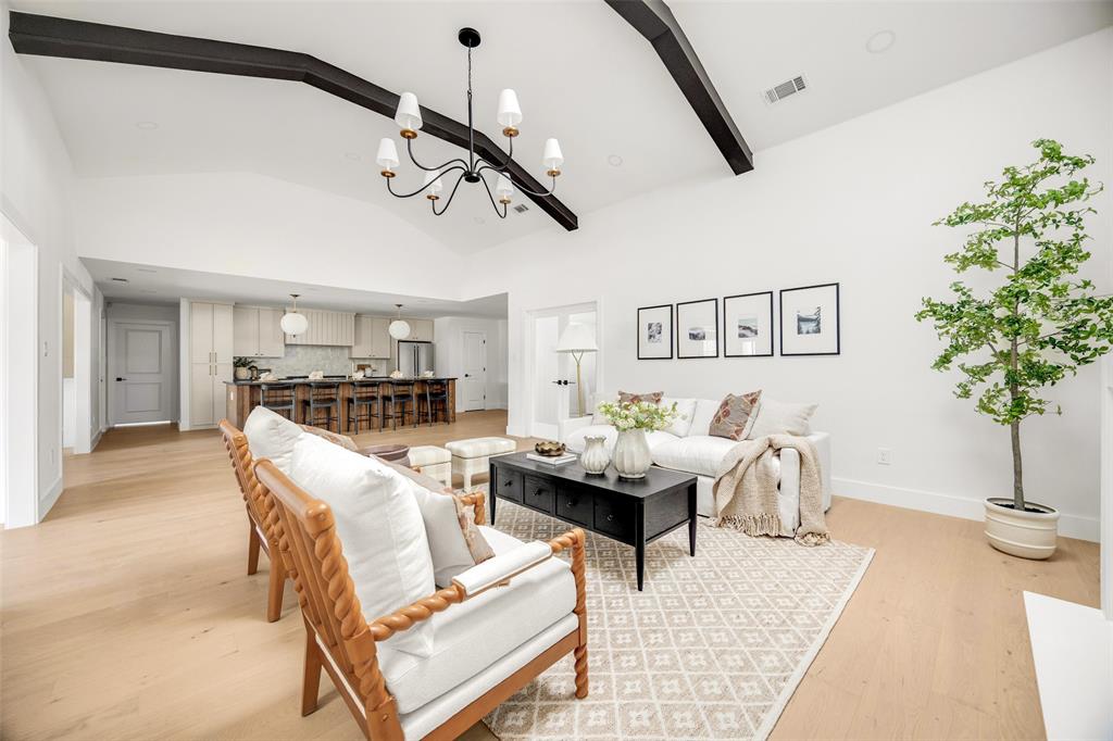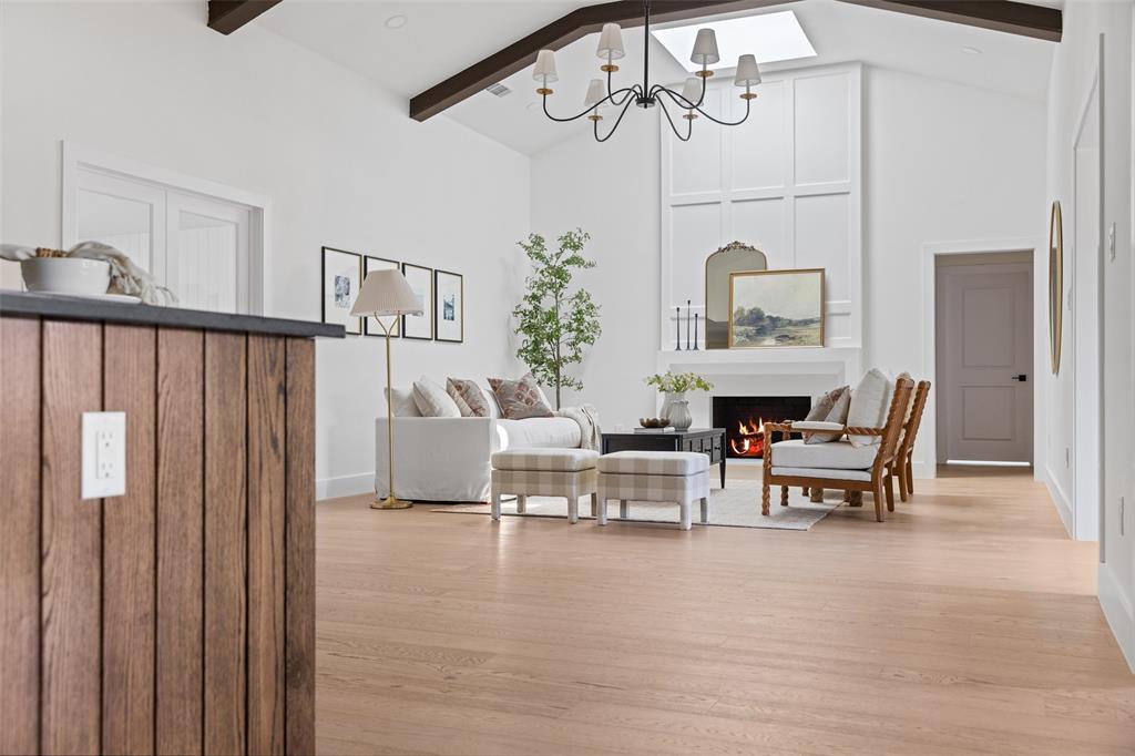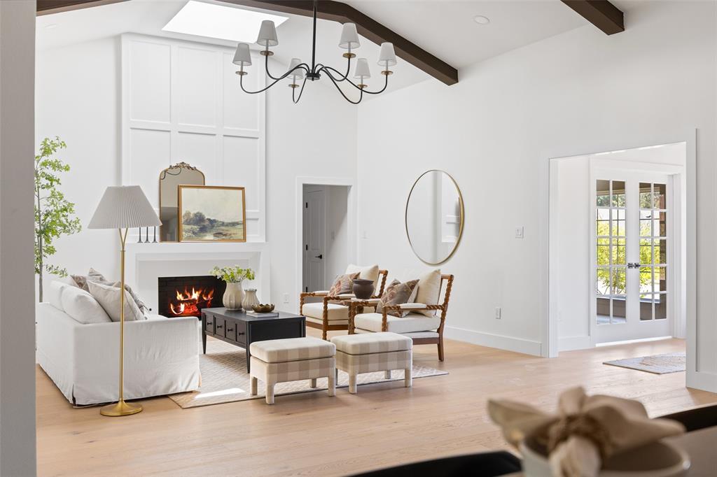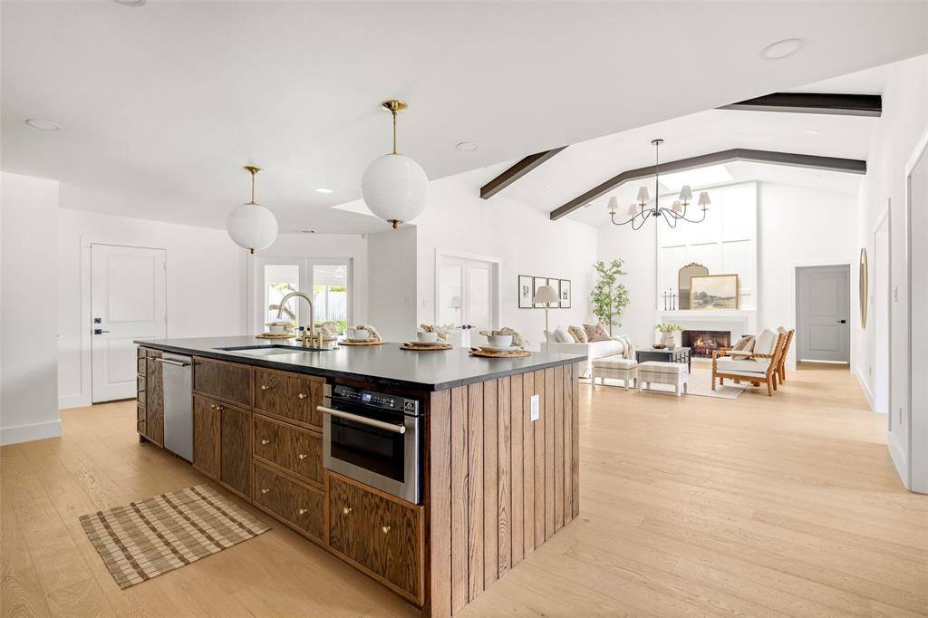 The heart of the home is an expansive, light-filled kitchen featuring a dramatic oversized island, custom cabinetry, a spacious pantry, and striking designer lighting. Flowing effortlessly into the grand living room, you'll find soaring ceilings with bespoke beam detailing and an elegant fireplace—creating the perfect setting for both refined entertaining and everyday luxury.