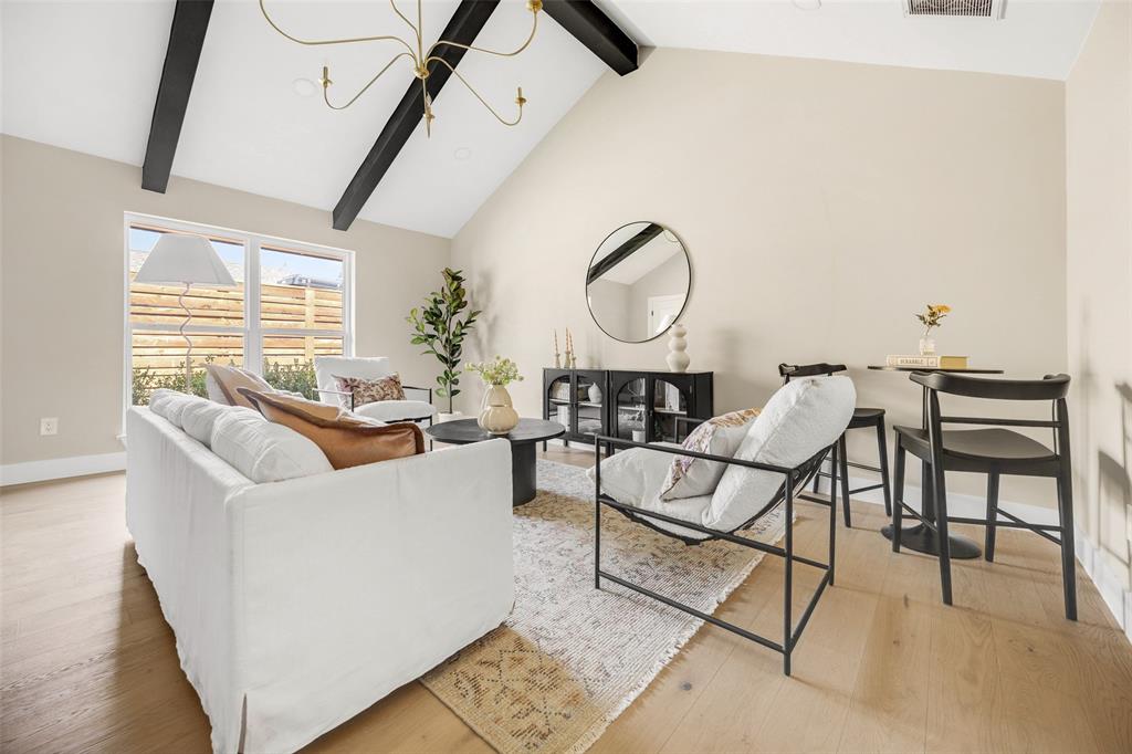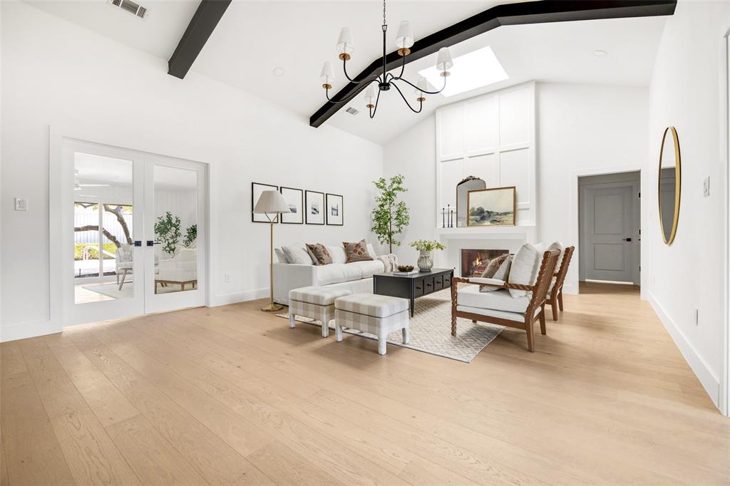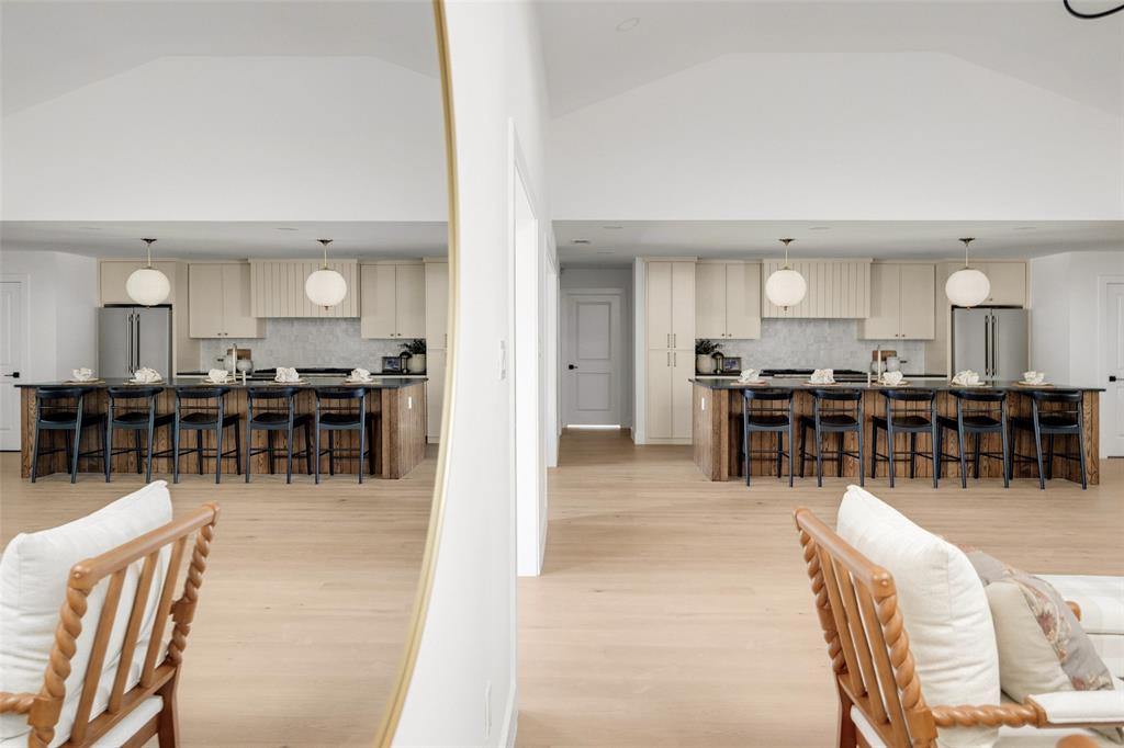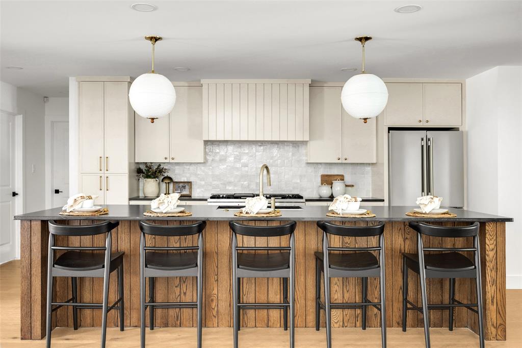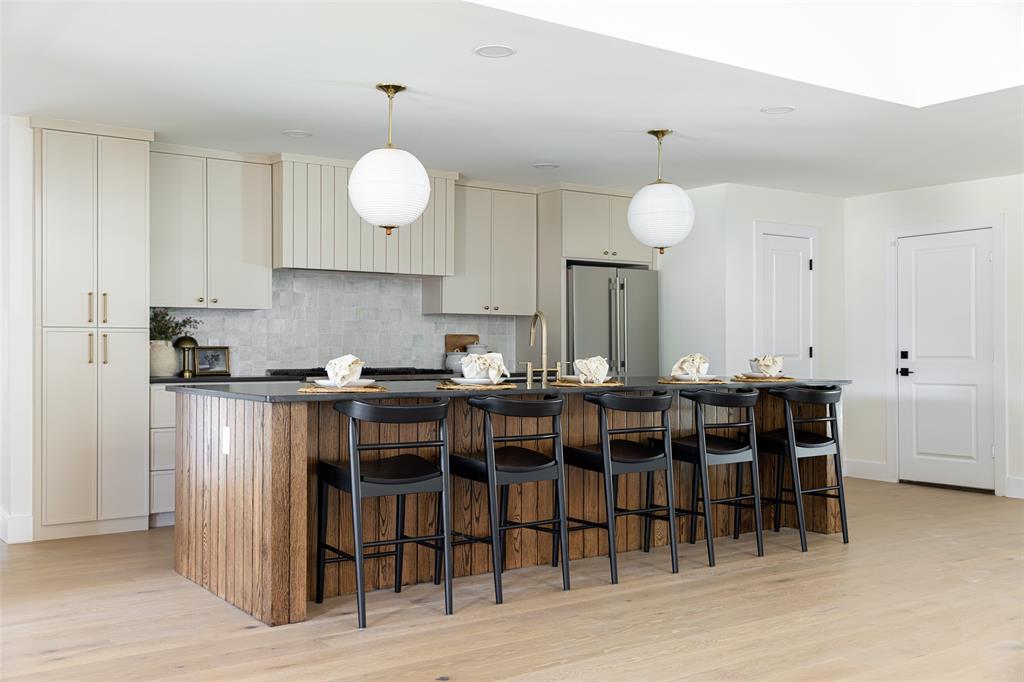 The heart of the home is an expansive, light-filled kitchen featuring a dramatic oversized island, custom cabinetry, a spacious pantry, and striking designer lighting. Flowing effortlessly into the grand living room, you'll find soaring ceilings with bespoke beam detailing and an elegant fireplace—creating the perfect setting for both refined entertaining and everyday luxury.