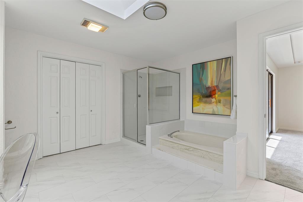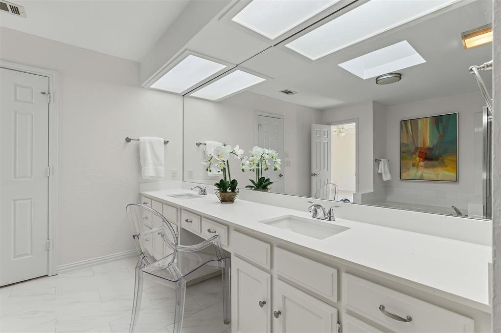 Upstairs, you’ll find two spacious ensuite bedrooms, each with generous walk-in closets and private balconies. The primary suite features a relaxing soaking tub, separate shower, dual-sink vanity and abundant storage.