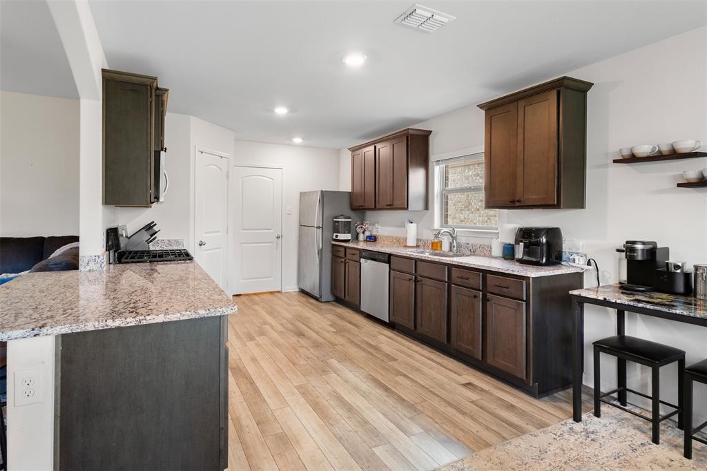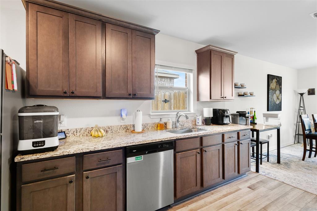 This beautiful home is like new and offers low-maintenance luxury vinyl plank flooring throughout most areas, a spacious living room, and an open kitchen with granite countertops and energy-efficient stainless steel appliances, perfectly situated next to the dining area overlooking the lush backyard. Up front, you’ll find two large split bedrooms—ideal for family or guests—providing privacy for the primary suite, which features a roomy walk-in closet and quartz vanity. A separate laundry room connects to the front-entry garage.