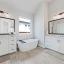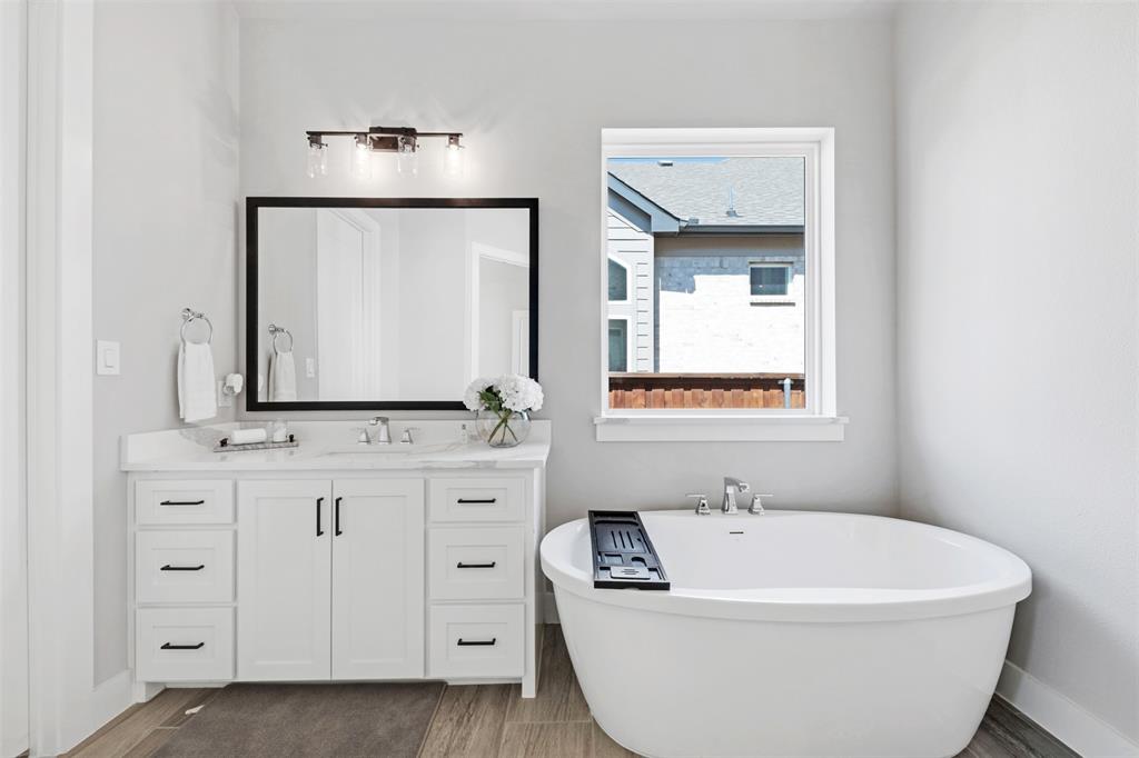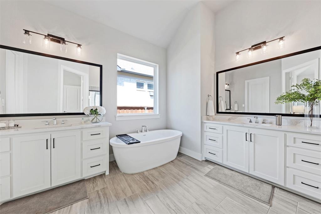 The private primary suite is a serene retreat, offering a spa-like bath with dual vanities, a soaking tub, a separate shower, and a large walk-in closet.