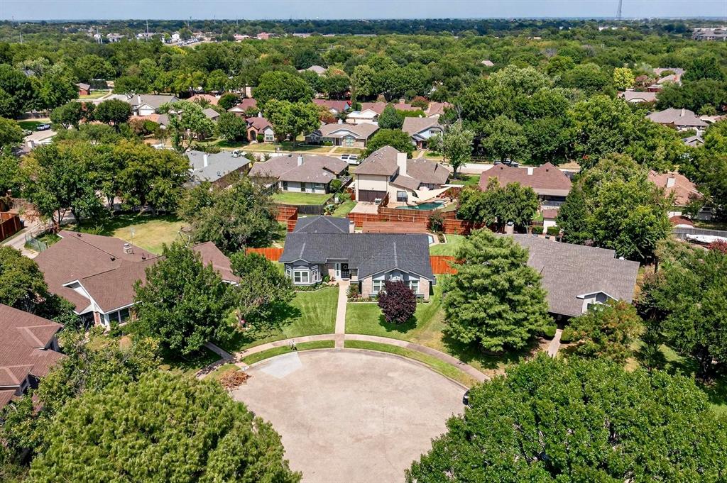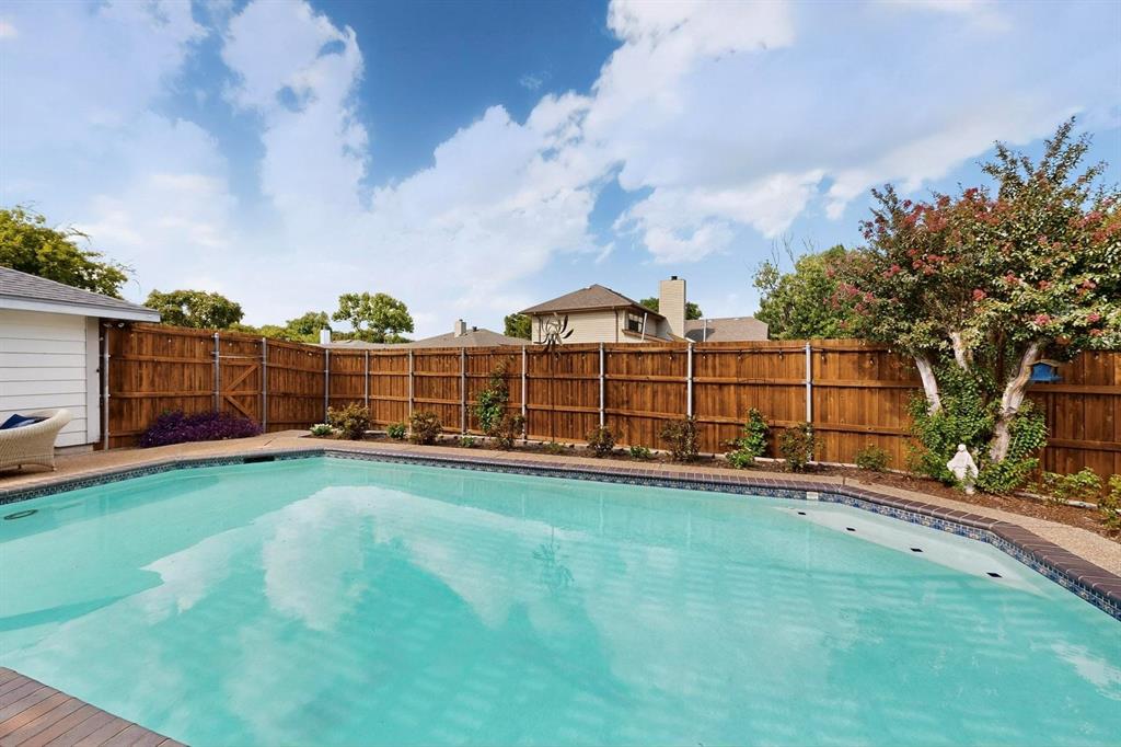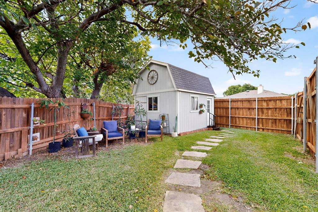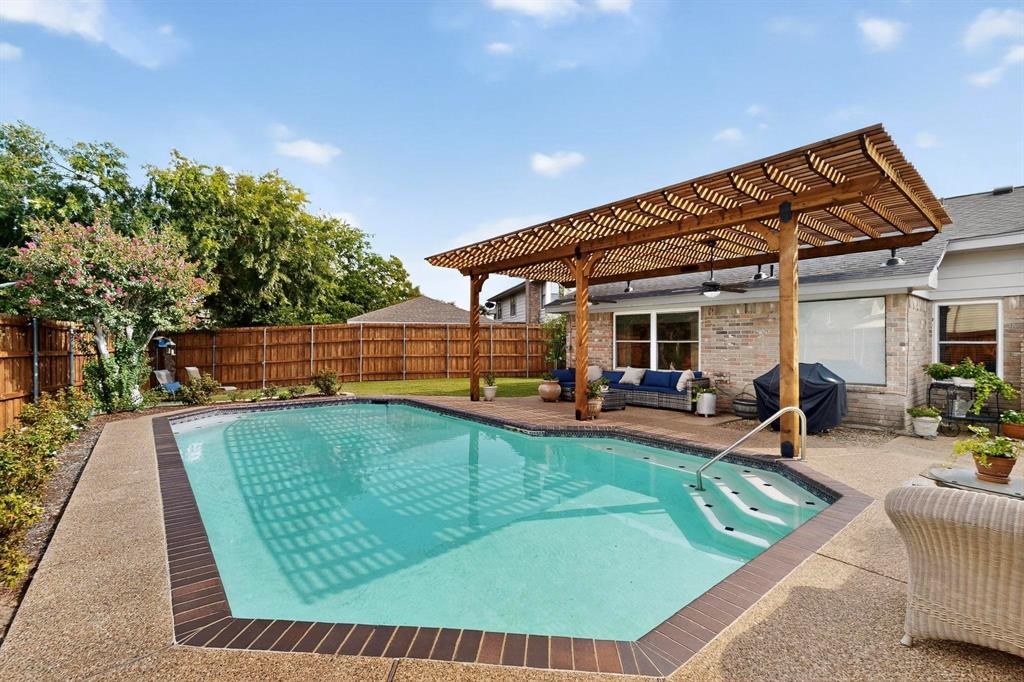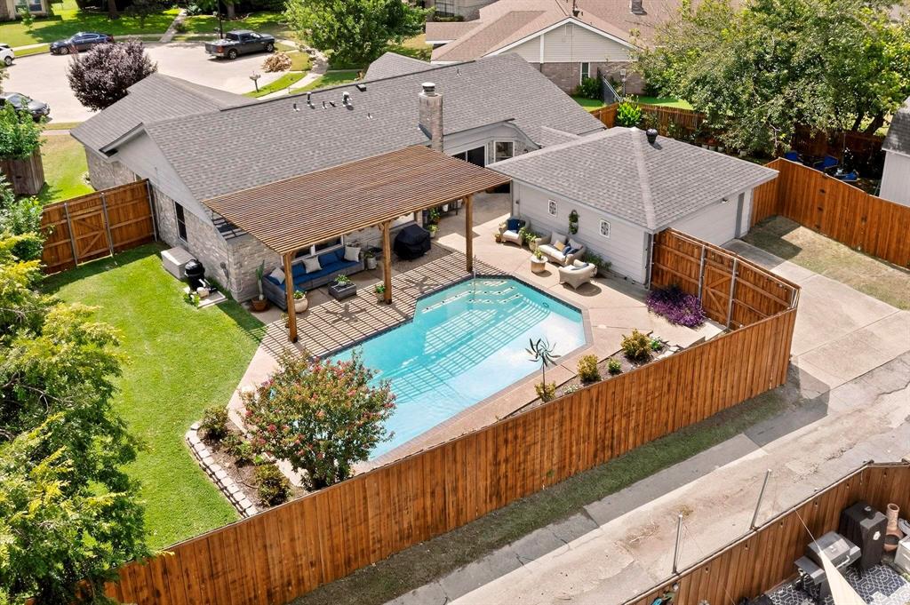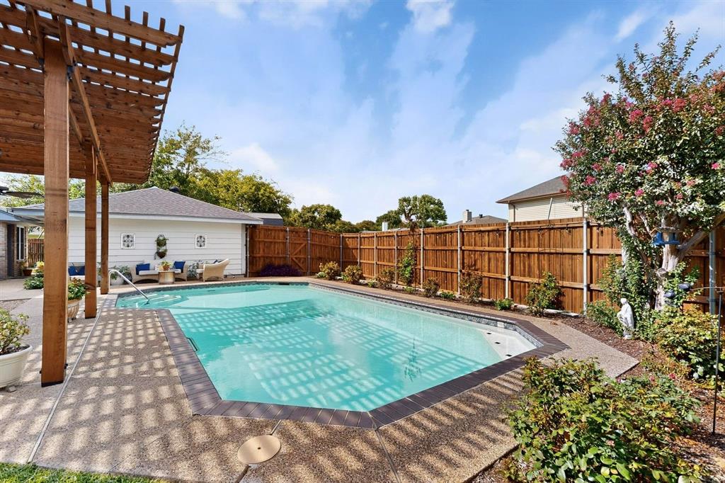 Nestled on nearly a quarter of an acre, this impressive property boasts amazing space inside and out—great curb appeal, stylish living spaces, sparkling pool & lush landscaping—perfect for relaxing & entertaining alike. PLUS a detached workshop with added storage, fully equipped with AC & electric! Stunningly updated & beautifully maintained with recent upgrades including a brand-new HVAC (2025), electrical components (2025), water heater (2024) & new lighting throughout. Step inside to a spacious layout with soaring ceilings & great natural light pouring in from every angle. Freshly repainted kitchen is equipped with a new sink + stove (late 2024) & double ovens, situated between the breakfast nook & formal dining room. Gas fireplace in living room also operates as wood-burning. The primary suite is a retreat with scenic backyard views & charming barn door entry to the ensuite complete with dual sinks, jetted tub & glass shower. Flexible office space & laundry room are both right off the primary. The sellers have created a private oasis in the backyard featuring a pergola by the pool with misting system & fans, Rainbird sprinkler system & recently replaced concrete pebble decking, enclosed by a newer wooden privacy fence (2024). Covered breezeway connects to the garage with attic storage & a second refrigerator that conveys. Fridge in kitchen, washer & dryer convey with STRONG offer. With beautiful gardens, updated systems & so many versatile spaces, don’t miss this truly move-in ready home in a great location near parks, greenbelts & top-rated Mesquite ISD schools!