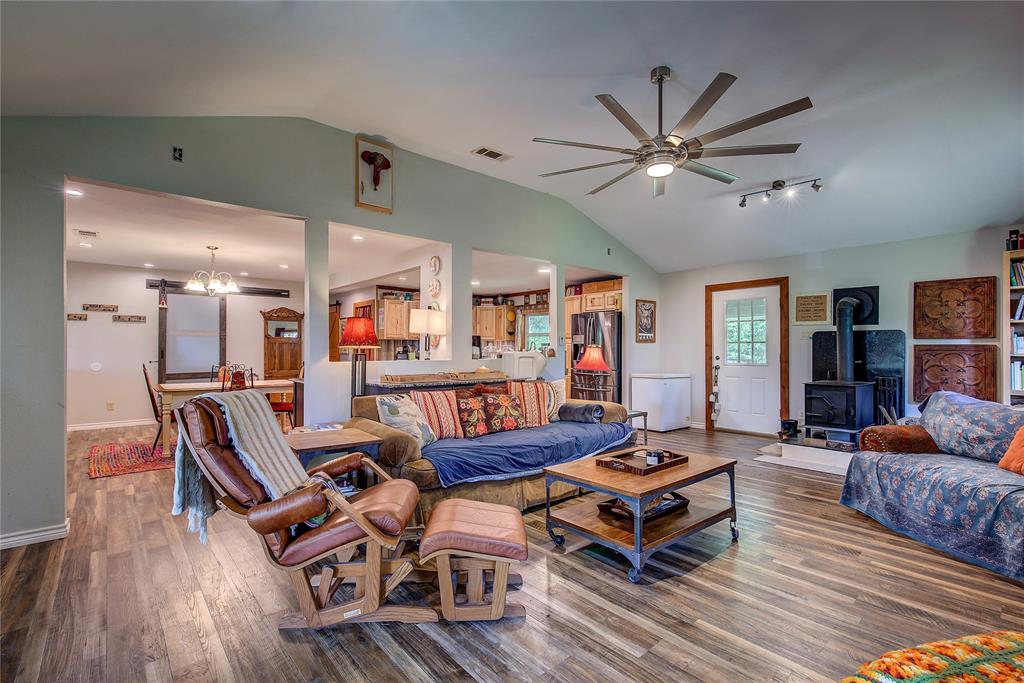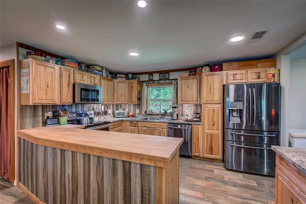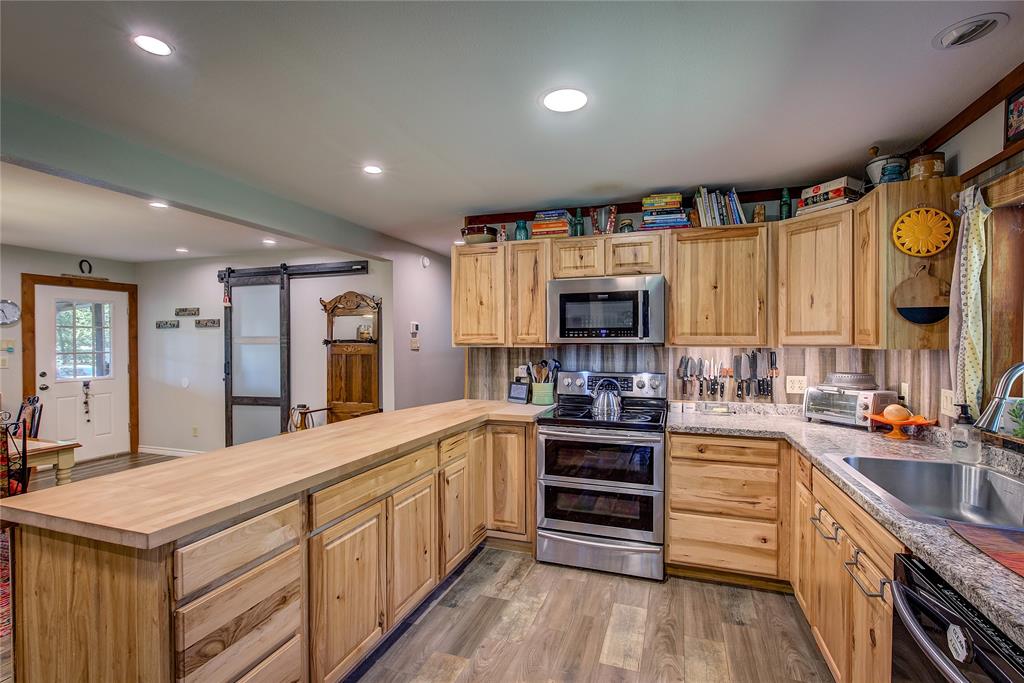 Inside, the home features a spacious living room with vaulted ceilings, abundant natural light, and a cozy wood-burning stove perfect for chilly nights. The kitchen is designed for function and charm with butcher block countertops, a large prep station, double ovens, and durable luxury vinyl plank flooring throughout.