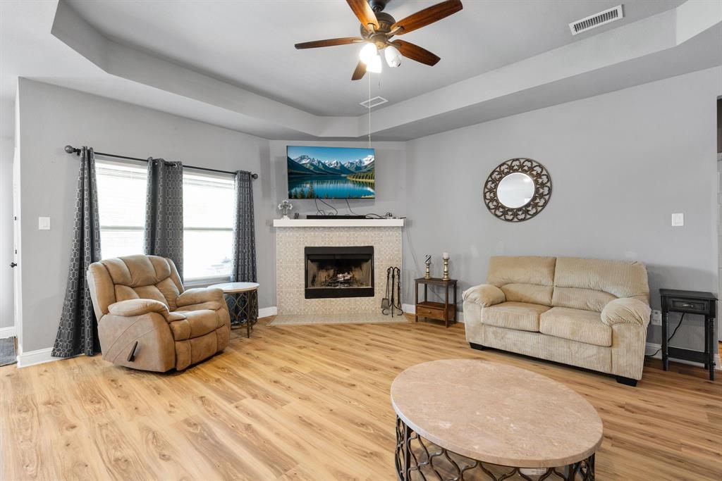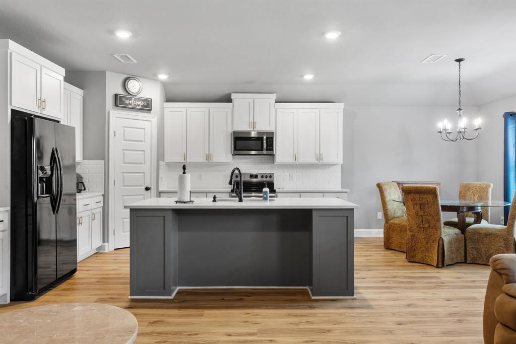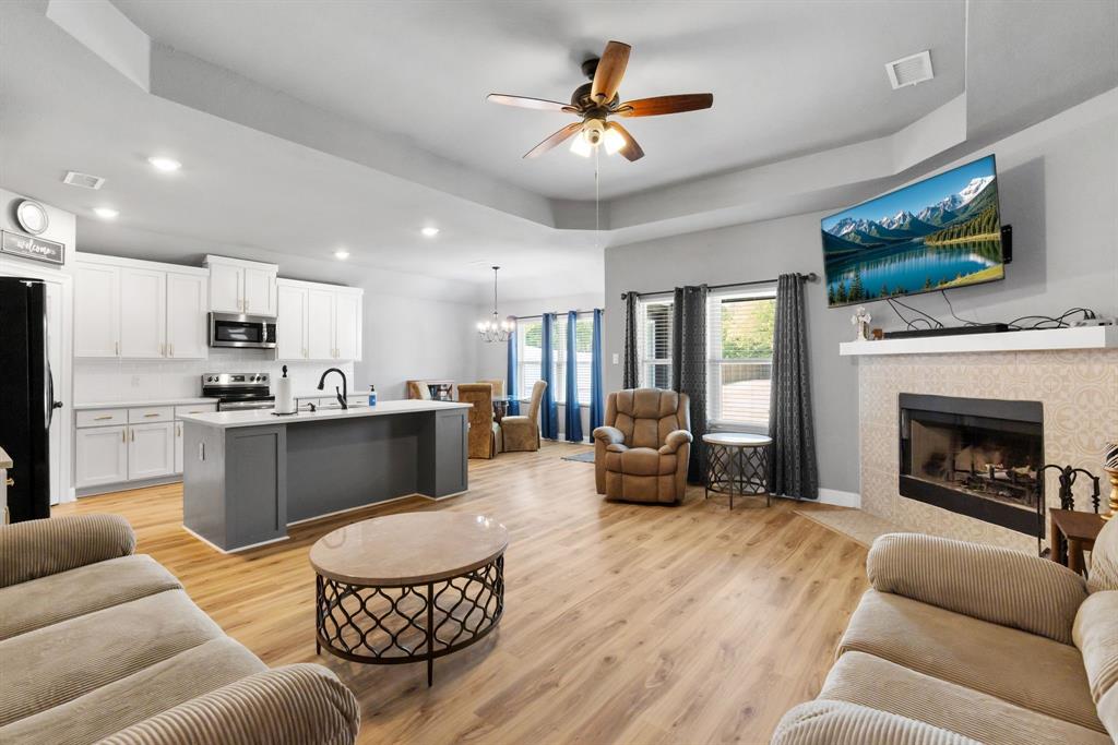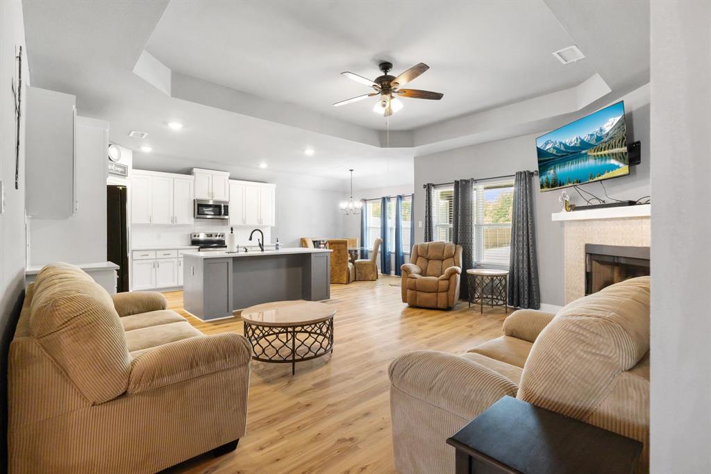 SELLER is offering $10,000 CONCESSIONS towards Buyer Closing. Welcome to your dream retreat nestled in the sought after Waters Edge neighborhood. This stunning property offers a perfect blend of comfort, style, and natural beauty, making it an ideal home for families, retirees, or anyone seeking a peaceful lifestyle. Situated in a tranquil neighborhood, this property boasts easy access to local amenities, schools, and recreational activities. Enjoy the charm of small-town living while being just a short drive from larger cities. Spanning close to 0.5 acres, this spacious lot provides ample outdoor space, and the HOA includes Private Gated Lake with access code Year Around Marina with Dock. Enjoy Lunches sitting over Lake on the Large Extended Boat Dock or Hangout on picnic tables or under Pergola! 9' Vaulted High Ceilings, 4 Full Rooms with Flex room to be used as Office-Bed-Hobby-Nursery, Split plan. Water Resistant Luxury Flooring, Tall Wood Cabinetry, Quartz Countertops with Gourmet Style Open Concept Kitchen Flow into Living, Upgraded Tiled Fireplace, and home features an open-concept layout that maximizes space and natural light. The inviting living room is perfect for family gatherings, while the modern kitchen perfect for entertaining guests. Solar screens have been added to help reduce energy costs by blocking out heat and UV rays.