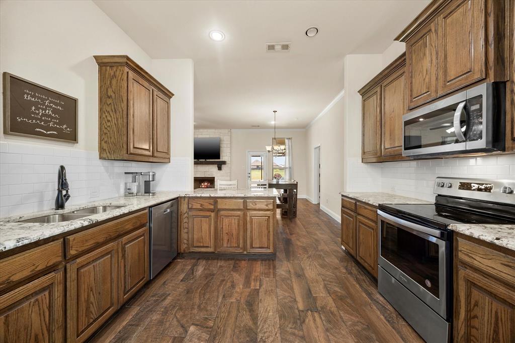 Beautiful Landscaped 3 bedroom, 2 bath, 2 car garage home on 1.09 acres. Open floor plan. Lg living area with stone fireplace & wood look tile. Kitchen boasts custom cabinets, granite countertops, & stainless appliances. Oversized primary bedroom with new carpet, double vanities, separate shower & his & her walk in closets. Secondary split bedrooms with new carpet, jack & jill bath with walk in closets. Covered back patio for entertaining. 3-year-old in ground gunite pool with 12-person hot tub and water features. Backyard completely fenced in. NO HOA. Quiet country living with city convenience.