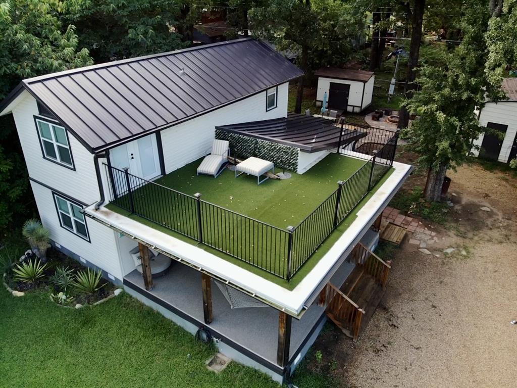 On the first floor, you will find a full bath, across from a spacious bedroom (with an expansive storage closet), & utility area with convenient access to a beautiful brand-new back deck & comforting hot tub. Back inside, ascend a custom staircase to discover a charming reading nook, full bathroom, a 2nd guest room, across from a dreamy primary bedroom featuring double door access to a breathtaking rooftop balcony. Imagine unwinding on your own rooftop terrace with candy views of Cedar Creek Lake. Among many recent updates, the installation of a Pioneer mini-split inverter system was completed in March 2025, ensuring comfort in each room year-round.