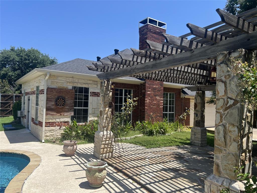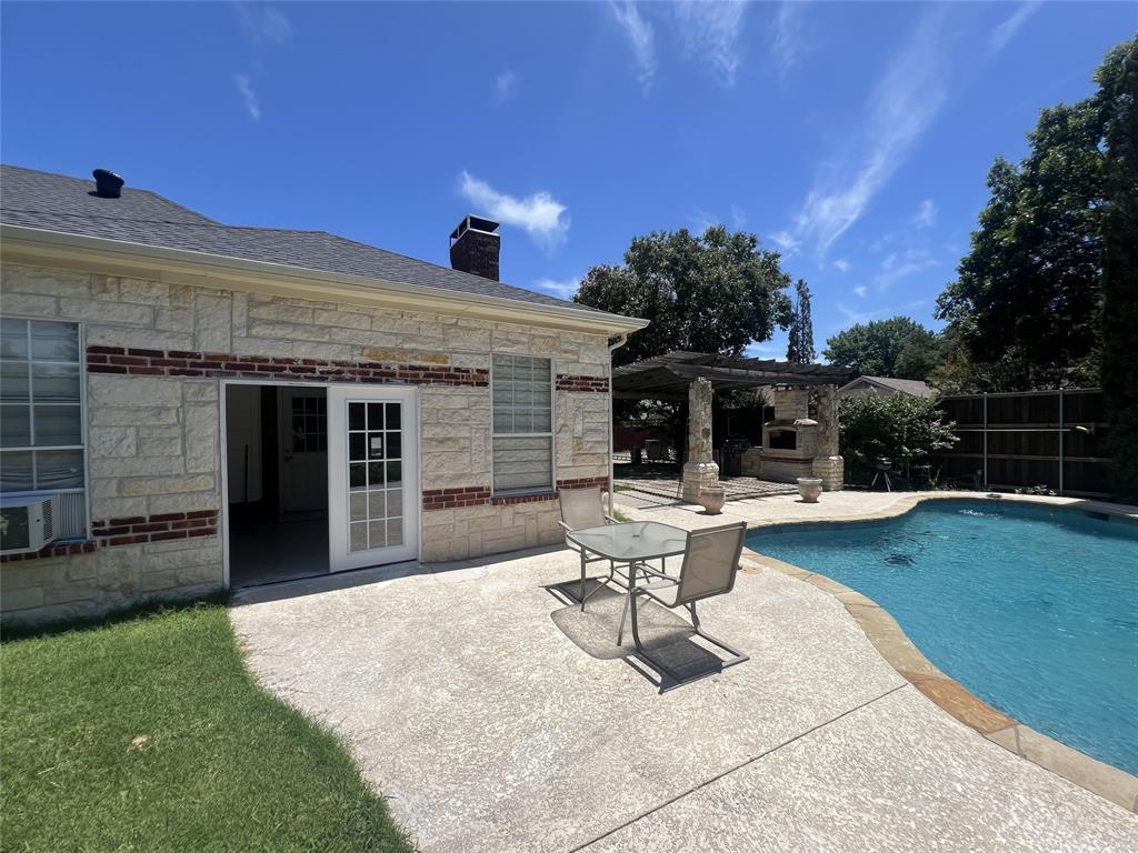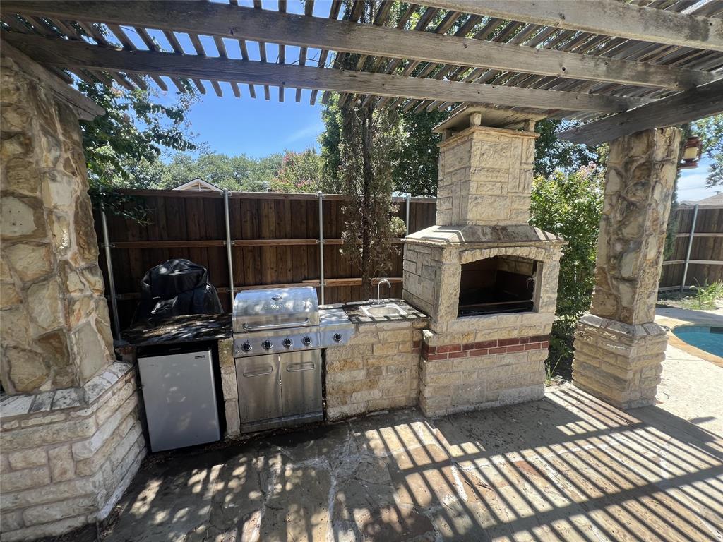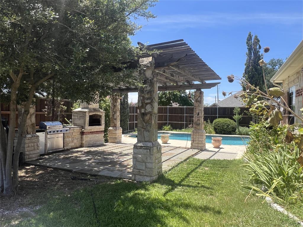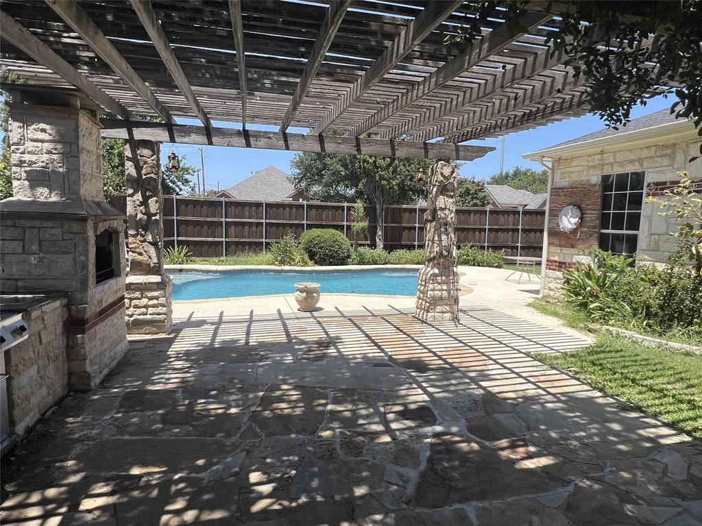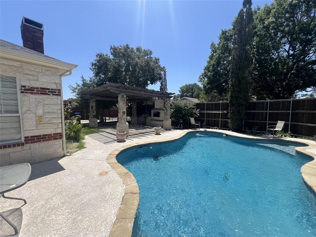 Offered for sale is a nicely updated open floorplan 4 bed, 2 bath, 2308 sf home. The home was built in 1993 and features high ceilings, loads of natural light, and a private oasis in the back yard. The inside of the home has new flooring and paint, new appliances, new fixtures, and dimmable LED lighting throughout much of the home. The master suite offers dual vanities, a large walk-in closet, a bathtub, and a travertine stand-up shower. This home has an exceptional backyard with custom pool, outdoor fireplace, built-in gas grill, sink, refrigerator, a pergola and trees for shade, and 8' board on board cedar fencing offering great privacy. There is an attached 2-car garage with driveway for additional parking, and a rolling iron gate. The home also features an enclosed stone patio and attached and enclosed outdoor storage next to the garage. The pool features LED lighting with remote control, and a Glacier pool chiller to keep the water temperature just right throughout the summer. The entire yard is tastefully landscaped and has an in-ground sprinkler system.