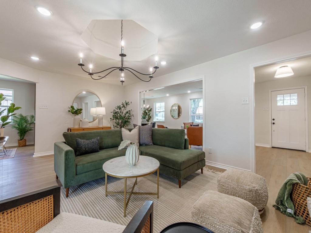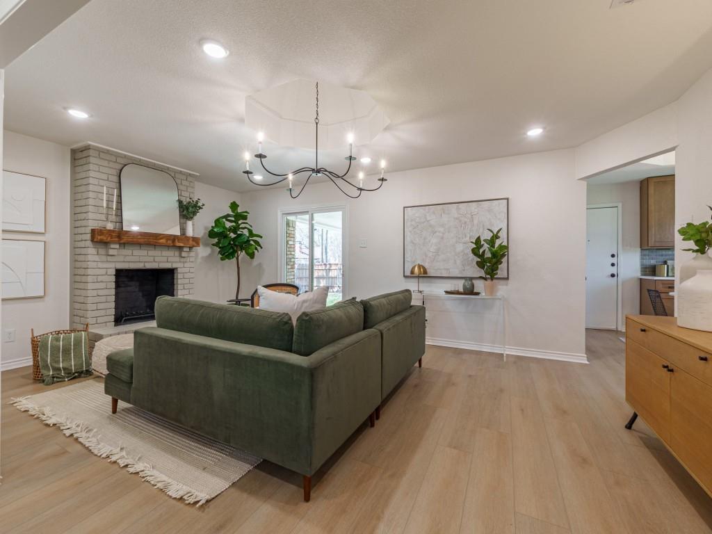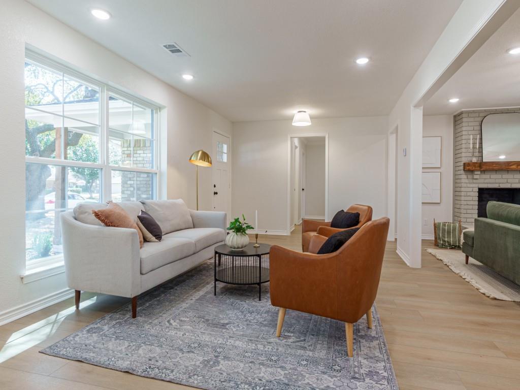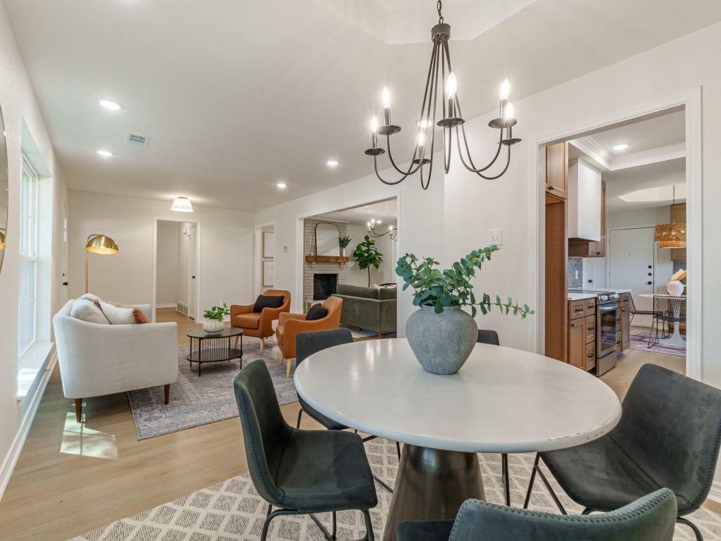 Unique home. Smart investment. Nestled beneath the embrace of two stately trees, this charming ranch-style retreat in coveted Buckner Terrace neighborhood offers a perfect blend of elegance and comfort—just minutes from the vibrant heart of downtown Dallas. Step inside to light-filled and beautifully appointed wood floors, clean architectural lines, and an inviting open-concept design simply perfect for both entertaining and relaxation. Raised ceilings throughout add to the sense of space and grandeur. The 2 living spaces blend effortlessly, anchored by a breathtaking floor-to-ceiling brick fireplace and a statement-making modern chandelier. An adjacent formal dining area overlooks both spaces, creating a seamless setting for gatherings both intimate & grand. Under yet another soaring ceiling, the kitchen is a vision of refined beauty. Sleek cabinetry, stylish countertops, and eye-catching backsplash create a stunning culinary space, while an adjacent breakfast nook offers a cozy spot for morning coffee. A well-appointed butler’s pantry adds both convenience and charm. The primary suite is a haven of tranquility, complemented by a luxurious en-suite bath featuring an exquisitely tiled walk-in shower and elegant double vanities. 2 additional bedrooms, each with plush carpeting & modern lighting, provide restful retreats, sharing a full bath adorned with contemporary finishes. Even laundry feels like a pleasure in the thoughtfully designed utility room, where custom wood cabinetry ensures ample storage and workspace. Outdoors, the covered patio invites leisurely evenings under the Texas sky—whether savoring an aperitif or envisioning a contemporary stock tank pool in the expansive backyard. A rear-facing two-car garage completes the home’s exceptional layout. Ideally located near downtown Dallas' dining and entertainment, this home offers a rare blend of timeless charm & modern sophistication.