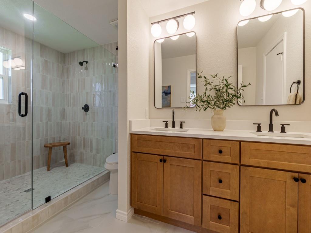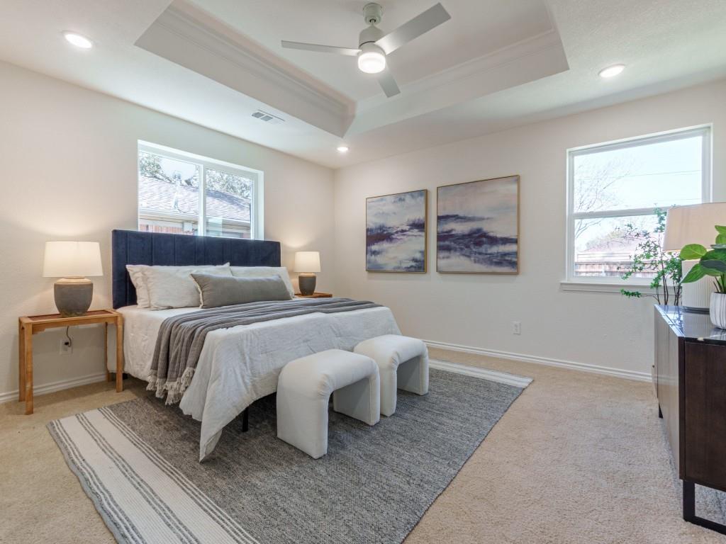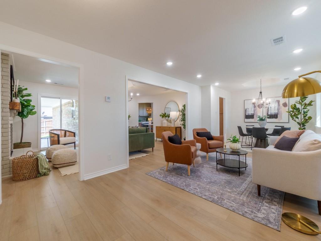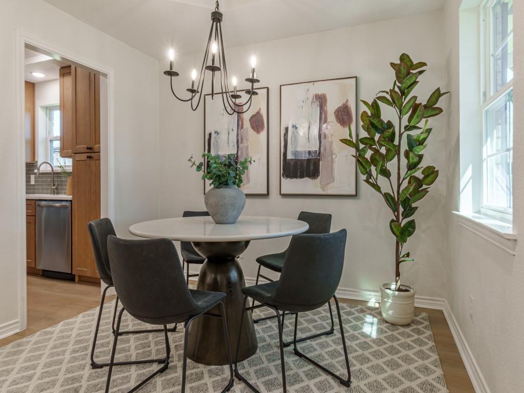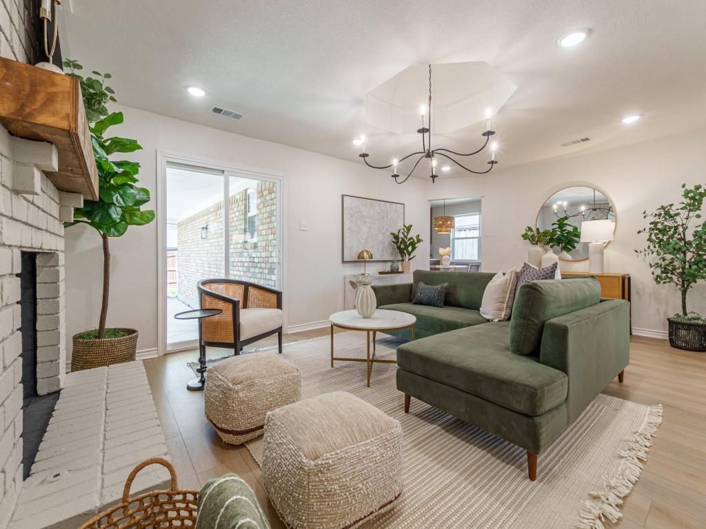 Unique home. Smart investment. Nestled beneath the embrace of two stately trees, this charming ranch-style retreat in coveted Buckner Terrace neighborhood offers a perfect blend of elegance and comfort—just minutes from the vibrant heart of downtown Dallas. Step inside to light-filled and beautifully appointed wood floors, clean architectural lines, and an inviting open-concept design simply perfect for both entertaining and relaxation. Raised ceilings throughout add to the sense of space and grandeur. The 2 living spaces blend effortlessly, anchored by a breathtaking floor-to-ceiling brick fireplace and a statement-making modern chandelier. An adjacent formal dining area overlooks both spaces, creating a seamless setting for gatherings both intimate & grand. Under yet another soaring ceiling, the kitchen is a vision of refined beauty. Sleek cabinetry, stylish countertops, and eye-catching backsplash create a stunning culinary space, while an adjacent breakfast nook offers a cozy spot for morning coffee. A well-appointed butler’s pantry adds both convenience and charm. The primary suite is a haven of tranquility, complemented by a luxurious en-suite bath featuring an exquisitely tiled walk-in shower and elegant double vanities. 2 additional bedrooms, each with plush carpeting & modern lighting, provide restful retreats, sharing a full bath adorned with contemporary finishes. Even laundry feels like a pleasure in the thoughtfully designed utility room, where custom wood cabinetry ensures ample storage and workspace. Outdoors, the covered patio invites leisurely evenings under the Texas sky—whether savoring an aperitif or envisioning a contemporary stock tank pool in the expansive backyard. A rear-facing two-car garage completes the home’s exceptional layout. Ideally located near downtown Dallas' dining and entertainment, this home offers a rare blend of timeless charm & modern sophistication.