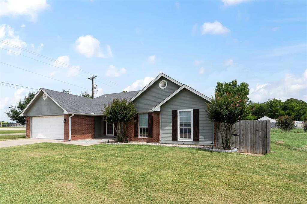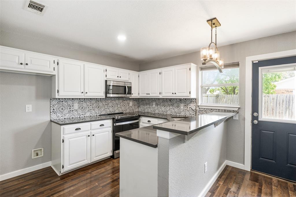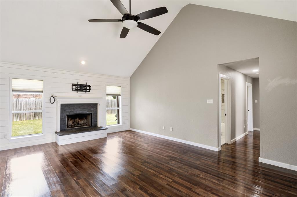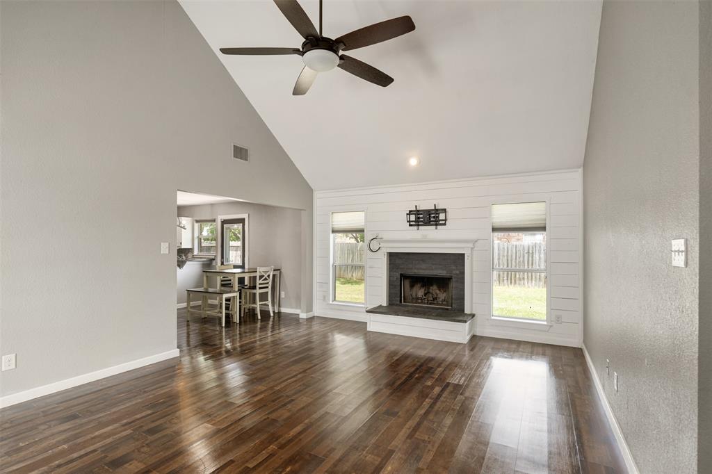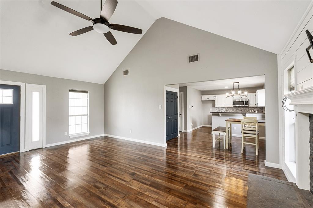 This stylishly updated 3-bedroom, 2-bathroom home that blends modern comfort with classic charm. From the moment you arrive, the curb appeal impresses with a well-maintained yard featuring lush Saint Augustine grass and a welcoming entry with covered front porch! Step inside to discover an inviting open-concept layout highlighted by rich wood vinyl flooring that flows seamlessly throughout the main living areas & all bedrooms. The spacious living room boasts soaring vaulted ceilings and a cozy wood-burning fireplace—perfect for gathering with family or entertaining guests. The kitchen features sleek granite countertops, stainless steel appliances, ample cabinetry, and a dining area!