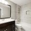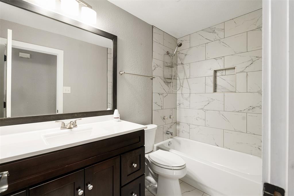 The private primary suite is a serene retreat, offering a generously sized bedroom and a luxurious en-suite bathroom with double sinks, a separate walk-in shower, and a relaxing soaking tub. Two additional bedrooms provide flexibility for guests, children, or a home office, while the second full bathroom is tastefully updated for everyday convenience.