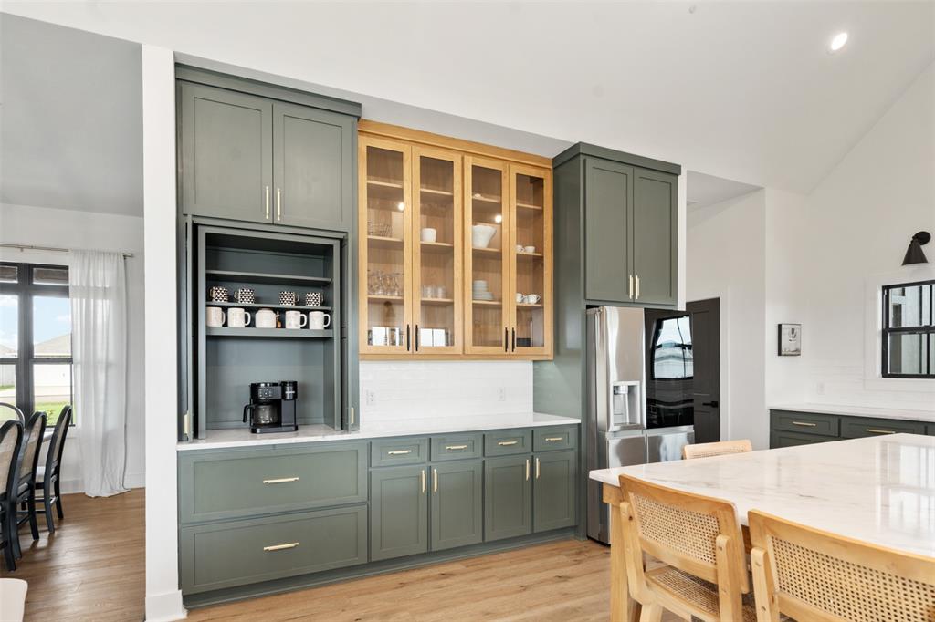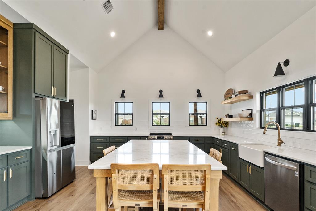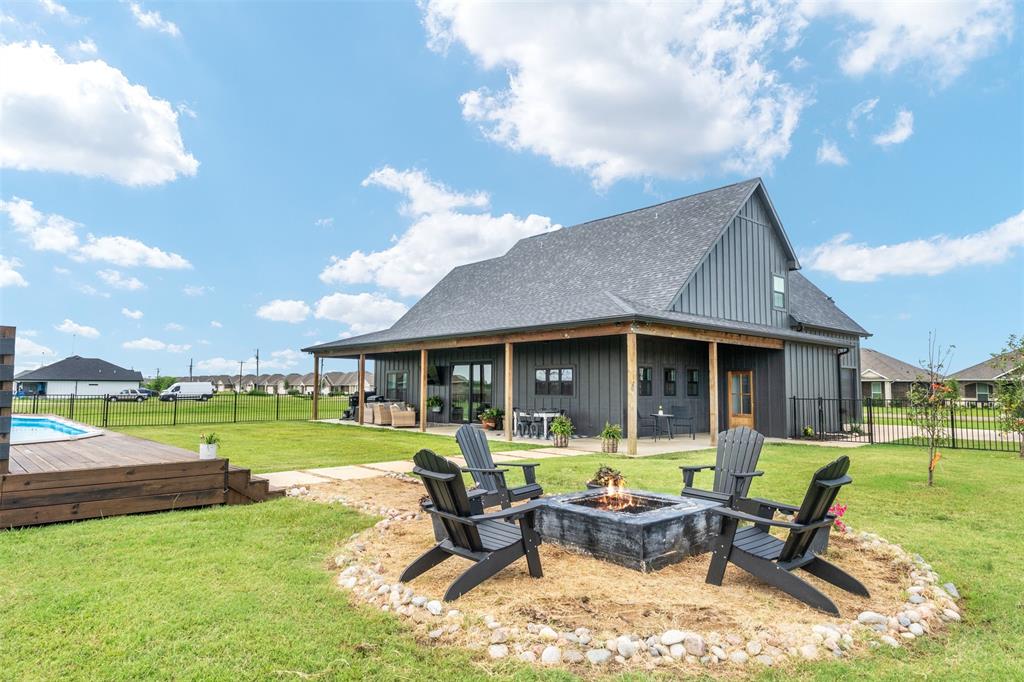 Welcome to this stunning modern farmhouse, where style meets comfort on a spacious corner lot! This beautifully designed 4-bedroom, 3-bath home offers exceptional curb appeal with its striking black exterior, stone accents, and a wide open lawn perfect for outdoor living and entertaining. Step inside to find a warm and inviting living area featuring a soaring vaulted ceiling, a floor-to-ceiling stone fireplace, and an open-concept layout that blends seamlessly with the dining space and kitchen. The gourmet kitchen is a chef’s dream, showcasing custom dark green cabinetry, sleek quartz countertops, stainless steel appliances, a farmhouse sink, and a large island with seating—ideal for gatherings and everyday living. The spacious primary suite offers a peaceful retreat with a spa-like bathroom and ample closet space. Enjoy the oversized lot with endless possibilities including an outdoor pool with beautiful deck, storage building, and a covered patio for year-round enjoyment. Don't miss your opportunity to own this one-of-a-kind property—schedule your private showing today!