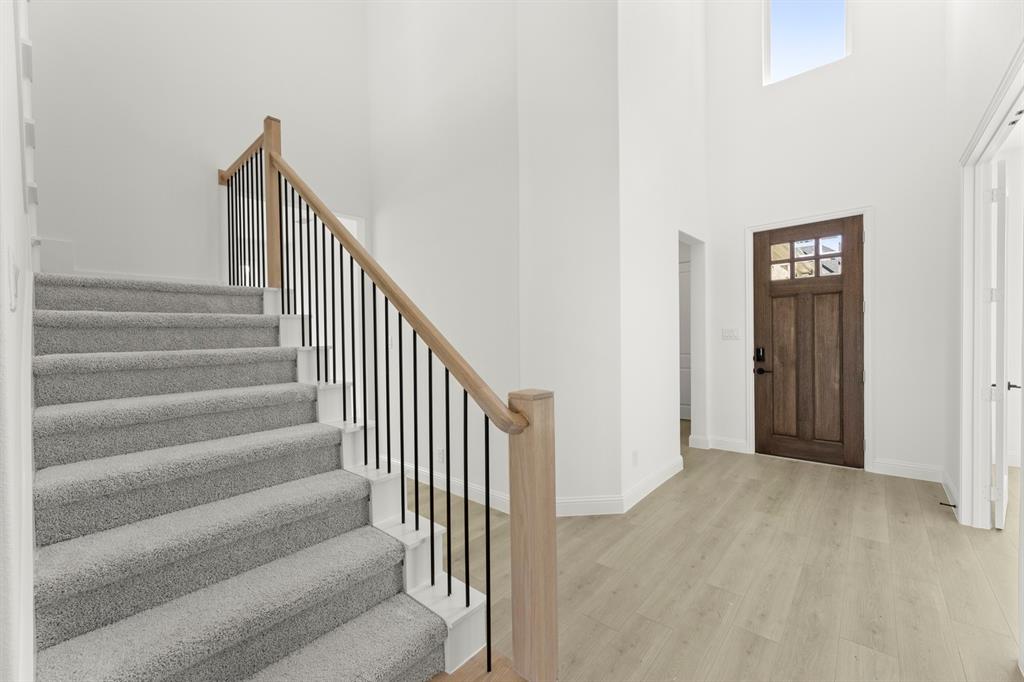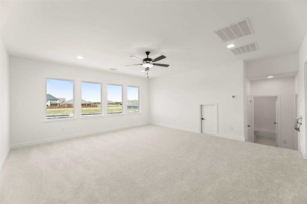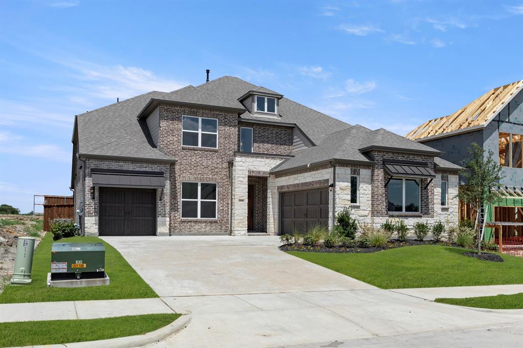 MLS# 21035499 - Built by RockWell Homes - Ready Now! ~ Picasso new home 5 bedrooms, 4.5 bathrooms, a dining room, home office, large game room, all complemented by a 3-car garage. The elegant exterior showcases a combination of brick, metal roof accents, shutters, an 8-foot front & interior doors, and covered patios, creating a striking first impression. Upon entering, the foyer with soaring ceilings leads to a versatile home office and a formal dining area, which then flows into the expansive open-concept living and kitchen space. The kitchen is a chef’s dream, boasting a large island, solid surface countertops, GE stainless steel appliances, including a built-in gas cooktop, oven, microwave, and dishwasher. Additional features include a ceramic tile backsplash, 42-inch cabinets, a custom cabinet vent hood, undermount sink, Delta faucet, walk-in pantry, upgraded flooring, recessed can lighting, and upgraded cabinets. The family room, bathed in natural light from multiple dual-pane energy-efficient windows and 12ft sliding glass back door offers views of the covered patio and backyard. The primary suite, located privately at the back of the home, includes dual vanity sinks with solid surface countertops, Delta faucets, ceramic tile flooring, a ceramic tile shower with a semi-frameless glass enclosure, a freestanding soaker tub, a linen closet, a lighting package, towel bars and huge walk-in closet. Upstairs, three additional bedrooms are served by two full bathrooms and surround an oversized game room and media room perfect for entertaining or additional living space. This home also features a fully fenced private backyard, oversized home site with room for a pool, a landscaping package, a full sprinkler system, full gutters, energy-efficient HVAC, dual-pane energy-efficient windows, upgraded flooring, a mud bench, ample storage, a ceramic tile utility room with cabinets. Quick access to I30, downtown Dallas