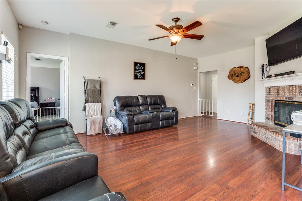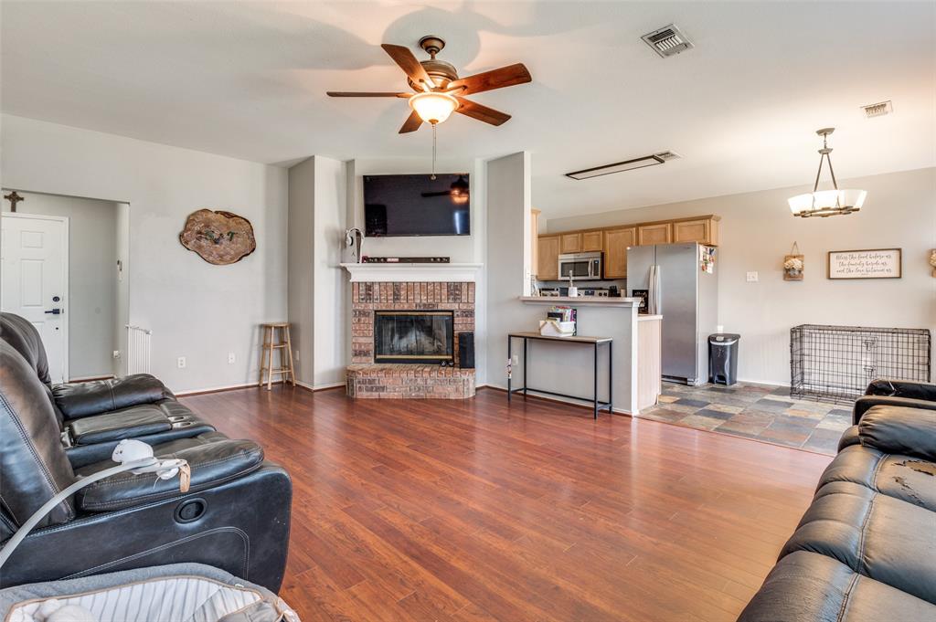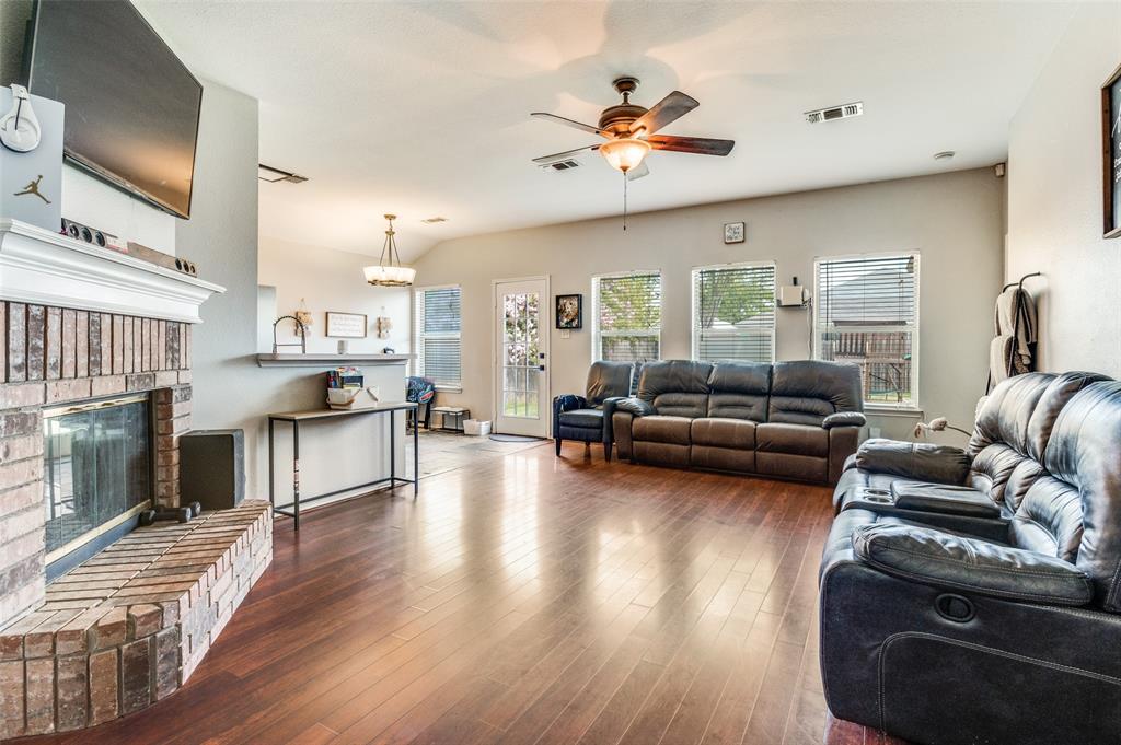 Charming Move-In Ready Home with Open Layout . Welcome to this inviting 3-bedroom, 2-bathroom home featuring a bright open floor plan that’s perfect for everyday living and entertaining. The spacious living room boasts warm wood-look flooring, a cozy brick fireplace, and plenty of natural light, seamlessly flowing into the dining and kitchen area. The kitchen is equipped with stainless steel appliances, abundant cabinet space, and a breakfast bar, making it ideal for both casual meals and gatherings. Retreat to the primary suite, complete with a private bath and ample closet space. Two additional bedrooms provide flexibility for family, guests, or a home office. Outside, you’ll love the curb appeal with a classic brick exterior, landscaped entry, and mature tree out front. The backyard offers plenty of room for entertaining, gardening, or pets. Located in a desirable neighborhood close to shopping, dining, and easy highway access — this home combines comfort, convenience, and value.