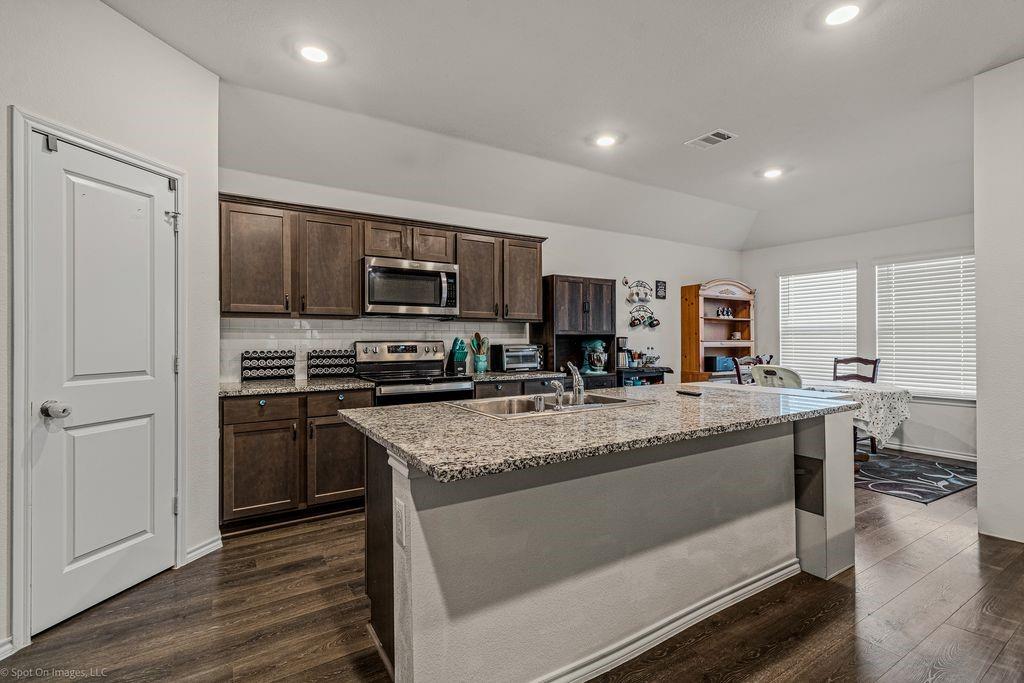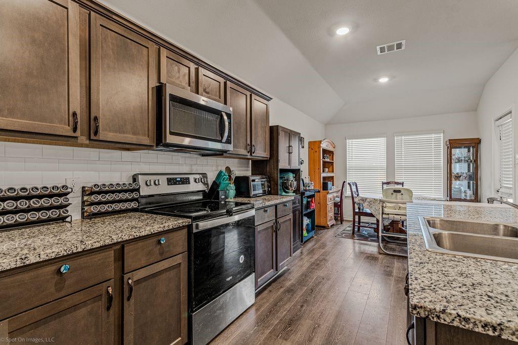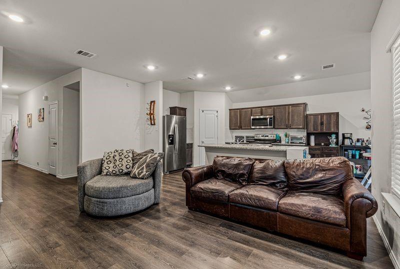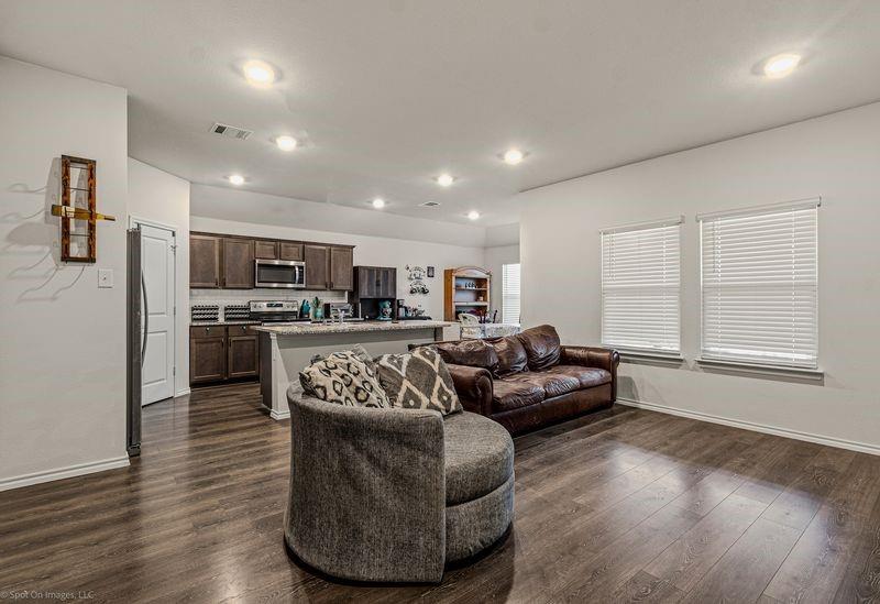 This home is priced to sell and it offers 4 bedrooms, 2baths and is very spacious and has an open concept layout featuring a good sized living room and a nice eat-in kitchen outfitted with sleek granite countertops and a wonderful island perfect for entertaining guests. This home is designed with privacy in mind as the primary suite is secluded from the guest rooms for added tranquility. The covered back patio is a great place to grill out and the back yard is a nice size and the sunsets are gorgeous from the back patio. Your new home is nestled within a few minutes walking distance to an elementary school and the neighborhood provides charming walking trails and has a serene pond. Venture outdoors to experience the idyllic neighborhood that promises peaceful strolls and enjoy swimming in the community pool on warm days. The roof was just replaced on August 9th, 2025.