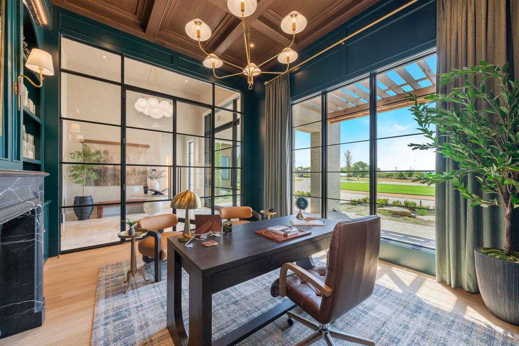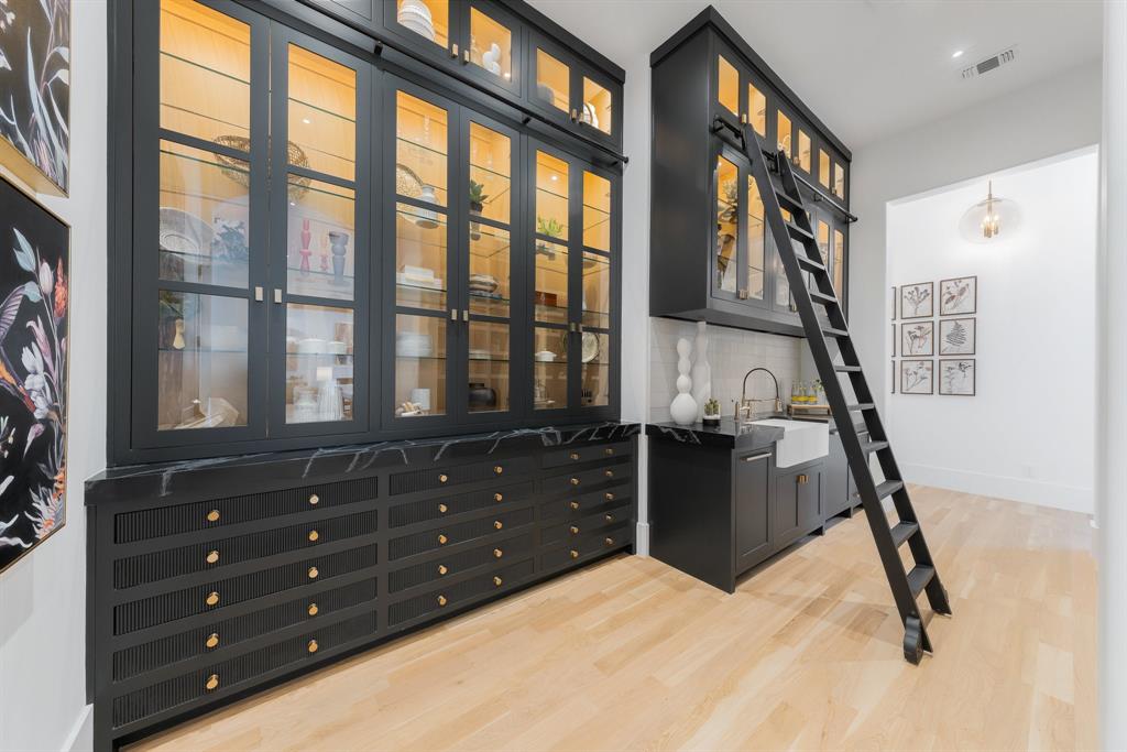 The open-concept layout seamlessly connects the great room, formal dining area, and chef’s kitchen, which boasts floor-to-ceiling cabinetry, a waterfall-edge island, and top-of-the-line appliances. A butler’s pantry adds even more function with in-cabinet refrigeration drawers, glass-front cabinets, a second dishwasher, and custom storage. Nearby, a SAFE room offers peace of mind.