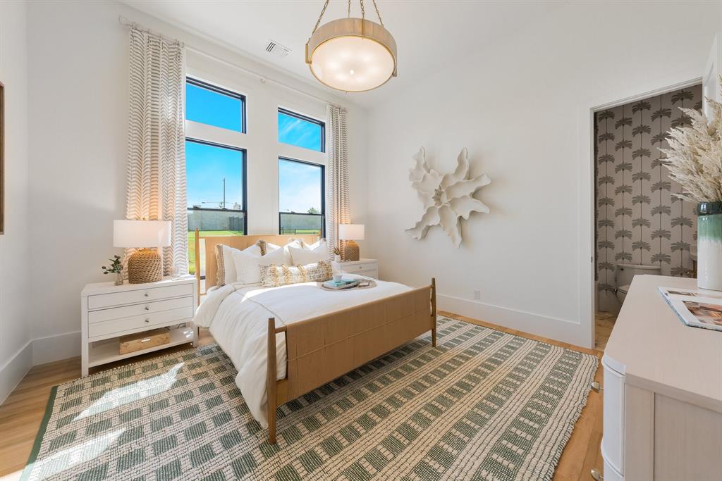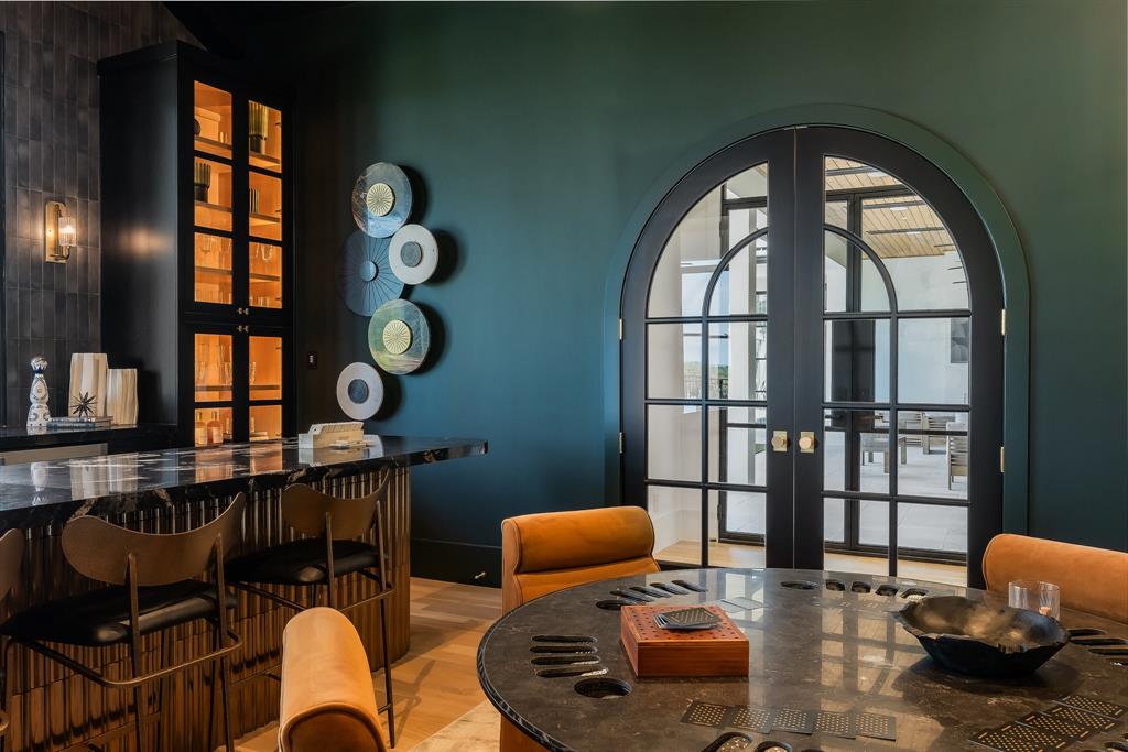 The game room at the rear of the home includes a full wet bar and a passthrough serving window to the outdoor patio—perfect for entertaining. Each of the home’s five bedrooms has its own ensuite bath and walk-in closet, while the primary suite overlooks the resort-style pool and offers dual custom closets, a spa-like walk-in shower, and a deep soaking tub.