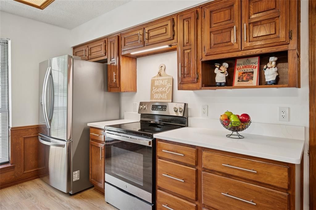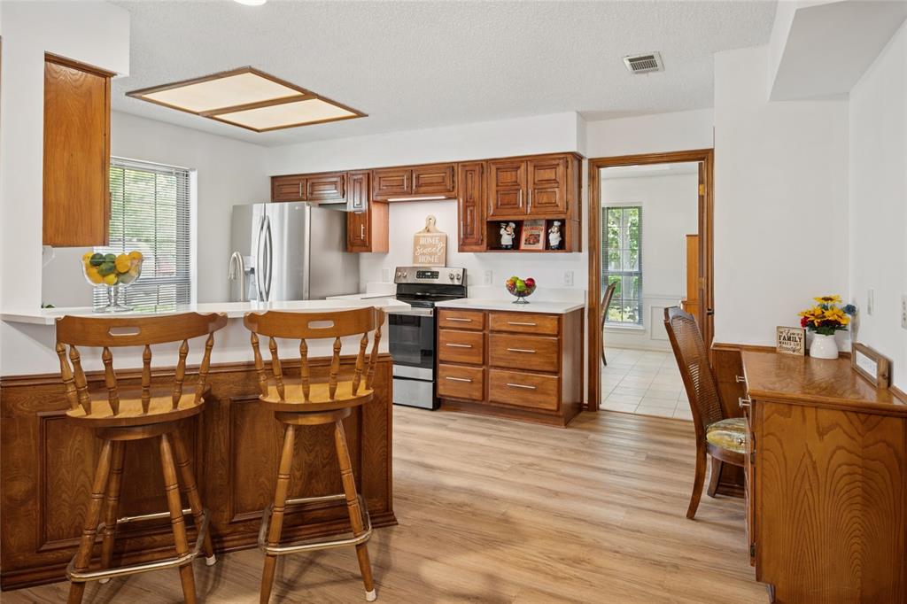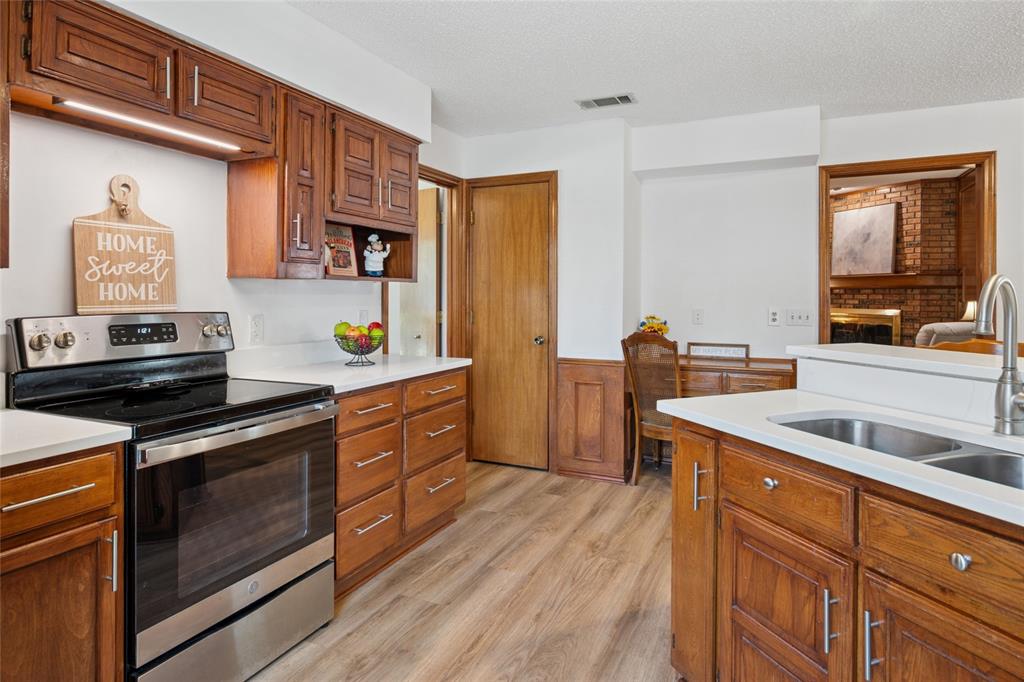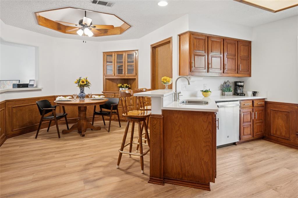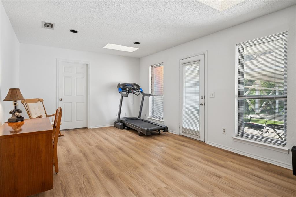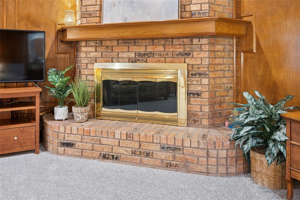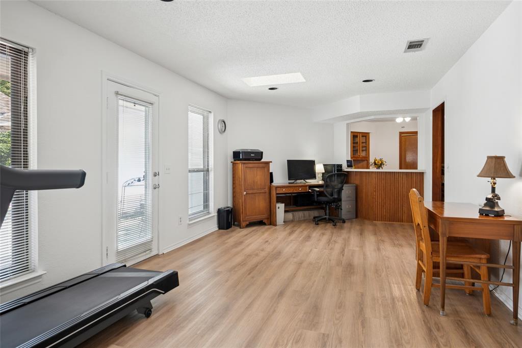 The living room features a handsome beamed ceiling and a corner wood burning fireplace with floor-to-ceiling brick, creating a warm, inviting space—perfect for cozy evenings or Monday night football. At the back of the home, a skylit bonus room offers tranquil views of the tree-lined creek. This versatile space works beautifully as a playroom, homeschool area, billiards room, hobby studio, or home based office.